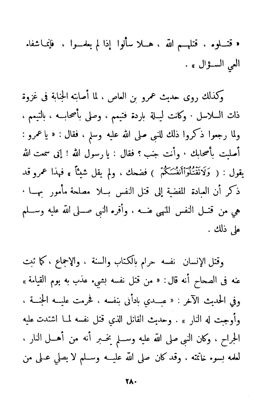 قَتَلُوهُ قَتَلَهُمْ اللَّهُ هَلَّا سَأَلُوا إذَا لَمْ يَعْلَمُوا فَإِنَّمَا شِفَاءُ الْعِيِّ السُّؤَالُ} . وَكَذَلِكَ رُوِيَ حَدِيثُ {عَمْرِو بْنِ العاص لَمَّا أَصَابَتْهُ الْجَنَابَةُ فِي غَزْوَةِ ذَاتِ السَّلَاسِلِ وَكَانَتْ لَيْلَةً بَارِدَةً فَتَيَمَّمَ وَصَلَّى بِأَصْحَابِهِ بِالتَّيَمُّمِ وَلَمَّا رَجَعُوا ذَكَرُوا ذَلِكَ لِلنَّبِيِّ صَلَّى اللَّهُ عَلَيْهِ وَسَلَّمَ فَقَالَ: يَا عَمْرُو: أَصَلَّيْت بِأَصْحَابِك وَأَنْتَ جُنُبٌ؟ فَقَالَ: يَا رَسُولَ اللَّهِ إنِّي سَمِعْت اللَّهَ يَقُولُ: {وَلَا تَقْتُلُوا أَنْفُسَكُمْ} فَضَحِكَ وَلَمْ يَقُلْ شَيْئًا} فَهَذَا عَمْرُو قَدْ ذَكَرَ أَنَّ الْعِبَادَةَ الْمُفْضِيَةَ إلَى قَتْلِ النَّفْسِ بِلَا مَصْلَحَةٍ مَأْمُورٌ بِهَا هِيَ مِنْ قَتْلِ النَّفْسِ الْمَنْهِيِّ عَنْهُ وَأَقَرَّهُ النَّبِيُّ صَلَّى اللَّهُ عَلَيْهِ وَسَلَّمَ عَلَى ذَلِكَ. وَقَتْلُ الْإِنْسَانِ نَفْسَهُ حَرَامٌ بِالْكِتَابِ وَالسُّنَّةِ وَالْإِجْمَاعِ كَمَا ثَبَتَ عَنْهُ فِي الصِّحَاحِ أَنَّهُ قَالَ: " {مَنْ قَتَلَ نَفْسَهُ بِشَيْءٍ عُذِّبَ بِهِ يَوْمَ الْقِيَامَةِ} وَفِي الْحَدِيثِ الْآخَرِ: " {عَبْدِي بَادَأَنِي بِنَفْسِهِ فَحَرَّمْت عَلَيْهِ الْجَنَّةَ وَأَوْجَبْت لَهُ النَّارَ} . وَحَدِيثُ الْقَاتِلِ الَّذِي قَتَلَ نَفْسَهُ لَمَّا اشْتَدَّتْ عَلَيْهِ الْجِرَاحُ وَكَانَ النَّبِيُّ صَلَّى اللَّهُ عَلَيْهِ وَسَلَّمَ يُخْبِرُ أَنَّهُ مِنْ أَهْلِ النَّارِ لَعَلَّهُ بِسُوءِ خَاتِمَتِهِ وَقَدْ كَانَ صَلَّى اللَّهُ عَلَيْهِ وَسَلَّمَ لَا يُصَلِّي عَلَى مَنْ