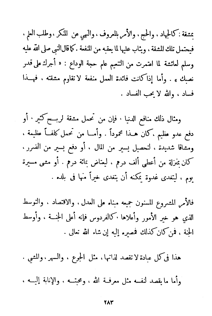 بِمَشَقَّةِ: كَالْجِهَادِ وَالْحَجِّ وَالْأَمْرِ بِالْمَعْرُوفِ وَالنَّهْيِ عَنْ الْمُنْكَرِ وَطَلَبِ الْعِلْمِ فَيَحْتَمِلُ تِلْكَ الْمَشَقَّةَ وَيُثَابُ عَلَيْهَا لِمَا يَعْقُبُهُ مِنْ الْمَنْفَعَةِ. كَمَا {قَالَ النَّبِيُّ صَلَّى اللَّهُ عَلَيْهِ وَسَلَّمَ لِعَائِشَةَ لَمَّا اعْتَمَرَتْ مِنْ التَّنْعِيمِ عَامَ حَجَّةِ الْوَدَاعِ: أَجْرُك عَلَى قَدْرِ نَصَبِك} . وَأَمَّا إذَا كَانَتْ فَائِدَةُ الْعَمَلِ مَنْفَعَةً لَا تُقَاوِمُ مَشَقَّتَهُ فَهَذَا فَسَادٌ وَاَللَّهُ لَا يُحِبُّ الْفَسَادَ. وَمِثَالُ ذَلِكَ مَنَافِعُ الدُّنْيَا فَإِنَّ مَنْ تَحَمَّلَ مَشَقَّةً لِرِبْحِ كَثِيرٍ أَوْ دَفْعِ عَدُوٍّ عَظِيمٍ كَانَ هَذَا مَحْمُودًا. وَأَمَّا مَنْ تَحَمَّلَ كُلَفًا عَظِيمَةً وَمَشَّاقًا شَدِيدَةً لِتَحْصِيلِ يَسِيرٍ مِنْ الْمَالِ أَوْ دَفْعِ يَسِيرٍ مِنْ الضَّرَرِ كَانَ بِمَنْزِلَةِ مَنْ أُعْطِيَ أَلْفَ دِرْهَمٍ لِيَعْتَاضَ بِمِائَةِ دِرْهَمٍ. أَوْ مَشَى مَسِيرَةَ يَوْمٍ لِيَتَغَدَّى غَدْوَةً يُمْكِنُهُ أَنْ يَتَغَدَّى خَيْرًا مِنْهَا فِي بَلَدِهِ. فَالْأَمْرُ الْمَشْرُوعُ الْمَسْنُونُ جَمِيعُهُ مَبْنَاهُ عَلَى الْعَدْلِ وَالِاقْتِصَادِ وَالتَّوَسُّطِ الَّذِي هُوَ خَيْرُ الْأُمُورِ وَأَعْلَاهَا كَالْفِرْدَوْسِ فَإِنَّهُ أَعْلَى الْجَنَّةِ وَأَوْسَطُ الْجَنَّةِ فَمَنْ كَانَ كَذَلِكَ فَمَصِيرُهُ إلَيْهِ إنْ شَاءَ اللَّهُ تَعَالَى. هَذَا فِي كُلِّ عِبَادَةٍ لَا تُقْصَدُ لِذَاتِهَا مِثْلِ الْجُوعِ وَالسَّهَرِ وَالْمَشْيِ. وَأَمَّا مَا يُقْصَدُ لِنَفْسِهِ مِثْلُ مَعْرِفَةِ اللَّهِ وَمَحَبَّتِهِ وَالْإِنَابَةِ إلَيْهِ