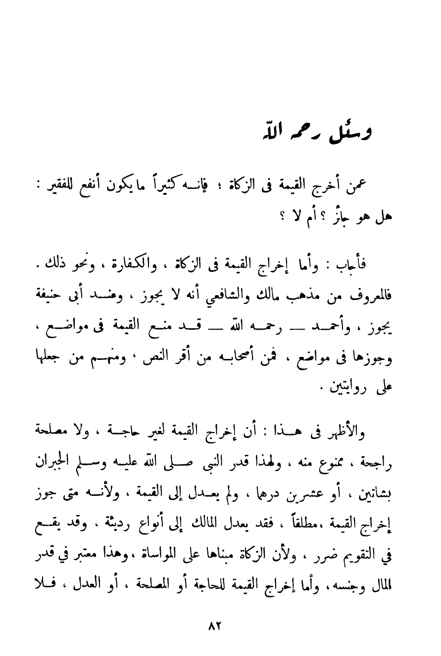 وَأَمَّا إخْرَاجُ الْقِيمَةِ فِي الزَّكَاةِ وَالْكَفَّارَةِ وَنَحْوِ ذَلِكَ. فَالْمَعْرُوفُ مِنْ مَذْهَبِ مَالِكٌ وَالشَّافِعِيِّ أَنَّهُ لَا يَجُوزُ وَعِنْدَ أَبِي حَنِيفَةَ يَجُوزُ وَأَحْمَد - رَحِمَهُ اللَّهُ - قَدْ مَنَعَ الْقِيمَةَ فِي مَوَاضِعَ وَجَوَّزَهَا فِي مَوَاضِعَ فَمِنْ أَصْحَابِهِ مَنْ أَقَرَّ النَّصَّ وَمِنْهُمْ مَنْ جَعَلَهَا عَلَى رِوَايَتَيْنِ. وَالْأَظْهَرُ فِي هَذَا: أَنَّ إخْرَاجَ الْقِيمَةِ لِغَيْرِ حَاجَةٍ وَلَا مَصْلَحَةٍ رَاجِحَةٍ مَمْنُوعٌ مِنْهُ وَلِهَذَا قَدَّرَ النَّبِيُّ صَلَّى اللَّهُ عَلَيْهِ وَسَلَّمَ الْجُبْرَانَ بِشَاتَيْنِ أَوْ عِشْرِينَ دِرْهَمًا وَلَمْ يَعْدِلْ إلَى الْقِيمَةِ وَلِأَنَّهُ مَتَى جَوَّزَ إخْرَاجَ الْقِيمَةِ مُطْلَقًا فَقَدْ يَعْدِلُ الْمَالِكُ إلَى أَنْوَاعٍ رَدِيئَةٍ وَقَدْ يَقَعُ فِي التَّقْوِيمِ ضَرَرٌ وَلِأَنَّ الزَّكَاةَ مَبْنَاهَا عَلَى الْمُوَاسَاةِ وَهَذَا مُعْتَبَرٌ فِي قَدْرِ الْمَالِ وَجِنْسِهِ وَأَمَّا إخْرَاجُ الْقِيمَةِ لِلْحَاجَةِ أَوْ الْمَصْلَحَةِ أَوْ الْعَدْلِ فَلَا