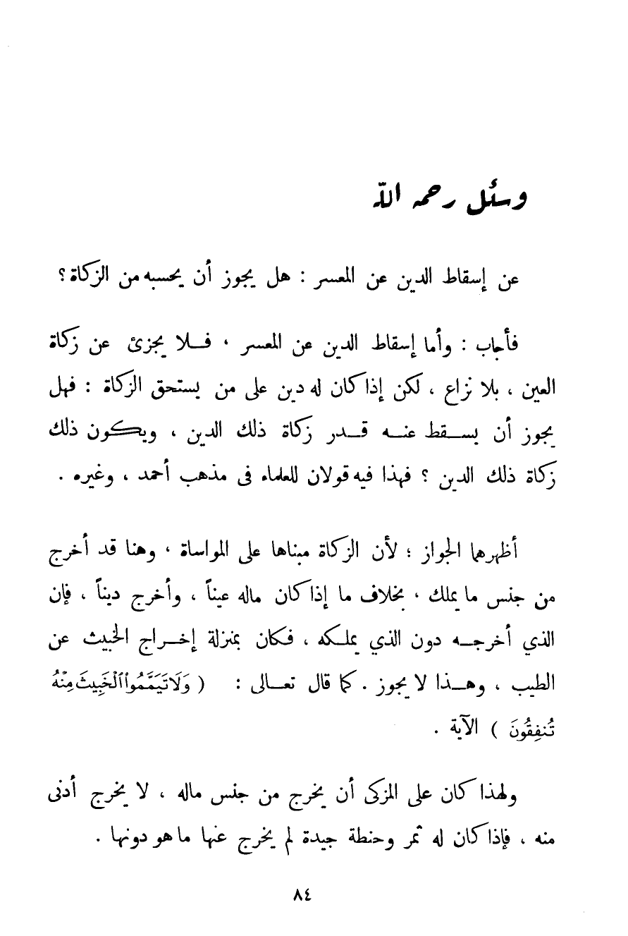 وَأَمَّا إسْقَاطُ الدَّيْنِ عَنْ الْمُعْسِرِ فَلَا يُجْزِئُ عَنْ زَكَاةِ الْعَيْنِ بِلَا نِزَاعٍ لَكِنْ إذَا كَانَ لَهُ دَيْنٌ عَلَى مَنْ يَسْتَحِقُّ الزَّكَاةَ: فَهَلْ يَجُوزُ أَنْ يُسْقِطَ عَنْهُ قِدْرَ زَكَاةِ ذَلِكَ الدَّيْنِ وَيَكُونُ ذَلِكَ زَكَاةَ ذَلِكَ الدَّيْنِ؟ فَهَذَا فِيهِ قَوْلَانِ لِلْعُلَمَاءِ فِي مَذْهَبِ أَحْمَد وَغَيْرِهِ. أَظْهَرُهُمَا الْجَوَازُ؛ لِأَنَّ الزَّكَاةَ مَبْنَاهَا عَلَى الْمُوَاسَاةِ وَهُنَا قَدْ أَخْرَجَ مِنْ جِنْسِ مَا يَمْلِكُ بِخِلَافِ مَا إذَا كَانَ مَالُهُ عَيْنًا وَأَخْرَجَ دَيْنًا فَإِنَّ الَّذِي أَخْرَجَهُ دُونَ الَّذِي يَمْلِكُهُ فَكَانَ بِمَنْزِلَةِ إخْرَاجِ الْخَبِيثِ عَنْ الطِّيبِ وَهَذَا لَا يَجُوزُ. كَمَا قَالَ تَعَالَى: {وَلَا تَيَمَّمُوا الْخَبِيثَ مِنْهُ تُنْفِقُونَ} الْآيَةَ. وَلِهَذَا كَانَ عَلَى الْمُزَكِّي أَنْ يُخْرِجَ مِنْ جِنْسِ مَالِهِ لَا يُخْرِجُ أَدْنَى مِنْهُ فَإِذَا كَانَ لَهُ ثَمَرٌ وَحِنْطَةٌ جَيِّدَةٌ لَمْ يُخْرِجْ عَنْهَا مَا هُوَ دُونَهَا.