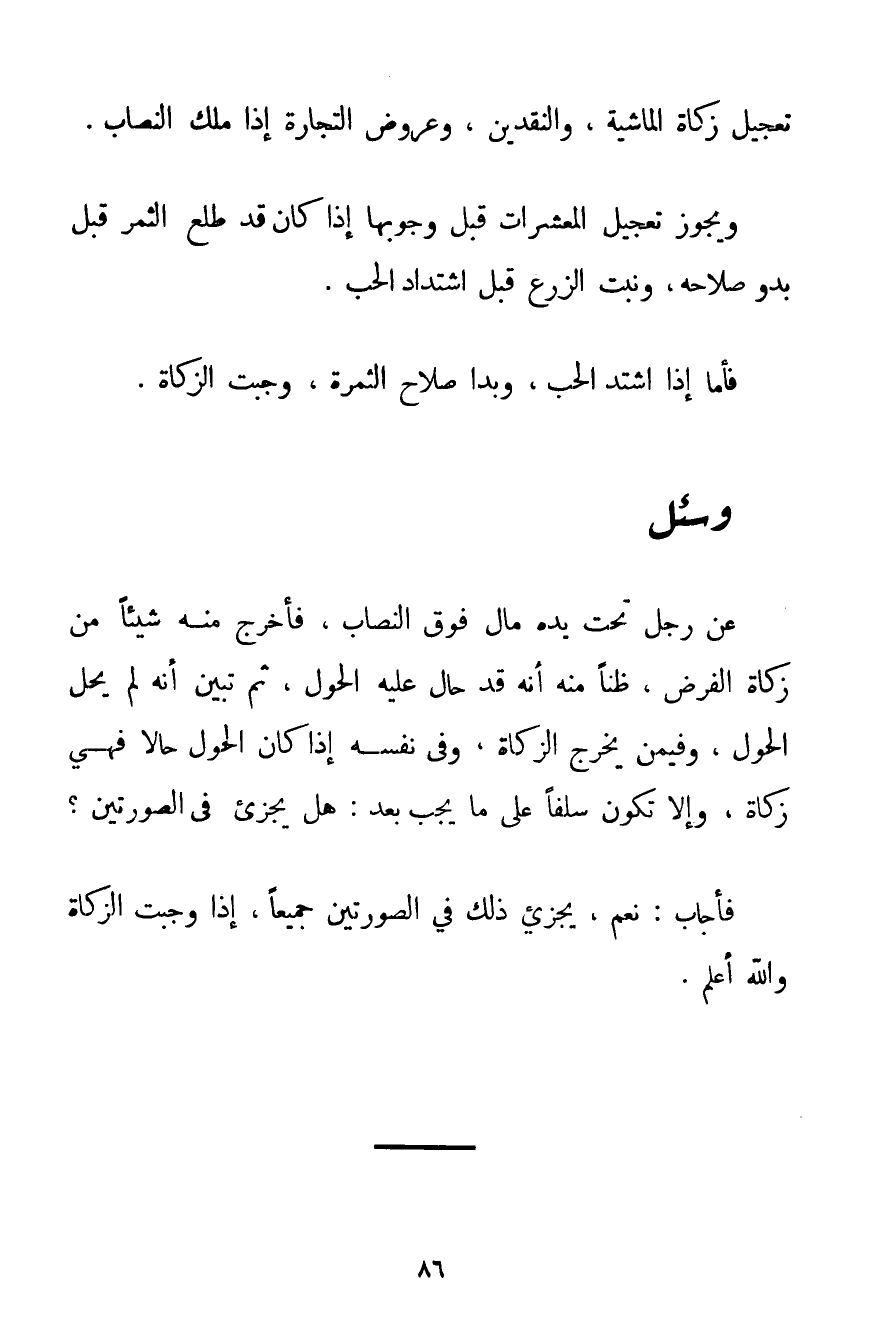 تَعْجِيلُ زَكَاةِ الْمَاشِيَةِ وَالنَّقْدَيْنِ وَعُرُوضِ التِّجَارَةِ إذَا مَلَكَ النِّصَابَ. وَيَجُوزُ تَعْجِيلُ الْمُعَشَّرَاتِ قَبْلَ وُجُوبِهَا إذَا كَانَ قَدْ طَلَعَ الثَّمَرُ قَبْلَ بُدُوِّ صَلَاحِهِ وَنَبَتَ الزَّرْعُ قَبْلَ اشْتِدَادِ الْحَبِّ. فَأَمَّا إذَا اشْتَدَّ الْحَبُّ وَبَدَا صَلَاحُ الثَّمَرَةِ وَجَبَتْ الزَّكَاةُ.