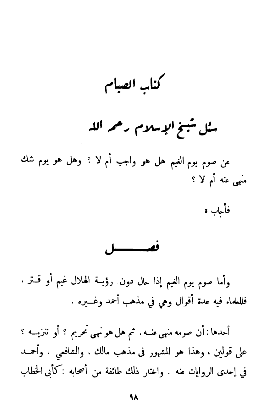 وَأَمَّا صَوْمُ يَوْمِ الْغَيْمِ إذَا حَالَ دُونَ رُؤْيَةِ الْهِلَالِ غَيْمٌ أَوْ قَتَرٌ فَلِلْعُلَمَاءِ فِيهِ عِدَّةُ أَقْوَالٍ وَهِيَ فِي مَذْهَبِ أَحْمَد وَغَيْرِهِ. أَحَدُهَا: أَنَّ صَوْمَهُ مَنْهِيٌّ عَنْهُ. ثُمَّ هَلْ هُوَ نَهْيُ تَحْرِيمٍ؟ أَوْ تَنْزِيهٍ؟ عَلَى قَوْلَيْنِ وَهَذَا هُوَ الْمَشْهُورُ فِي مَذْهَبِ مَالِكٌ وَالشَّافِعِيِّ وَأَحْمَد فِي إحْدَى الرِّوَايَاتِ عَنْهُ. وَاخْتَارَ ذَلِكَ طَائِفَةٌ مِنْ أَصْحَابِهِ: كَأَبِي الْخَطَّابِ