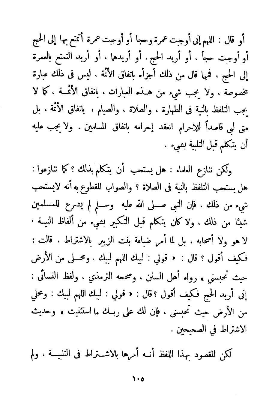 أَوْ قَالَ: اللَّهُمَّ إنِّي أَوْجَبْت عُمْرَةً وَحَجًّا أَوْ أَوْجَبْت عُمْرَةً أَتَمَتَّعُ بِهَا إلَى الْحَجِّ أَوْ أَوْجَبْت حَجًّا أَوْ أُرِيدُ الْحَجَّ أَوْ أُرِيدُهُمَا أَوْ أُرِيدُ التَّمَتُّعَ بِالْعُمْرَةِ إلَى الْحَجِّ فَمَهْمَا قَالَ مِنْ ذَلِكَ أَجْزَأَهُ بِاتِّفَاقِ الْأَئِمَّةِ لَيْسَ فِي ذَلِكَ عِبَارَةٌ مَخْصُوصَةٌ وَلَا يَجِبُ شَيْءٌ مِنْ هَذِهِ الْعِبَارَاتِ بِاتِّفَاقِ الْأَئِمَّةِ كَمَا لَا يَجِبُ التَّلَفُّظُ بِالنِّيَّةِ فِي الطَّهَارَةِ وَالصَّلَاةِ وَالصِّيَامِ بِاتِّفَاقِ الْأَئِمَّةِ بَلْ مَتَى لَبَّى قَاصِدًا لِلْإِحْرَامِ انْعَقَدَ إحْرَامُهُ بِاتِّفَاقِ الْمُسْلِمِينَ. وَلَا يَجِبُ عَلَيْهِ أَنْ يَتَكَلَّمَ قَبْلَ التَّلْبِيَةِ بِشَيْءِ. وَلَكِنْ تَنَازَعَ الْعُلَمَاءُ: هَلْ يُسْتَحَبُّ أَنْ يَتَكَلَّمَ بِذَلِكَ؟ كَمَا تَنَازَعُوا: هَلْ يُسْتَحَبُّ التَّلَفُّظُ بِالنِّيَّةِ فِي الصَّلَاةِ؟ وَالصَّوَابُ الْمَقْطُوعُ بِهِ أَنَّهُ لَا يُسْتَحَبُّ شَيْءٌ مِنْ ذَلِكَ فَإِنَّ النَّبِيَّ صَلَّى اللَّهُ عَلَيْهِ وَسَلَّمَ لَمْ يُشَرِّعْ لِلْمُسْلِمِينَ شَيْئًا مِنْ ذَلِكَ وَلَا كَانَ يَتَكَلَّمُ قَبْلَ التَّكْبِيرِ بِشَيْءِ مِنْ أَلْفَاظِ النِّيَّةِ لَا هُوَ وَلَا أَصْحَابُهُ بَلْ {لَمَّا أَمَرَ ضباعة بِنْتَ الزُّبَيْرِ بِالِاشْتِرَاطِ قَالَتْ: فَكَيْفَ أَقُولُ؟ قَالَ: قَوْلِي: لَبَّيْكَ اللَّهُمَّ لَبَّيْكَ وَمَحِلِّي مِنْ الْأَرْضِ حَيْثُ تَحْبِسُنِي رَوَاهُ أَهْلُ السُّنَنِ وَصَحَّحَهُ التِّرْمِذِيُّ وَلَفْظُ النَّسَائِي: إنِّي أُرِيدُ الْحَجَّ فَكَيْفَ أَقُولُ؟ قَالَ: قَوْلِي: لَبَّيْكَ اللَّهُمَّ لَبَّيْكَ: وَمَحِلِّي مِنْ الْأَرْضِ حَيْثُ تَحْبِسُنِي فَإِنَّ لَك عَلَى رَبِّك مَا اسْتَثْنَيْت} وَحَدِيثُ الِاشْتِرَاطِ فِي الصَّحِيحَيْنِ. لَكِنْ الْمَقْصُودُ بِهَذَا اللَّفْظِ أَنَّهُ أَمَرَهَا بِالِاشْتِرَاطِ فِي التَّلْبِيَةِ وَلَمْ