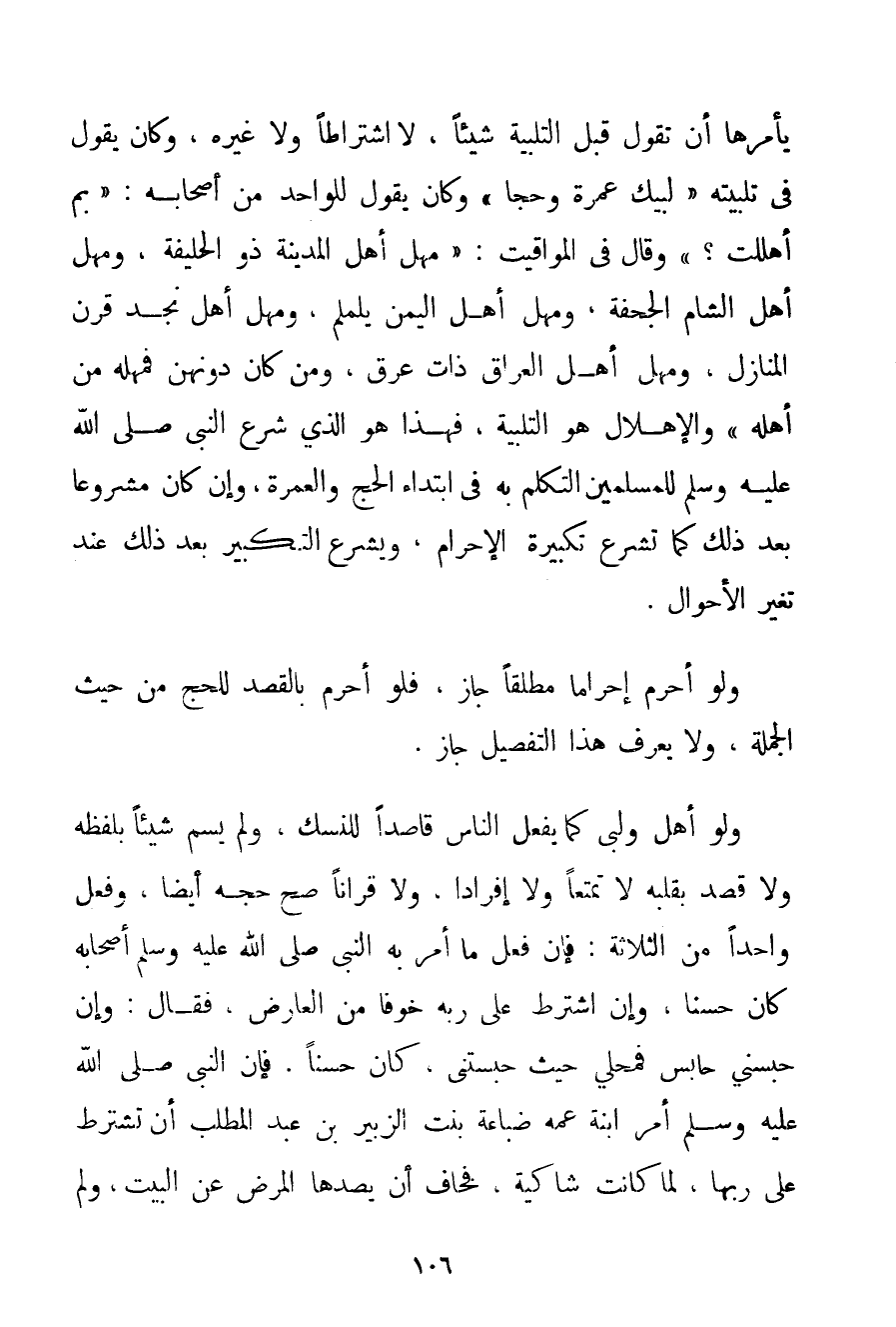 يَأْمُرْهَا أَنْ تَقُولَ قَبْلَ التَّلْبِيَةِ شَيْئًا لَا اشْتِرَاطًا وَلَا غَيْرَهُ {وكان يَقُولُ فِي تَلْبِيَتِهِ لَبَّيْكَ عُمْرَةً وَحَجًّا} وَكَانَ يَقُولُ لِلْوَاحِدِ مِنْ أَصْحَابِهِ: " بِمَ أَهْلَلْت؟ " {وقال فِي الْمَوَاقِيتِ: مُهَلُّ أَهْلِ الْمَدِينَةِ ذُو الحليفة وَمُهَلُّ أَهْلِ الشَّامِ الْجَحْفَةُ وَمُهَلُّ أَهْلِ الْيَمَنِ يلملم وَمُهَلُّ أَهْلِ نَجْدٍ قَرْنُ الْمَنَازِلِ وَمُهَلُّ أَهْلِ الْعِرَاقِ ذَاتُ عِرْقٍ وَمَنْ كَانَ دُونَهُنَّ فَمُهَلُّهُ مِنْ أَهْلِهِ} وَالْإِهْلَالُ هُوَ التَّلْبِيَةُ فَهَذَا هُوَ الَّذِي شَرَعَ النَّبِيُّ صَلَّى اللَّهُ عَلَيْهِ وَسَلَّمَ لِلْمُسْلِمِينَ التَّكَلُّمَ بِهِ فِي ابْتِدَاءِ الْحَجِّ وَالْعُمْرَةِ وَإِنْ كَانَ مَشْرُوعًا بَعْدَ ذَلِكَ كَمَا تُشْرَعُ تَكْبِيرَةُ الْإِحْرَامِ وَيُشْرَعُ التَّكْبِيرُ بَعْدَ ذَلِكَ عِنْدَ تَغَيُّرِ الْأَحْوَالِ. وَلَوْ أَحْرَمَ إحْرَامًا مُطْلَقًا جَازَ فَلَوْ أَحْرَمَ بِالْقَصْدِ لِلْحَجِّ مِنْ حَيْثُ الْجُمْلَةُ وَلَا يُعْرَفُ هَذَا التَّفْصِيلُ جَازَ. وَلَوْ أَهَلَّ وَلَبَّى كَمَا يَفْعَلُ النَّاسُ قَاصِدًا لِلنُّسُكِ وَلَمْ يُسَمِّ شَيْئًا بِلَفْظِهِ وَلَا قَصَدَ بِقَلْبِهِ لَا تَمَتُّعًا وَلَا إفْرَادًا وَلَا قِرَانًا صَحَّ حَجُّهُ أَيْضًا وَفَعَلَ وَاحِدًا مِنْ الثَّلَاثَةِ: فَإِنْ فَعَلَ مَا أَمَرَ بِهِ النَّبِيُّ صَلَّى اللَّهُ عَلَيْهِ وَسَلَّمَ أَصْحَابَهُ كَانَ حَسَنًا وَإِنْ اشْتَرَطَ عَلَى رَبِّهِ خَوْفًا مِنْ الْعَارِضِ فَقَالَ: وَإِنْ حَبَسَنِي حَابِسٌ فَمَحِلِّي حَيْثُ حَبَسْتنِي كَانَ حَسَنًا. فَإِنَّ النَّبِيَّ صَلَّى اللَّهُ عَلَيْهِ وَسَلَّمَ أَمَرَ ابْنَةَ عَمِّهِ ضباعة بِنْتَ الزُّبَيْرِ بْنِ عَبْدِ الْمُطَّلِبِ أَنْ تَشْتَرِطَ عَلَى رَبِّهَا لَمَّا كَانَتْ شَاكِيَةً فَخَافَ أَنْ يَصُدَّهَا الْمَرَضُ عَنْ الْبَيْتِ وَلَمْ