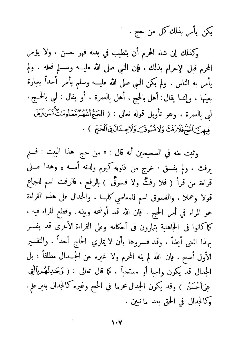 يَكُنْ يَأْمُرُ بِذَلِكَ كُلَّ مَنْ حَجَّ. وَكَذَلِكَ إنْ شَاءَ الْمُحْرِمُ أَنْ يَتَطَيَّبَ فِي بَدَنِهِ فَهُوَ حَسَنٌ وَلَا يُؤْمَرُ الْمُحْرِمُ قَبْلَ الْإِحْرَامِ بِذَلِكَ فَإِنَّ النَّبِيَّ صَلَّى اللَّهُ عَلَيْهِ وَسَلَّمَ فَعَلَهُ وَلَمْ يَأْمُرْ بِهِ النَّاسَ وَلَمْ يَكُنْ النَّبِيُّ صَلَّى اللَّهُ عَلَيْهِ وَسَلَّمَ يَأْمُرُ أَحَدًا بِعِبَارَةِ بِعَيْنِهَا وَإِنَّمَا يُقَالُ: أَهَلَّ بِالْحَجِّ أَهَلَّ بِالْعُمْرَةِ أَوْ يُقَالُ: لَبَّى بِالْحَجِّ لَبَّى بِالْعُمْرَةِ وَهُوَ تَأْوِيلُ قَوْله تَعَالَى {الْحَجُّ أَشْهُرٌ مَعْلُومَاتٌ فَمَنْ فَرَضَ فِيهِنَّ الْحَجَّ فَلَا رَفَثَ وَلَا فُسُوقَ وَلَا جِدَالَ فِي الْحَجِّ} . وَثَبَتَ عَنْهُ فِي الصَّحِيحَيْنِ أَنَّهُ قَالَ: {مَنْ حَجَّ هَذَا الْبَيْتَ: فَلَمْ يَرْفُثْ وَلَمْ يَفْسُقْ خَرَجَ مِنْ ذُنُوبِهِ كَيَوْمِ وَلَدَتْهُ أُمُّهُ} وَهَذَا عَلَى قِرَاءَةِ مَنْ قَرَأَ {فَلَا رَفَثَ وَلَا فُسُوقَ} بِالرَّفْعِ فَالرَّفَثُ اسْمٌ لِلْجِمَاعِ قَوْلًا وَعَمَلًا وَالْفُسُوقُ اسْمٌ لِلْمَعَاصِي كُلِّهَا وَالْجِدَالُ عَلَى هَذِهِ الْقِرَاءَةِ هُوَ الْمِرَاءُ فِي أَمْرِ الْحَجِّ. فَإِنَّ اللَّهَ قَدْ أَوْضَحَهُ وَبَيَّنَهُ وَقَطَعَ الْمِرَاءَ فِيهِ كَمَا كَانُوا فِي الْجَاهِلِيَّةِ يَتَمَارَوْنَ فِي أَحْكَامِهِ وَعَلَى الْقِرَاءَةِ الْأُخْرَى قَدْ يُفَسَّرُ بِهَذَا الْمَعْنَى أَيْضًا وَقَدْ فَسَّرُوهَا بِأَنْ لَا يُمَارِي الْحَاجُّ أَحَدًا وَالتَّفْسِيرُ الْأَوَّلُ أَصَحُّ فَإِنَّ اللَّهَ لَمْ يَنْهَ الْمُحْرِمَ وَلَا غَيْرَهُ عَنْ الْجِدَالِ مُطْلَقًا؛ بَلْ الْجِدَالُ قَدْ يَكُونُ وَاجِبًا أَوْ مُسْتَحَبًّا كَمَا قَالَ تَعَالَى: {وَجَادِلْهُمْ بِالَّتِي هِيَ أَحْسَنُ} وَقَدْ يَكُونُ الْجِدَالُ مُحَرَّمًا فِي الْحَجِّ وَغَيْرِهِ كَالْجِدَالِ بِغَيْرِ عِلْمٍ. وَكَالْجِدَالِ فِي الْحَقِّ بَعْدَ مَا تَبَيَّنَ.