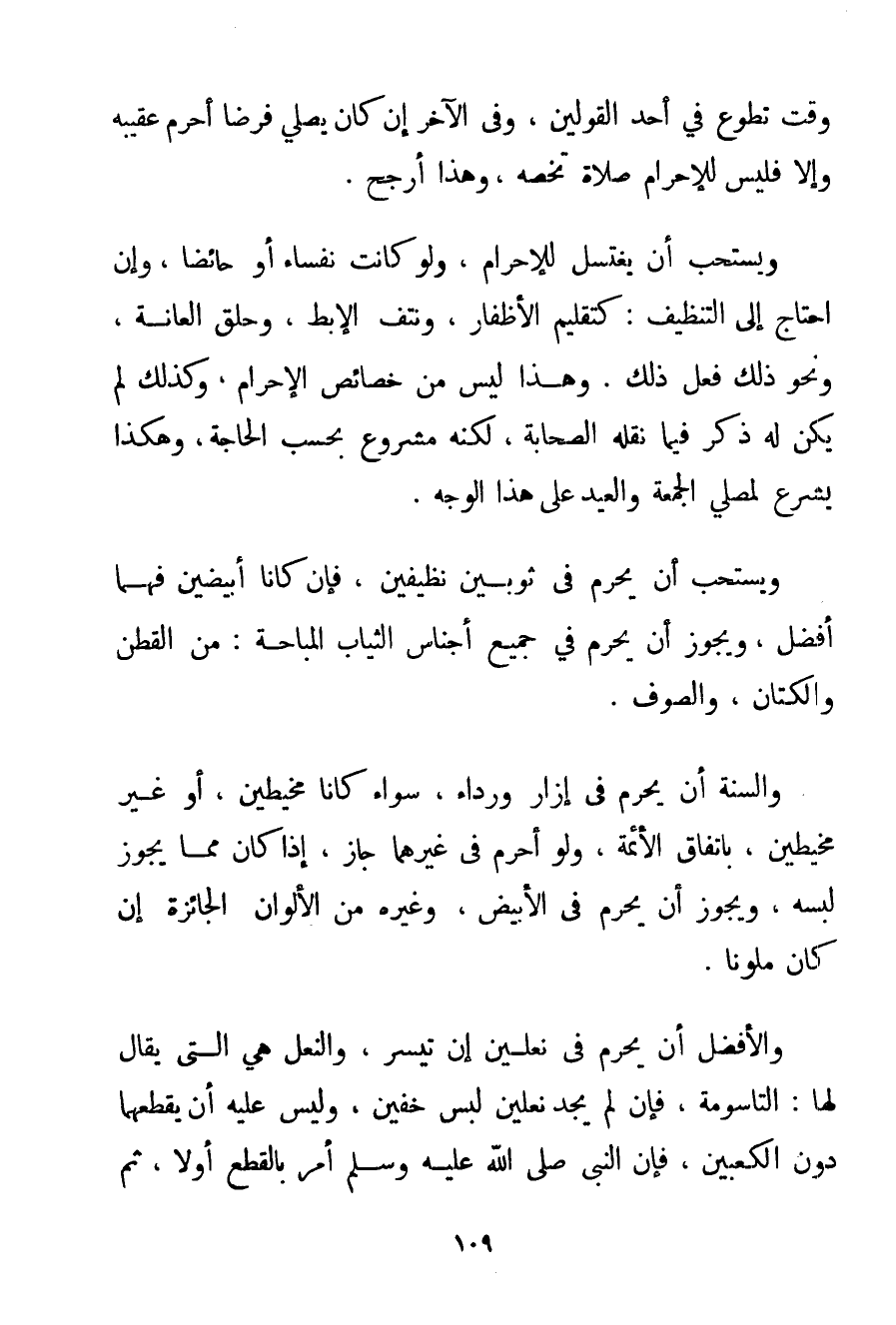 وَقْتَ تَطَوُّعٍ فِي أَحَدِ الْقَوْلَيْنِ وَفِي الْآخَرِ إنْ كَانَ يُصَلِّي فَرْضًا أَحْرَمَ عَقِيبَهُ وَإِلَّا فَلَيْسَ لِلْإِحْرَامِ صَلَاةٌ تَخُصُّهُ وَهَذَا أَرْجَحُ. وَيُسْتَحَبُّ أَنْ يَغْتَسِلَ لِلْإِحْرَامِ وَلَوْ كَانَتْ نُفَسَاءَ أَوْ حَائِضًا وَإِنْ احْتَاجَ إلَى التَّنْظِيفِ: كَتَقْلِيمِ الْأَظْفَارِ وَنَتْفِ الْإِبِطِ وَحَلْقِ الْعَانَةِ وَنَحْوِ ذَلِكَ فَعَلَ ذَلِكَ. وَهَذَا لَيْسَ مِنْ خَصَائِصِ الْإِحْرَامِ وَكَذَلِكَ لَمْ يَكُنْ لَهُ ذِكْرٌ فِيمَا نَقَلَهُ الصَّحَابَةُ لَكِنَّهُ مَشْرُوعٌ بِحَسَبِ الْحَاجَةِ وَهَكَذَا يُشْرَعُ لِمُصَلِّي الْجُمُعَةِ وَالْعِيدِ عَلَى هَذَا الْوَجْهِ. وَيُسْتَحَبُّ أَنْ يُحْرِمَ فِي ثَوْبَيْنِ نَظِيفَيْنِ فَإِنْ كَانَا أَبْيَضَيْنِ فَهُمَا أَفْضَلُ وَيَجُوزُ أَنْ يُحْرِمَ فِي جَمِيعِ أَجْنَاسِ الثِّيَابِ الْمُبَاحَةِ: مِنْ الْقُطْنِ وَالْكَتَّانِ وَالصُّوفِ. وَالسُّنَّةُ أَنْ يُحْرِمَ فِي إزَارٍ وَرِدَاءٍ سَوَاءٌ كَانَا مَخِيطَيْنِ أَوْ غَيْرَ مَخِيطَيْنِ بِاتِّفَاقِ الْأَئِمَّةِ وَلَوْ أَحْرَمَ فِي غَيْرِهِمَا جَازَ إذَا كَانَ مِمَّا يَجُوزُ لُبْسُهُ وَيَجُوزُ أَنْ يُحْرِمَ فِي الْأَبْيَضِ وَغَيْرِهِ مِنْ الْأَلْوَانِ الْجَائِزَةِ وَإِنْ كَانَ مُلَوَّنًا. وَالْأَفْضَلُ أَنْ يُحْرِمَ فِي نَعْلَيْنِ إنْ تَيَسَّرَ، وَالنَّعْلُ هِيَ الَّتِي يُقَالُ لَهَا: التاسومة فَإِنْ لَمْ يَجِدْ نَعْلَيْنِ لَبِسَ خُفَّيْنِ وَلَيْسَ عَلَيْهِ أَنْ يَقْطَعَهُمَا دُونَ الْكَعْبَيْنِ فَإِنَّ النَّبِيَّ صَلَّى اللَّهُ عَلَيْهِ وَسَلَّمَ أَمَرَ بِالْقَطْعِ أَوَّلًا ثُمَّ