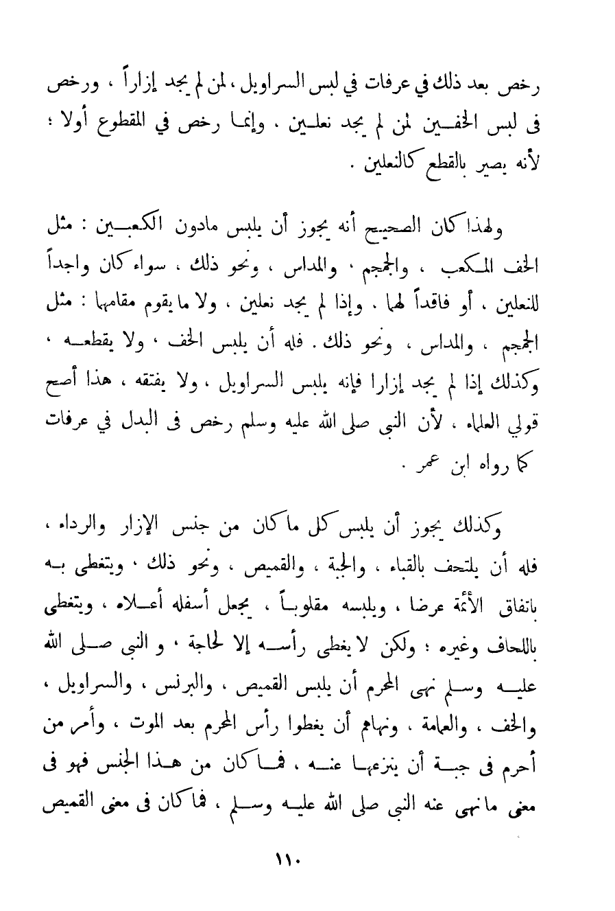 رَخَّصَ بَعْدَ ذَلِكَ فِي عَرَفَاتٍ فِي لُبْسِ السَّرَاوِيلِ لِمَنْ لَمْ يَجِدْ إزَارًا وَرَخَّصَ فِي لُبْسِ الْخُفَّيْنِ لِمَنْ لَمْ يَجِدْ نَعْلَيْنِ وَإِنَّمَا رَخَّصَ فِي الْمَقْطُوعِ أَوَّلًا؛ لِأَنَّهُ يَصِيرُ بِالْقَطْعِ كَالنَّعْلَيْنِ. وَلِهَذَا كَانَ الصَّحِيحُ أَنَّهُ يَجُوزُ أَنْ يَلْبَسَ مَا دُونَ الْكَعْبَيْنِ: مِثْلَ الْخُفِّ الْمُكَعَّبِ وَالْجُمْجُمِ وَالْمَدَاسِ وَنَحْوِ ذَلِكَ سَوَاءٌ كَانَ وَاجِدًا لِلنَّعْلَيْنِ أَوْ فَاقِدًا لَهُمَا وَإِذَا لَمْ يَجِدْ نَعْلَيْنِ وَلَا مَا يَقُومُ مَقَامَهُمَا: مِثْلُ الْجُمْجُمِ وَالْمَدَاسِ وَنَحْوُ ذَلِكَ. فَلَهُ أَنْ يَلْبَسَ الْخُفَّ وَلَا يَقْطَعَهُ وَكَذَلِكَ إذَا لَمْ يَجِدْ إزَارًا فَإِنَّهُ يَلْبَسُ السَّرَاوِيلَ وَلَا يَفْتُقُهُ هَذَا أَصَحُّ قَوْلَيْ الْعُلَمَاءِ لِأَنَّ النَّبِيَّ صَلَّى اللَّهُ عَلَيْهِ وَسَلَّمَ رَخَّصَ فِي الْبَدَلِ فِي عَرَفَاتٍ كَمَا رَوَاهُ ابْنُ عُمَرَ. وَكَذَلِكَ يَجُوزُ أَنْ يَلْبَسَ كُلَّ مَا كَانَ مِنْ جِنْسِ الْإِزَارِ وَالرِّدَاءِ فَلَهُ أَنْ يَلْتَحِفَ بِالْقَبَاءِ وَالْجُبَّةِ وَالْقَمِيصِ وَنَحْوِ ذَلِكَ وَيَتَغَطَّى بِهِ بِاتِّفَاقِ الْأَئِمَّةِ عَرْضًا وَيَلْبَسُهُ مَقْلُوبًا يَجْعَلُ أَسْفَلَهُ أَعْلَاهُ وَيَتَغَطَّى بِاللِّحَافِ وَغَيْرِهِ؛ وَلَكِنْ لَا يُغَطِّي رَأْسَهُ إلَّا لِحَاجَةِ وَالنَّبِيُّ صَلَّى اللَّهُ عَلَيْهِ وَسَلَّمَ نَهَى الْمُحْرِمَ أَنْ يَلْبَسَ الْقَمِيصَ وَالْبُرْنُسَ وَالسَّرَاوِيلَ وَالْخُفَّ وَالْعِمَامَةَ وَنَهَاهُمْ أَنْ يُغَطُّوا رَأْسَ الْمُحْرِمِ بَعْدَ الْمَوْتِ وَأَمَرَ مَنْ أَحْرَمَ فِي جُبَّةٍ أَنْ يَنْزِعَهَا عَنْهُ فَمَا كَانَ مِنْ هَذَا الْجِنْسِ فَهُوَ فِي مَعْنَى مَا نَهَى عَنْهُ النَّبِيُّ صَلَّى اللَّهُ عَلَيْهِ وَسَلَّمَ فَمَا كَانَ فِي مَعْنَى الْقَمِيصِ