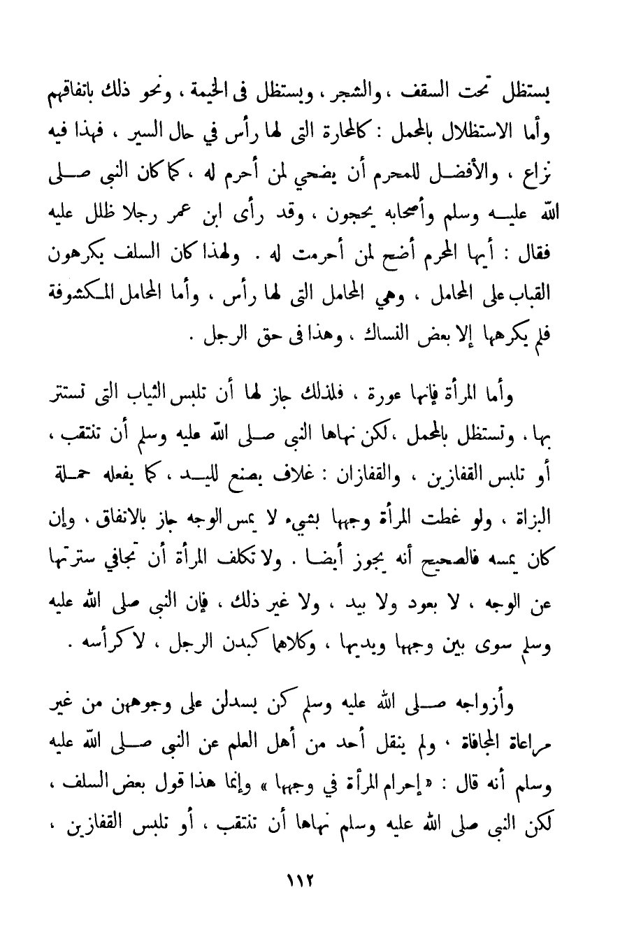 يَسْتَظِلَّ تَحْتَ السَّقْفِ وَالشَّجَرِ وَيَسْتَظِلَّ فِي الْخَيْمَةِ وَنَحْوِ ذَلِكَ بِاتِّفَاقِهِمْ وَأَمَّا الِاسْتِظْلَالُ بِالْمَحْمَلِ: فِي حَالِ السَّيْرِ فَهَذَا فِيهِ نِزَاعٌ وَالْأَفْضَلُ لِلْمُحْرِمِ أَنْ يُضَحِّيَ لِمَنْ أَحْرَمَ لَهُ كَمَا كَانَ النَّبِيُّ صَلَّى اللَّهُ عَلَيْهِ وَسَلَّمَ وَأَصْحَابُهُ يَحُجُّونَ وَقَدْ رَأَى ابْنُ عُمَرَ رَجُلًا ظُلِّلَ عَلَيْهِ فَقَالَ: أَيُّهَا الْهَرَمُ أَضْحِ لِمَنْ أَحْرَمْت لَهُ. وَلِهَذَا كَانَ السَّلَفُ يَكْرَهُونَ الْقِبَابَ عَلَى الْمَحَامِلِ وَهِيَ الْمَحَامِلُ الَّتِي لَهَا رَأْسٌ وَأَمَّا الْمَحَامِلُ الْمَكْشُوفَةُ فَلَمْ يَكْرَهَا إلَّا بَعْضُ النُّسَّاكِ وَهَذَا فِي حَقِّ الرَّجُلِ. وَأَمَّا الْمَرْأَةُ فَإِنَّهَا عَوْرَةٌ فَلِذَلِكَ جَازَ لَهَا أَنْ تَلْبَسَ الثِّيَابَ الَّتِي تَسْتَتِرُ بِهَا وَتَسْتَظِلُّ بِالْمَحْمَلِ لَكِنْ نَهَاهَا النَّبِيُّ صَلَّى اللَّهُ عَلَيْهِ وَسَلَّمَ أَنْ تَنْتَقِبَ أَوْ تَلْبَسَ الْقُفَّازَيْنِ وَالْقُفَّازَانِ: غِلَافٌ يُصْنَعُ لِلْيَدِ كَمَا يَفْعَلُهُ حَمَلَةُ الْبُزَاةِ وَلَوْ غَطَّتْ الْمَرْأَةُ وَجْهَهَا بِشَيْءِ لَا يَمَسُّ الْوَجْهَ جَازَ بِالِاتِّفَاقِ وَإِنْ كَانَ يَمَسُّهُ فَالصَّحِيحُ أَنَّهُ يَجُوزُ أَيْضًا. وَلَا تُكَلَّفُ الْمَرْأَةُ أَنْ تُجَافِيَ سُتْرَتَهَا عَنْ الْوَجْهِ لَا بِعُودِ وَلَا بِيَدِ وَلَا غَيْرِ ذَلِكَ فَإِنَّ النَّبِيَّ صَلَّى اللَّهُ عَلَيْهِ وَسَلَّمَ سَوَّى بَيْنَ وَجْهِهَا وَيَدَيْهَا وَكِلَاهُمَا كَبَدَنِ الرَّجُلِ لَا كَرَأْسِهِ. وَأَزْوَاجُهُ صَلَّى اللَّهُ عَلَيْهِ وَسَلَّمَ كُنَّ يُسْدِلْنَ عَلَى وُجُوهِهِنَّ مِنْ غَيْرِ مُرَاعَاةِ الْمُجَافَاةِ وَلَمْ يَنْقُلْ أَحَدٌ مِنْ أَهْلِ الْعِلْمِ عَنْ النَّبِيِّ صَلَّى اللَّهُ عَلَيْهِ وَسَلَّمَ أَنَّهُ قَالَ: " إحْرَامُ الْمَرْأَةِ فِي وَجْهِهَا " وَإِنَّمَا هَذَا قَوْلُ بَعْضِ السَّلَفِ لَكِنَّ النَّبِيَّ صَلَّى اللَّهُ عَلَيْهِ وَسَلَّمَ نَهَاهَا أَنْ تَنْتَقِبَ أَوْ تَلْبَسَ الْقُفَّازَيْنِ.