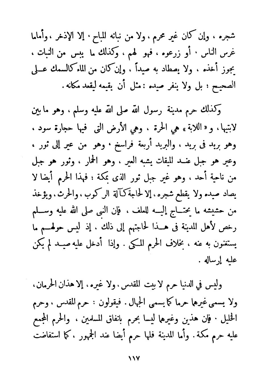 شَجَرِهِ وَإِنْ كَانَ غَيْرَ مُحْرِمٍ وَلَا مِنْ نَبَاتِهِ الْمُبَاحِ إلَّا الْإِذْخِرَ وَأَمَّا مَا غَرَسَ النَّاسُ أَوْ زَرَعُوهُ فَهُوَ لَهُمْ وَكَذَلِكَ مَا يَبِسَ مِنْ النَّبَاتِ يَجُوزُ أَخْذُهُ وَلَا يَصْطَادُ بِهِ صَيْدًا وَإِنْ كَانَ مِنْ الْمَاءِ كَالسَّمَكِ عَلَى الصَّحِيحِ؛ بَلْ وَلَا يُنَفَّرُ صَيْدُهُ: مِثْلَ أَنْ يُقِيمَهُ لِيَقْعُدَ مَكَانَهُ. وَكَذَلِكَ حَرَمُ مَدِينَةِ رَسُولِ اللَّهِ صَلَّى اللَّهُ عَلَيْهِ وَسَلَّمَ وَهُوَ مَا بَيْنَ لَابَتَيْهَا و " اللَّابَةُ " هِيَ الْحَرَّةُ وَهِيَ الْأَرْضُ الَّتِي فِيهَا حِجَارَةٌ سُودٌ وَهُوَ بَرِيدٌ فِي بَرِيدٍ وَالْبَرِيدُ أَرْبَعَةُ فَرَاسِخَ وَهُوَ مِنْ عَيْرٍ إلَى ثَوْرٍ وَعَيْرٌ هُوَ جَبَلٌ عِنْدَ الْمِيقَاتِ يُشْبِهُ الْعَيْرَ وَهُوَ الْحِمَارُ وَثَوْرٌ هُوَ جَبَلٌ مِنْ نَاحِيَةِ أُحُدٍ وَهُوَ غَيْرُ جَبَلِ ثَوْرٍ الَّذِي بِمَكَّةَ؛ فَهَذَا الْحَرَمُ أَيْضًا لَا يُصَادُ صَيْدُهُ وَلَا يُقْطَعُ شَجَرُهُ إلَّا لِحَاجَةِ كَآلَةِ الرُّكُوبِ وَالْحَرْثِ وَيُؤْخَذُ مِنْ حَشِيشِهِ مَا يُحْتَاجُ إلَيْهِ لِلْعَلَفِ فَإِنَّ النَّبِيَّ صَلَّى اللَّهُ عَلَيْهِ وَسَلَّمَ رَخَّصَ لِأَهْلِ الْمَدِينَةِ فِي هَذَا لِحَاجَتِهِمْ إلَى ذَلِكَ إذْ لَيْسَ حَوْلَهُمْ مَا يَسْتَغْنُونَ بِهِ عَنْهُ بِخِلَافِ الْحَرَمِ الْمَكِّيِّ. وَإِذَا أُدْخِلَ عَلَيْهِ صَيْدٌ لَمْ يَكُنْ عَلَيْهِ إرْسَالُهُ. وَلَيْسَ فِي الدُّنْيَا حَرَمٌ لَا بَيْتُ الْمَقْدِسِ وَلَا غَيْرُهُ إلَّا هَذَانِ الْحَرَمَانِ وَلَا يُسَمَّى غَيْرُهُمَا حَرَمًا كَمَا يُسَمِّي الْجُهَّالُ. فَيَقُولُونَ: حَرَمُ الْمَقْدِسِ وَحَرَمُ الْخَلِيلِ. فَإِنَّ هَذَيْنِ وَغَيْرَهُمَا لَيْسَا بِحَرَمِ بِاتِّفَاقِ الْمُسْلِمِينَ وَالْحَرَمُ الْمُجْمَعُ عَلَيْهِ حَرَمُ مَكَّةَ. وَأَمَّا الْمَدِينَةُ فَلَهَا حَرَمٌ أَيْضًا عِنْدَ الْجُمْهُورِ كَمَا اسْتَفَاضَتْ