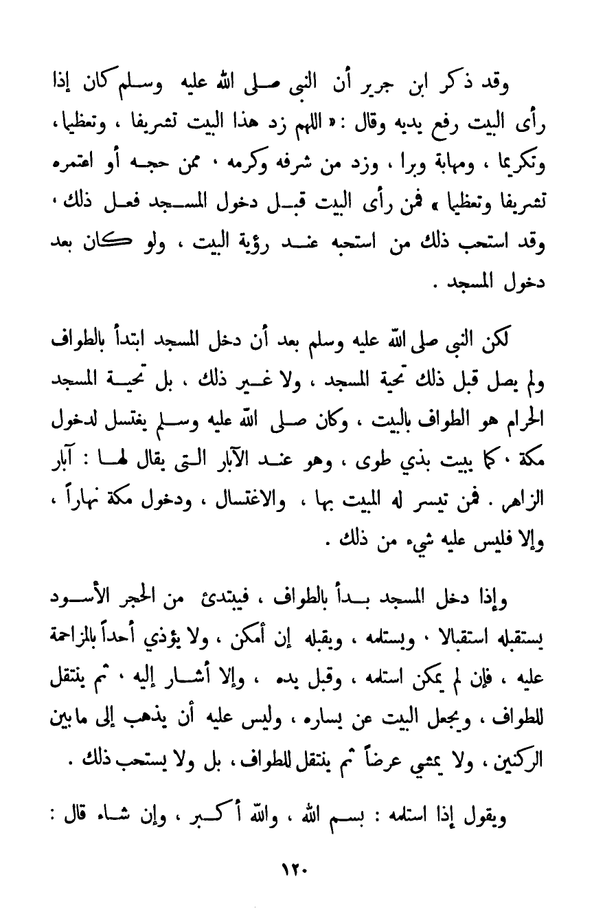 وَقَدْ ذَكَرَ ابْنُ جَرِيرٍ {أَنَّ النَّبِيَّ صَلَّى اللَّهُ عَلَيْهِ وَسَلَّمَ كَانَ إذَا رَأَى الْبَيْتَ رَفَعَ يَدَيْهِ وَقَالَ: اللَّهُمَّ زِدْ هَذَا الْبَيْتَ تَشْرِيفًا وَتَعْظِيمًا وَتَكْرِيمًا وَمَهَابَةً وَبِرًّا وَزِدْ مِنْ شَرَفِهِ وَكَرَمِهِ مِمَّنْ حَجَّهُ أَوْ اعْتَمَرَهُ تَشْرِيفًا وَتَعْظِيمًا} فَمَنْ رَأَى الْبَيْتَ قَبْلَ دُخُولِ الْمَسْجِدِ فَعَلَ ذَلِكَ وَقَدْ اسْتَحَبَّ ذَلِكَ مَنْ اسْتَحَبَّهُ عِنْدَ رُؤْيَةِ الْبَيْتِ الدُّعَاء وَلَوْ كَانَ بَعْدَ دُخُولِ الْمَسْجِدِ. لَكِنَّ النَّبِيَّ صَلَّى اللَّهُ عَلَيْهِ وَسَلَّمَ بُعْد أَنْ دَخَلَ الْمَسْجِدَ ابْتَدَأَ بِالطَّوَافِ وَلَمْ يُصَلِّ قَبْلَ ذَلِكَ تَحِيَّةَ الْمَسْجِدِ وَلَا غَيْرَ ذَلِكَ بَلْ تَحِيَّةُ الْمَسْجِدِ الْحَرَامِ هُوَ الطَّوَافُ بِالْبَيْتِ وَكَانَ صَلَّى اللَّهُ عَلَيْهِ وَسَلَّمَ يَغْتَسِلُ لِدُخُولِ مَكَّةَ كَمَا يَبِيتُ بِذِي طُوًى وَهُوَ عِنْدَ الْآبَارِ الَّتِي يُقَالُ لَهَا: آبَارُ الزَّاهِرِ. فَمَنْ تَيَسَّرَ لَهُ الْمَبِيتُ بِهَا وَالِاغْتِسَالُ وَدُخُولُ مَكَّةَ نَهَارًا وَإِلَّا فَلَيْسَ عَلَيْهِ شَيْءٌ مِنْ ذَلِكَ. وَإِذَا دَخَلَ الْمَسْجِدَ بَدَأَ بِالطَّوَافِ فَيَبْتَدِئُ مِنْ الْحَجَرِ الْأَسْوَدِ يَسْتَقْبِلُهُ اسْتِقْبَالًا وَيَسْتَلِمُهُ وَيُقَبِّلُهُ إنْ أَمْكَنَ وَلَا يُؤْذِي أَحَدًا بِالْمُزَاحَمَةِ عَلَيْهِ فَإِنْ لَمْ يُمْكِنْ اسْتَلَمَهُ وَقَبَّلَ يَدَهُ وَإِلَّا أَشَارَ إلَيْهِ ثُمَّ يَنْتَقِلُ لِلطَّوَافِ وَيَجْعَلُ الْبَيْتَ عَنْ يَسَارِهِ وَلَيْسَ عَلَيْهِ أَنْ يَذْهَبَ إلَى مَا بَيْنَ الرُّكْنَيْنِ وَلَا يَمْشِي عَرْضًا ثُمَّ يَنْتَقِلُ لِلطَّوَافِ بَلْ وَلَا يُسْتَحَبُّ ذَلِكَ. وَيَقُولُ إذَا اسْتَلَمَهُ: بِسْمِ اللَّهِ وَاَللَّهُ أَكْبَرُ وَإِنْ شَاءَ قَالَ: