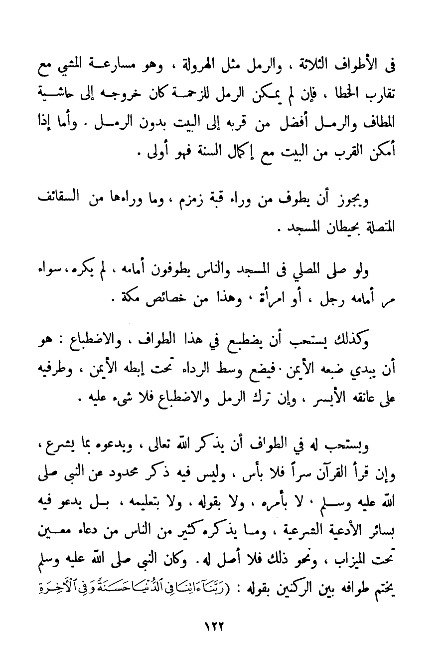 فِي الْأَطْوَافِ الثَّلَاثَةِ وَالرَّمَلُ مِثْلُ الْهَرْوَلَةِ وَهُوَ مُسَارَعَةُ الْمَشْيِ مَعَ تَقَارُبِ الْخُطَى فَإِنْ لَمْ يُمْكِنْ الرَّمَلُ لِلزَّحْمَةِ كَانَ خُرُوجُهُ إلَى حَاشِيَةِ الْمَطَافِ وَالرَّمَلُ أَفْضَلُ مِنْ قُرْبِهِ إلَى الْبَيْتِ بِدُونِ الرَّمَلِ. وَأَمَّا إذَا أَمْكَنَ الْقُرْبُ مِنْ الْبَيْتِ مَعَ إكْمَالِ السُّنَّةِ فَهُوَ أَوْلَى. وَيَجُوزُ أَنْ يَطُوفَ مِنْ وَرَاءِ قُبَّةِ زَمْزَمَ وَمَا وَرَاءَهَا مِنْ السَّقَائِفِ الْمُتَّصِلَةِ بِحِيطَانِ الْمَسْجِدِ. وَلَوْ صَلَّى الْمُصَلِّي فِي الْمَسْجِدِ وَالنَّاسُ يَطُوفُونَ أَمَامَهُ لَمْ يُكْرَهْ سَوَاءٌ مَرَّ أَمَامَهُ رَجُلٌ أَوْ امْرَأَةٌ وَهَذَا مِنْ خَصَائِصِ مَكَّةَ. وَكَذَلِكَ يُسْتَحَبُّ أَنْ يَضْطَبِعَ فِي هَذَا الطَّوَافِ وَالِاضْطِبَاعُ: هُوَ أَنْ يُبْدِيَ ضَبْعَهُ الْأَيْمَنَ فَيَضَعَ وَسَطَ الرِّدَاءِ تَحْتَ إبِطِهِ الْأَيْمَنِ وَطَرَفَيْهِ عَلَى عَاتِقِهِ الْأَيْسَرِ وَإِنْ تَرَكَ الرَّمَلَ وَالِاضْطِبَاعَ فَلَا شَيْءَ عَلَيْهِ. وَيُسْتَحَبُّ لَهُ فِي الطَّوَافِ أَنْ يَذْكُرَ اللَّهَ تَعَالَى وَيَدْعُوَهُ بِمَا يُشْرَعُ وَإِنْ قَرَأَ الْقُرْآنَ سِرًّا فَلَا بَأْسَ وَلَيْسَ فِيهِ ذِكْرٌ مَحْدُودٌ عَنْ النَّبِيِّ صَلَّى اللَّهُ عَلَيْهِ وَسَلَّمَ لَا بِأَمْرِهِ وَلَا بِقَوْلِهِ وَلَا بِتَعْلِيمِهِ بَلْ يَدْعُو فِيهِ بِسَائِرِ الْأَدْعِيَةِ الشَّرْعِيَّةِ وَمَا يَذْكُرُهُ كَثِيرٌ مِنْ النَّاسِ مِنْ دُعَاءٍ مُعَيَّنٍ تَحْتَ الْمِيزَابِ وَنَحْوَ ذَلِكَ فَلَا أَصْلَ لَهُ. وَكَانَ النَّبِيُّ صَلَّى اللَّهُ عَلَيْهِ وَسَلَّمَ يَخْتِمُ طَوَافَهُ بَيْنَ الرُّكْنَيْنِ بِقَوْلِهِ: {رَبَّنَا آتِنَا فِي الدُّنْيَا حَسَنَةً وَفِي الْآخِرَةِ