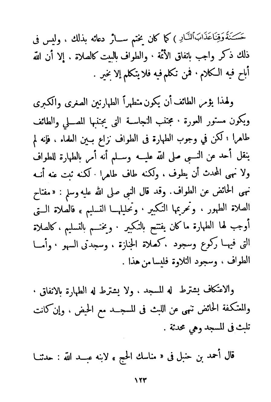 حَسَنَةً وَقِنَا عَذَابَ النَّارِ} كَمَا كَانَ يَخْتِمُ سَائِرَ دُعَائِهِ بِذَلِكَ وَلَيْسَ فِي ذَلِكَ ذِكْرٌ وَاجِبٌ بِاتِّفَاقِ الْأَئِمَّةِ، وَالطَّوَافُ بِالْبَيْتِ كَالصَّلَاةِ إلَّا أَنَّ اللَّهَ أَبَاحَ فِيهِ الْكَلَامَ فَمَنْ تَكَلَّمَ فِيهِ فَلَا يَتَكَلَّمُ إلَّا بِخَيْرِ. وَلِهَذَا يُؤْمَرُ الطَّائِفُ أَنْ يَكُونَ مُتَطَهِّرًا الطَّهَارَتَيْنِ الصُّغْرَى وَالْكُبْرَى وَيَكُونَ مَسْتُورَ الْعَوْرَةِ مُجْتَنِبَ النَّجَاسَةِ الَّتِي يَجْتَنِبُهَا الْمُصَلِّي وَالطَّائِفُ طَاهِرًا؛ لَكِنْ فِي وُجُوبِ الطَّهَارَةِ فِي الطَّوَافِ نِزَاعٌ بَيْنَ الْعُلَمَاءِ فَإِنَّهُ لَمْ يَنْقُلْ أَحَدٌ عَنْ النَّبِيِّ صَلَّى اللَّهُ عَلَيْهِ وَسَلَّمَ أَنَّهُ أَمَرَ بِالطَّهَارَةِ لِلطَّوَافِ وَلَا نَهَى الْمُحْدِثَ أَنْ يَطُوفَ وَلَكِنَّهُ طَافَ طَاهِرًا. لَكِنَّهُ ثَبَتَ عَنْهُ أَنَّهُ نَهَى الْحَائِضَ عَنْ الطَّوَافِ. وَقَدْ قَالَ النَّبِيُّ صَلَّى اللَّهُ عَلَيْهِ وَسَلَّمَ {مِفْتَاحُ الصَّلَاةِ الطَّهُورُ وَتَحْرِيمُهَا التَّكْبِيرُ وَتَحْلِيلُهَا التَّسْلِيمُ} فَالصَّلَاةُ الَّتِي أَوْجَبَ لَهَا الطَّهَارَةَ مَا كَانَ يُفْتَتَحُ بِالتَّكْبِيرِ وَيُخْتَمُ بِالتَّسْلِيمِ كَالصَّلَاةِ الَّتِي فِيهَا رُكُوعٌ وَسُجُودٌ كَصَلَاةِ الْجِنَازَةِ وَسَجْدَتَيْ السَّهْوِ وَأَمَّا الطَّوَافُ وَسُجُودُ التِّلَاوَةِ فَلَيْسَا مِنْ هَذَا. وَالِاعْتِكَافُ يُشْتَرَطُ لَهُ الْمَسْجِدُ وَلَا يُشْتَرَطُ لَهُ الطَّهَارَةُ بِالِاتِّفَاقِ وَالْمُعْتَكِفَةُ الْحَائِضُ تُنْهَى عَنْ اللُّبْثِ فِي الْمَسْجِدِ مَعَ الْحَيْضِ وَإِنْ كَانَتْ تَلْبَثُ فِي الْمَسْجِدِ وَهِيَ مُحْدِثَةٌ. قَالَ أَحْمَد بْنُ حَنْبَلٍ فِي " مَنَاسِكِ الْحَجِّ " لِابْنِهِ عَبْدِ اللَّهِ: حَدَّثَنَا