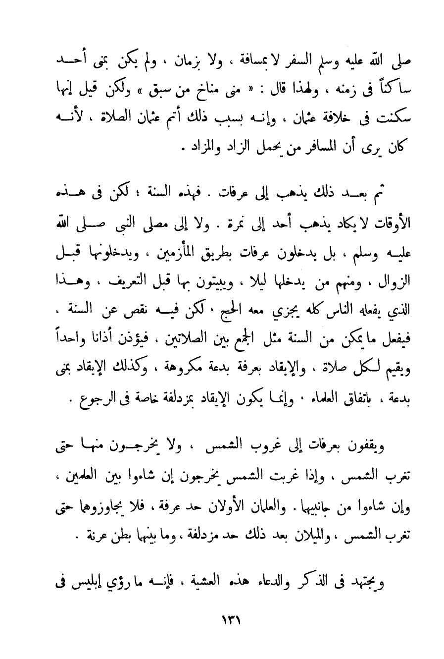 صَلَّى اللَّهُ عَلَيْهِ وَسَلَّمَ السَّفَرَ لَا بِمَسَافَةِ وَلَا بِزَمَانِ وَلَمْ يَكُنْ بِمِنَى أَحَدٌ سَاكِنًا فِي زَمَنِهِ وَلِهَذَا قَالَ: {مِنَى مُنَاخُ مَنْ سَبَقَ} وَلَكِنْ قِيلَ إنَّهَا سُكِنَتْ فِي خِلَافَةِ عُثْمَانُ وَأَنَّهُ بِسَبَبِ ذَلِكَ أَتَمَّ عُثْمَانُ الصَّلَاةَ لِأَنَّهُ كَانَ يَرَى أَنَّ الْمُسَافِرَ مَنْ يَحْمِلُ الزَّادَ وَالْمَزَادَ. ثُمَّ بَعْدَ ذَلِكَ يَذْهَبُ إلَى عَرَفَاتٍ. فَهَذِهِ السُّنَّةُ؛ لَكِنْ فِي هَذِهِ الْأَوْقَاتِ لَا يَكَادُ يَذْهَبُ أَحَدٌ إلَى نَمِرَةَ. وَلَا إلَى مُصَلَّى النَّبِيِّ صَلَّى اللَّهُ عَلَيْهِ وَسَلَّمَ بَلْ يَدْخُلُونَ عَرَفَاتٍ بِطَرِيقِ الْمَأْزِمَيْنِ وَيَدْخُلُونَهَا قَبْلَ الزَّوَالِ وَمِنْهُمْ مَنْ يَدْخُلُهَا لَيْلًا وَيَبِيتُونَ بِهَا قَبْلَ التَّعْرِيفِ وَهَذَا الَّذِي يَفْعَلُهُ النَّاسُ كُلُّهُ يُجْزِي مَعَهُ الْحَجُّ لَكِنْ فِيهِ نَقْصٌ عَنْ السُّنَّةِ فَيَفْعَلُ مَا يُمْكِنُ مِنْ السُّنَّةِ مِثْلَ الْجَمْعِ بَيْنَ الصَّلَاتَيْنِ فَيُؤَذِّنُ أَذَانًا وَاحِدًا وَيُقِيمُ لِكُلِّ صَلَاةٍ وَالْإِيقَادُ بِعَرَفَةَ بِدْعَةٌ مَكْرُوهَةٌ وَكَذَلِكَ الْإِيقَادُ بِمِنَى بِدْعَةٌ بِاتِّفَاقِ الْعُلَمَاءِ وَإِنَّمَا يَكُونُ الْإِيقَادُ بمزدلفة خَاصَّةً فِي الرُّجُوعِ. وَيَقِفُونَ بِعَرَفَاتِ إلَى غُرُوبِ الشَّمْسِ وَلَا يَخْرُجُونَ مِنْهَا حَتَّى تَغْرُبَ الشَّمْسُ وَإِذَا غَرَبَتْ الشَّمْسُ يَخْرُجُونَ إنْ شَاءُوا بَيْنَ الْعَلَمَيْنِ وَإِنْ شَاءُوا مِنْ جَانِبَيْهِمَا. وَالْعَلَمَانِ الْأَوَّلَانِ حَدُّ عَرَفَةَ فَلَا يُجَاوِزُوهُمَا حَتَّى تَغْرُبَ الشَّمْسُ وَالْمِيلَانِ بَعْدَ ذَلِكَ حَدُّ مُزْدَلِفَةَ وَمَا بَيْنَهُمَا بَطْنُ عرنة. وَيَجْتَهِدُ فِي الذِّكْرِ وَالدُّعَاءِ هَذِهِ الْعَشِيَّةَ فَإِنَّهُ مَا رُئِيَ إبْلِيسُ فِي