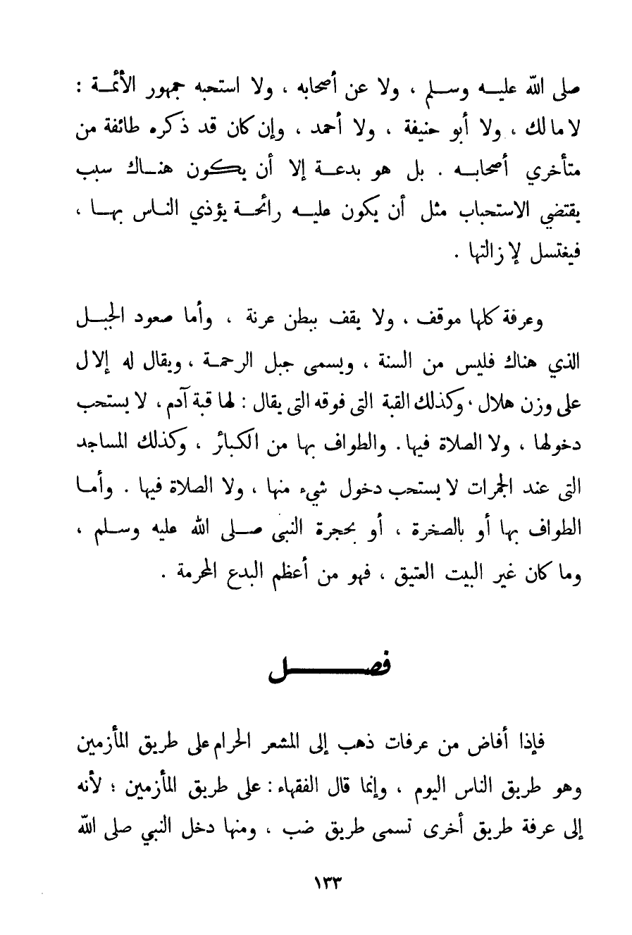 صَلَّى اللَّهُ عَلَيْهِ وَسَلَّمَ وَلَا عَنْ أَصْحَابِهِ وَلَا اسْتَحَبَّهُ جُمْهُورُ الْأَئِمَّةِ: لَا مَالِكٍ وَلَا أَبُو حَنِيفَةَ وَلَا أَحْمَد وَإِنْ كَانَ قَدْ ذَكَرَهُ طَائِفَةٌ مِنْ مُتَأَخِّرِي أَصْحَابِهِ. بَلْ هُوَ بِدْعَةٌ إلَّا أَنْ يَكُونَ هُنَاكَ سَبَبٌ يَقْتَضِي الِاسْتِحْبَابَ مِثْلَ أَنْ يَكُونَ عَلَيْهِ رَائِحَةٌ يُؤْذِي النَّاسَ بِهَا فَيَغْتَسِلُ لِإِزَالَتِهَا. وَعَرَفَةُ كُلُّهَا مَوْقِفٌ وَلَا يَقِفُ بِبَطْنِ عرنة وَأَمَّا صُعُودُ الْجَبَلِ الَّذِي هُنَاكَ فَلَيْسَ مِنْ السُّنَّةِ وَيُسَمَّى جَبَلَ الرَّحْمَةِ وَيُقَالُ لَهُ إلَالٌ عَلَى وَزْنِ هِلَالٍ وَكَذَلِكَ الْقُبَّةُ الَّتِي فَوْقَهُ الَّتِي يُقَالُ لَهَا: قُبَّةُ آدَمَ لَا يُسْتَحَبُّ دُخُولُهَا وَلَا الصَّلَاةُ فِيهَا. وَالطَّوَافُ بِهَا مِنْ الْكَبَائِرِ وَكَذَلِكَ الْمَسَاجِدُ الَّتِي عِنْدَ الْجَمَرَاتِ لَا يُسْتَحَبُّ دُخُولُ شَيْءٍ مِنْهَا وَلَا الصَّلَاةُ فِيهَا. وَأَمَّا الطَّوَافُ بِهَا أَوْ بِالصَّخْرَةِ أَوْ بِحُجْرَةِ النَّبِيِّ صَلَّى اللَّهُ عَلَيْهِ وَسَلَّمَ وَمَا كَانَ غَيْرَ الْبَيْتِ الْعَتِيقِ فَهُوَ مِنْ أَعْظَمِ الْبِدَعِ الْمُحَرَّمَةِ.