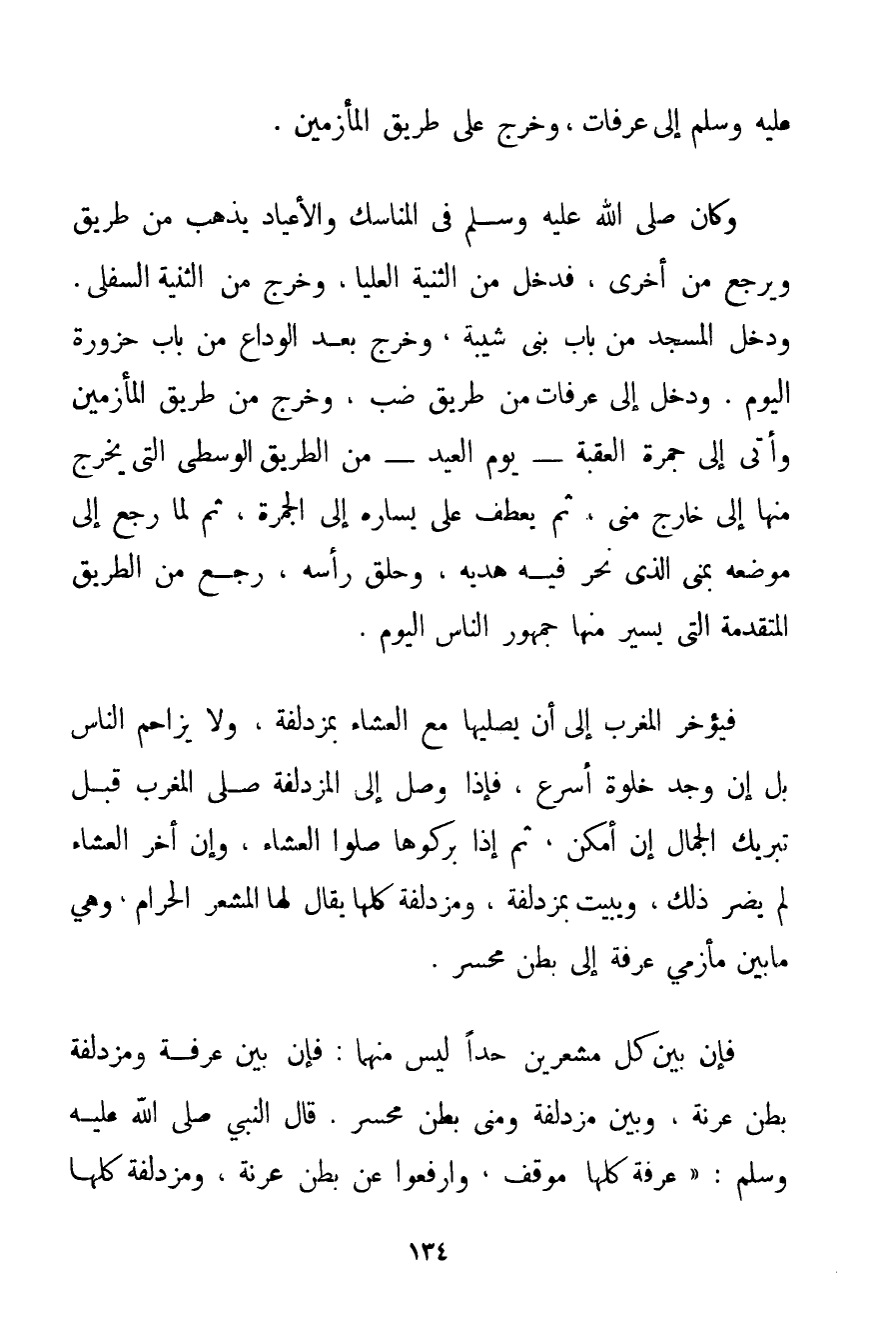 صَلَّى اللَّهُ عَلَيْهِ وَسَلَّمَ إلَى عَرَفَاتٍ وَخَرَجَ عَلَى طَرِيقِ الْمَأْزِمَيْنِ. وَكَانَ صَلَّى اللَّهُ عَلَيْهِ وَسَلَّمَ فِي الْمَنَاسِكِ وَالْأَعْيَادِ يَذْهَبُ مِنْ طَرِيقٍ وَيَرْجِعُ مِنْ أُخْرَى فَدَخَلَ مِنْ الثَّنِيَّةِ الْعُلْيَا وَخَرَجَ مِنْ الثَّنِيَّةِ السُّفْلَى. وَدَخَلَ الْمَسْجِدَ مِنْ بَابِ بَنِي شَيْبَةَ وَخَرَجَ بَعْدَ الْوَدَاعِ مِنْ بَابِ حَزْوَرَةَ الْيَوْمَ. وَدَخَلَ إلَى عَرَفَاتٍ مِنْ طَرِيقِ ضَبٍّ وَخَرَجَ مِنْ طَرِيقِ الْمَأْزِمَيْنِ وَأَتَى إلَى جَمْرَةِ الْعَقَبَةِ - يَوْمَ الْعِيدِ - مِنْ الطَّرِيقِ الْوُسْطَى الَّتِي يَخْرُجُ مِنْهَا إلَى خَارِجِ مِنَى ثُمَّ يَعْطِفُ عَلَى يَسَارِهِ إلَى الْجَمْرَةِ ثُمَّ لَمَّا رَجَعَ إلَى مَوْضِعِهِ بِمِنَى الَّذِي نَحَرَ فِيهِ هَدْيَهُ وَحَلَقَ رَأْسَهُ رَجَعَ مِنْ الطَّرِيقِ الْمُتَقَدِّمَةِ الَّتِي يَسِيرُ مِنْهَا جُمْهُورُ النَّاسِ الْيَوْمَ. فَيُؤَخِّرُ الْمَغْرِبَ إلَى أَنْ يُصَلِّيَهَا مَعَ الْعِشَاءِ بمزدلفة وَلَا يُزَاحِمُ النَّاسَ بَلْ إنْ وَجَدَ خَلْوَةً أَسْرَعَ فَإِذَا وَصَلَ إلَى الْمُزْدَلِفَةِ صَلَّى الْمَغْرِبَ قَبْلَ تَبْرِيكِ الْجِمَالِ إنْ أَمْكَنَ ثُمَّ إذَا بَرَّكُوهَا صَلَّوْا الْعِشَاءَ وَإِنْ أَخَّرَ الْعِشَاءَ لَمْ يَضُرَّ ذَلِكَ وَيَبِيتُ بمزدلفة وَمُزْدَلِفَةُ كُلُّهَا يُقَالُ لَهَا الْمَشْعَرُ الْحَرَامُ وَهِيَ مَا بَيْنَ مَأْزِمَيْ عَرَفَةَ إلَى بَطْنِ مُحَسِّرٍ. فَإِنَّ بَيْنَ كُلِّ مَشْعَرَيْنِ حَدًّا لَيْسَ مِنْهُمَا: فَإِنَّ بَيْنَ عَرَفَةَ وَمُزْدَلِفَةَ بَطْنُ عرنة وَبَيْنَ مُزْدَلِفَةَ وَمِنَى بَطْنُ مُحَسِّرٍ. قَالَ النَّبِيُّ صَلَّى اللَّهُ عَلَيْهِ وَسَلَّمَ {عَرَفَةُ كُلُّهَا مَوْقِفٌ وَارْفَعُوا عَنْ بَطْنِ عرنة وَمُزْدَلِفَةُ كُلُّهَا