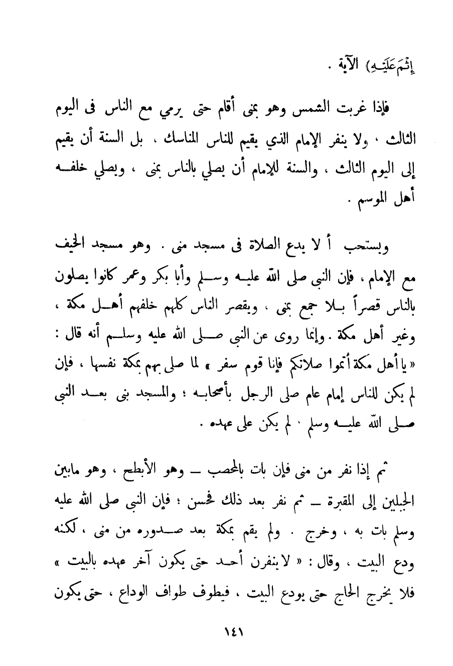 فَلَا إثْمَ عَلَيْهِ} الْآيَةَ. فَإِذَا غَرَبَتْ الشَّمْسُ وَهُوَ بِمِنَى أَقَامَ حَتَّى يَرْمِيَ مَعَ النَّاسِ فِي الْيَوْمِ الثَّالِثِ وَلَا يَنْفِرُ الْإِمَامُ الَّذِي يُقِيمُ لِلنَّاسِ الْمَنَاسِكَ بَلْ السُّنَّةُ أَنْ يُقِيمَ إلَى الْيَوْمِ الثَّالِثِ وَالسُّنَّةُ لِلْإِمَامِ أَنْ يُصَلِّيَ بِالنَّاسِ بِمِنَى وَيُصَلِّيَ خَلْفَهُ أَهْلُ الْمَوْسِمِ. وَيُسْتَحَبُّ أَنْ لَا يَدَعَ الصَّلَاةَ فِي مَسْجِدِ مِنَى. وَهُوَ مَسْجِدُ الْخَيْفِ مَعَ الْإِمَامِ فَإِنَّ النَّبِيَّ صَلَّى اللَّهُ عَلَيْهِ وَسَلَّمَ وَأَبَا بَكْرٍ وَعُمَرَ كَانُوا يُصَلُّونَ بِالنَّاسِ قَصْرًا بِلَا جَمْعٍ بِمِنَى وَيَقْصُرُ النَّاسُ كُلُّهُمْ خَلْفَهُمْ أَهْلُ مَكَّةَ وَغَيْرُ أَهْلِ مَكَّةَ. وَإِنَّمَا رُوِيَ {عن النَّبِيِّ صَلَّى اللَّهُ عَلَيْهِ وَسَلَّمَ أَنَّهُ قَالَ: يَا أَهْلَ مَكَّةَ أَتِمُّوا صَلَاتَكُمْ فَإِنَّا قَوْمٌ سَفْرٌ} لَمَّا صَلَّى بِهِمْ بِمَكَّةَ نَفْسِهَا فَإِنْ لَمْ يَكُنْ لِلنَّاسِ إمَامٌ عَامٌّ صَلَّى الرَّجُلُ بِأَصْحَابِهِ؛ وَالْمَسْجِدُ بُنِيَ بَعْدَ النَّبِيِّ صَلَّى اللَّهُ عَلَيْهِ وَسَلَّمَ لَمْ يَكُنْ عَلَى عَهْدِهِ. ثُمَّ إذَا نَفَرَ مِنْ مِنَى فَإِنْ بَاتَ بِالْمُحَصِّبِ - وَهُوَ الْأَبْطَحُ وَهُوَ مَا بَيْنَ الْجَبَلَيْنِ إلَى الْمَقْبَرَةِ - ثُمَّ نَفَرَ بَعْدَ ذَلِكَ فَحَسَنٌ؛ فَإِنَّ النَّبِيَّ صَلَّى اللَّهُ عَلَيْهِ وَسَلَّمَ بَاتَ بِهِ وَخَرَجَ. وَلَمْ يُقِمْ بِمَكَّةَ بَعْدَ صُدُورِهِ مِنْ مِنَى لَكِنَّهُ وَدَّعَ الْبَيْتَ وَقَالَ: {لَا يَنْفِرَن أَحَدٌ حَتَّى يَكُونَ آخِرُ عَهْدِهِ بِالْبَيْتِ} فَلَا يَخْرُجُ الْحَاجُّ حَتَّى يُوَدِّعَ الْبَيْتَ فَيَطُوفَ طَوَافَ الْوَدَاعِ حَتَّى يَكُونَ