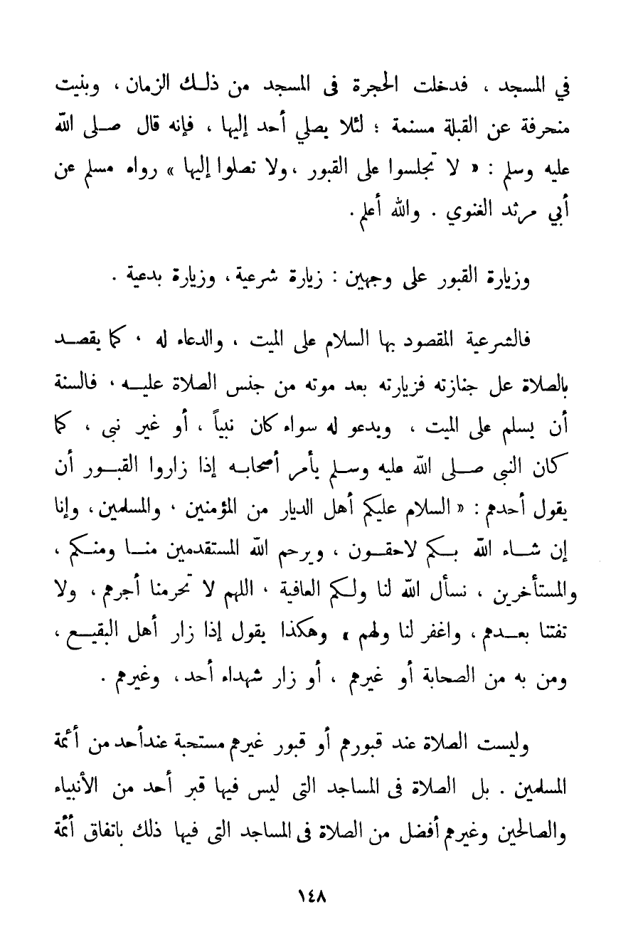 فَالشَّرْعِيَّةُ الْمَقْصُودُ بِهَا السَّلَامُ عَلَى الْمَيِّتِ وَالدُّعَاءُ لَهُ كَمَا يُقْصَدُ بِالصَّلَاةِ عَلَى جِنَازَتِهِ فَزِيَارَتُهُ بَعْدَ مَوْتِهِ مِنْ جِنْسِ الصَّلَاةِ عَلَيْهِ فَالسُّنَّةُ أَنْ يُسَلِّمَ عَلَى الْمَيِّتِ وَيَدْعُوَ لَهُ سَوَاءٌ كَانَ نَبِيًّا أَوْ غَيْرَ نَبِيٍّ كَمَا {كان النَّبِيُّ صَلَّى اللَّهُ عَلَيْهِ وَسَلَّمَ يَأْمُرُ أَصْحَابَهُ إذَا زَارُوا الْقُبُورَ أَنْ يَقُولَ أَحَدُهُمْ: السَّلَامُ عَلَيْكُمْ أَهْلَ الدِّيَارِ مِنْ الْمُؤْمِنِينَ وَالْمُسْلِمِينَ وَإِنَّا إنْ شَاءَ اللَّهُ بِكُمْ لَاحِقُونَ وَيَرْحَمُ اللَّهُ الْمُسْتَقْدِمِينَ مِنَّا وَمِنْكُمْ وَالْمُسْتَأْخِرِين نَسْأَلُ اللَّهَ لَنَا وَلَكُمْ الْعَافِيَةَ اللَّهُمَّ لَا تَحْرِمْنَا أَجْرَهُمْ وَلَا تَفْتِنَّا بَعْدَهُمْ وَاغْفِرْ لَنَا وَلَهُمْ} وَهَكَذَا يَقُولُ إذَا زَارَ أَهْلَ الْبَقِيعِ وَمَنْ بِهِ مِنْ الصَّحَابَةِ أَوْ غَيْرِهِمْ أَوْ زَارَ شُهَدَاءَ أُحُدٍ وَغَيْرَهُمْ. وَلَيْسَتْ الصَّلَاةُ عِنْدَ قُبُورِهِمْ أَوْ قُبُورِ غَيْرِهِمْ مُسْتَحَبَّةً عِنْدَ أَحَدٍ مِنْ أَئِمَّةِ الْمُسْلِمِينَ. بَلْ الصَّلَاةُ فِي الْمَسَاجِدِ الَّتِي لَيْسَ فِيهَا قَبْرُ أَحَدٍ مِنْ الْأَنْبِيَاءِ وَالصَّالِحِينَ وَغَيْرِهِمْ أَفْضَلُ مِنْ الصَّلَاةِ فِي الْمَسَاجِدِ الَّتِي فِيهَا ذَلِكَ بِاتِّفَاقِ أَئِمَّةِ