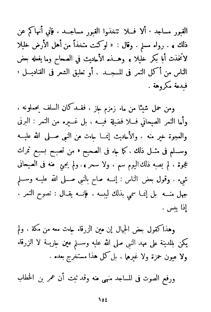 الْقُبُورَ مَسَاجِدَ أَلَا فَلَا تَتَّخِذُوا الْقُبُورَ مَسَاجِدَ فَإِنِّي أَنْهَاكُمْ عَنْ ذَلِكَ} . رَوَاهُ مُسْلِمٌ. وَقَالَ: {لَوْ كُنْت مُتَّخِذًا مِنْ أَهْلِ الْأَرْضِ خَلِيلًا لَاِتَّخَذْت أَبَا بَكْرٍ خَلِيلًا} وَهَذِهِ الْأَحَادِيثُ فِي الصِّحَاحِ وَمَا يَفْعَلُهُ بَعْضُ النَّاسِ مِنْ أَكْلِ التَّمْرِ فِي الْمَسْجِدِ أَوْ تَعْلِيقِ الشَّعْرِ فِي الْقَنَادِيلِ؛ فَبِدْعَةٌ مَكْرُوهَةٌ.