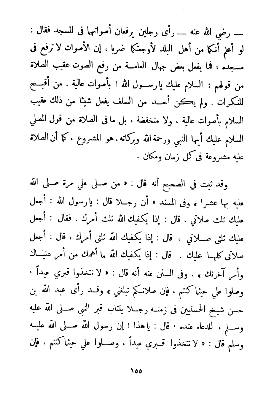 - رَضِيَ اللَّهُ عَنْهُ - رَأَى رَجُلَيْنِ يَرْفَعَانِ أَصْوَاتَهُمَا فِي الْمَسْجِدِ فَقَالَ: لَوْ أَعْلَمُ أَنَّكُمَا مِنْ أَهْلِ الْبَلَدِ لَأَوْجَعْتُكُمَا ضَرْبًا إنَّ الْأَصْوَاتَ لَا تُرْفَعُ فِي مَسْجِدِهِ؛ فَمَا يَفْعَلُ بَعْضُ جُهَّالِ الْعَامَّةِ مِنْ رَفْعِ الصَّوْتِ عَقِيبَ الصَّلَاةِ مِنْ قَوْلِهِمْ: السَّلَامُ عَلَيْك يَا رَسُولَ اللَّهِ بِأَصْوَاتِ عَالِيَةٍ. مِنْ أَقْبَحِ الْمُنْكَرَاتِ. وَلَمْ يَكُنْ أَحَدٌ مِنْ السَّلَفِ يَفْعَلُ شَيْئًا مِنْ ذَلِكَ عَقِيبَ السَّلَامِ بِأَصْوَاتِ عَالِيَةٍ وَلَا مُنْخَفِضَةٍ بَلْ مَا فِي الصَّلَاةِ مِنْ قَوْلِ الْمُصَلِّي السَّلَامُ عَلَيْك أَيُّهَا النَّبِيُّ وَرَحْمَةُ اللَّهِ وَبَرَكَاتُهُ هُوَ الْمَشْرُوعُ كَمَا أَنَّ الصَّلَاةَ عَلَيْهِ مَشْرُوعَةٌ فِي كُلِّ زَمَانٍ وَمَكَانٍ. وَقَدْ ثَبَتَ فِي الصَّحِيحِ أَنَّهُ قَالَ: {مَنْ صَلَّى عَلَيَّ مَرَّةً صَلَّى اللَّهُ عَلَيْهِ بِهَا عَشْرًا} وَفِي الْمُسْنَدِ {أَنَّ رَجُلًا قَالَ: يَا رَسُولَ اللَّهِ: أَجْعَلُ عَلَيْك ثُلُثَ صَلَاتِي قَالَ: إذًا يَكْفِيك اللَّهُ ثُلُثَ أَمْرِك قَالَ: أَجْعَلُ عَلَيْك ثُلُثَيْ صَلَاتِي قَالَ: إذًا يَكْفِيك اللَّهُ ثُلُثَيْ أَمْرِك قَالَ: أَجْعَلُ صَلَاتِي كُلَّهَا عَلَيْك قَالَ: إذًا يَكْفِيك اللَّهُ مَا أَهَمَّك مِنْ أَمْرِ دُنْيَاك وَأَمْرِ آخِرَتِك} . وَفِي السُّنَنِ عَنْهُ أَنَّهُ قَالَ: {لَا تَتَّخِذُوا قَبْرِي عِيدًا وَصَلُّوا عَلَيَّ حَيْثُمَا كُنْتُمْ فَإِنَّ صَلَاتَكُمْ تَبْلُغُنِي} وَقَدْ رَأَى عَبْدُ اللَّهِ بْنُ حَسَنٍ شَيْخُ الحسنيين فِي زَمَنِهِ رَجُلًا يَنْتَابُ قَبْرَ النَّبِيِّ صَلَّى اللَّهُ عَلَيْهِ وَسَلَّمَ لِلدُّعَاءِ عِنْدَهُ قَالَ: يَا هَذَا إنَّ رَسُولَ اللَّهِ صَلَّى اللَّهُ عَلَيْهِ وَسَلَّمَ قَالَ: {لَا تَتَّخِذُوا قَبْرِي عِيدًا وَصَلُّوا عَلَيَّ حَيْثُمَا كُنْتُمْ فَإِنَّ