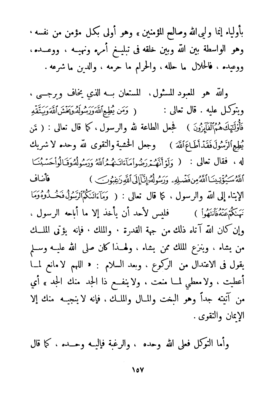 بأولياء إنَّمَا وَلِيِّي اللَّهُ وَصَالِحُ الْمُؤْمِنِينَ} وَهُوَ أَوْلَى بِكُلِّ مُؤْمِنٍ مِنْ نَفْسِهِ وَهُوَ الْوَاسِطَةُ بَيْنَ اللَّهِ وَبَيْنَ خَلْقِهِ فِي تَبْلِيغِ أَمْرِهِ وَنَهْيِهِ وَوَعْدِهِ وَوَعِيدِهِ فَالْحَلَالُ مَا حَلَّلَهُ وَالْحَرَامُ مَا حَرَّمَهُ وَالدِّينُ مَا شَرَعَهُ. وَاَللَّهُ هُوَ الْمَعْبُودُ الْمَسْئُولُ الْمُسْتَعَانُ بِهِ الَّذِي يُخَافُ وَيُرْجَى وَيُتَوَكَّلُ عَلَيْهِ. قَالَ تَعَالَى: {وَمَنْ يُطِعِ اللَّهَ وَرَسُولَهُ وَيَخْشَ اللَّهَ وَيَتَّقْهِ فَأُولَئِكَ هُمُ الْفَائِزُونَ} فَجَعَلَ الطَّاعَةَ لِلَّهِ وَالرَّسُولِ كَمَا قَالَ تَعَالَى: {مَنْ يُطِعِ الرَّسُولَ فَقَدْ أَطَاعَ اللَّهَ} وَجَعَلَ الْخَشْيَةَ وَالتَّقْوَى لِلَّهِ وَحْدَهُ لَا شَرِيكَ لَهُ فَقَالَ تَعَالَى: {وَلَوْ أَنَّهُمْ رَضُوا مَا آتَاهُمُ اللَّهُ وَرَسُولُهُ وَقَالُوا حَسْبُنَا اللَّهُ سَيُؤْتِينَا اللَّهُ مِنْ فَضْلِهِ وَرَسُولُهُ إنَّا إلَى اللَّهِ رَاغِبُونَ} فَأَضَافَ الْإِيتَاءَ إلَى اللَّهِ وَالرَّسُولِ كَمَا قَالَ تَعَالَى: {وَمَا آتَاكُمُ الرَّسُولُ فَخُذُوهُ وَمَا نَهَاكُمْ عَنْهُ فَانْتَهُوا} فَلَيْسَ لِأَحَدِ أَنْ يَأْخُذَ إلَّا مَا أَبَاحَهُ الرَّسُولُ وَإِنْ كَانَ اللَّهُ آتَاهُ ذَلِكَ مِنْ جِهَةِ الْقُدْرَةِ وَالْمُلْكِ فَإِنَّهُ يُؤْتِي الْمُلْكَ مَنْ يَشَاءُ وَيَنْزِعُ الْمُلْكَ مِمَّنْ يَشَاءُ وَلِهَذَا {كان صَلَّى اللَّهُ عَلَيْهِ وَسَلَّمَ يَقُولُ فِي الِاعْتِدَالِ مِنْ الرُّكُوعِ وَبَعْدَ السَّلَامِ: اللَّهُمَّ لَا مَانِعَ لِمَا أَعْطَيْت وَلَا مُعْطِيَ لِمَا مَنَعْت وَلَا يَنْفَعُ ذَا الْجَدِّ مِنْك الْجَدُّ} أَيْ مَنْ آتَيْته جَدًّا وَهُوَ الْبَخْتُ وَالْمَالُ وَالْمُلْكُ فَإِنَّهُ لَا يُنْجِيهِ مِنْك إلَّا الْإِيمَانُ وَالتَّقْوَى. وَأَمَّا التَّوَكُّلُ فَعَلَى اللَّهِ وَحْدَهُ وَالرَّغْبَةُ فَإِلَيْهِ وَحْدَهُ كَمَا قَالَ