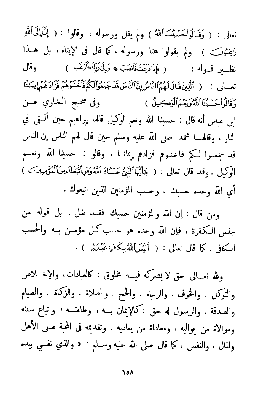 تَعَالَى: {وَقَالُوا حَسْبُنَا اللَّهُ} وَلَمْ يَقُلْ وَرَسُولُهُ وَقَالُوا: {إنَّا إلَى اللَّهِ رَاغِبُونَ} وَلَمْ يَقُولُوا هُنَا وَرَسُولُهُ كَمَا قَالَ فِي الْإِيتَاءِ بَلْ هَذَا نَظِيرُ قَوْلِهِ: {فَإِذَا فَرَغْتَ فَانْصَبْ} {وَإِلَى رَبِّكَ فَارْغَبْ} وَقَالَ تَعَالَى: {الَّذِينَ قَالَ لَهُمُ النَّاسُ إنَّ النَّاسَ قَدْ جَمَعُوا لَكُمْ فَاخْشَوْهُمْ فَزَادَهُمْ إيمَانًا وَقَالُوا حَسْبُنَا اللَّهُ وَنِعْمَ الْوَكِيلُ} وَفِي صَحِيحِ الْبُخَارِيِّ عَنْ ابْنِ عَبَّاسٍ أَنَّهُ قَالَ: حَسْبُنَا اللَّهُ وَنِعْمَ الْوَكِيلُ قَالَهَا إبْرَاهِيمُ حِينَ أُلْقِيَ فِي النَّارِ وَقَالَهَا مُحَمَّدٌ صَلَّى اللَّهُ عَلَيْهِ وَسَلَّمَ حِينَ قَالَ لَهُمْ النَّاسُ إنَّ النَّاسَ قَدْ جَمَعُوا لَكُمْ فَاخْشَوْهُمْ فَزَادَهُمْ إيمَانًا وَقَالُوا: حَسْبُنَا اللَّهُ وَنِعْمَ الْوَكِيلُ. وَقَدْ قَالَ تَعَالَى: {يَا أَيُّهَا النَّبِيُّ حَسْبُكَ اللَّهُ وَمَنِ اتَّبَعَكَ مِنَ الْمُؤْمِنِينَ} أَيْ اللَّهُ وَحْدَهُ حَسْبُك وَحَسْبُ الْمُؤْمِنِينَ الَّذِينَ اتَّبَعُوك. وَمَنْ قَالَ: إنَّ اللَّهَ وَالْمُؤْمِنِينَ حَسْبُك فَقَدْ ضَلَّ بَلْ قَوْلُهُ مِنْ جِنْسِ الْكَفَرَةِ فَإِنَّ اللَّهَ وَحْدَهُ هُوَ حَسْبُ كُلِّ مُؤْمِنٍ بِهِ والحسب الْكَافِي كَمَا قَالَ تَعَالَى: {أَلَيْسَ اللَّهُ بِكَافٍ عَبْدَهُ} . وَلِلَّهِ تَعَالَى حَقٌّ لَا يَشْرَكُهُ فِيهِ مَخْلُوقٌ. كَالْعِبَادَاتِ وَالْإِخْلَاصِ وَالتَّوَكُّلِ. وَالْخَوْفِ. وَالرَّجَاءِ. وَالْحَجِّ. وَالصَّلَاةِ. وَالزَّكَاةِ. وَالصِّيَامِ وَالصَّدَقَةِ. وَالرَّسُولُ لَهُ حَقٌّ: كَالْإِيمَانِ بِهِ وَطَاعَتِهِ وَاتِّبَاعِ سُنَّتِهِ وَمُوَالَاةِ مَنْ يُوَالِيهِ وَمُعَادَاةِ مَنْ يُعَادِيهِ وَتَقْدِيمِهِ فِي الْمَحَبَّةِ عَلَى الْأَهْلِ وَالْمَالِ وَالنَّفْسِ كَمَا {قال صَلَّى اللَّهُ عَلَيْهِ وَسَلَّمَ وَاَلَّذِي نَفْسِي بِيَدِهِ