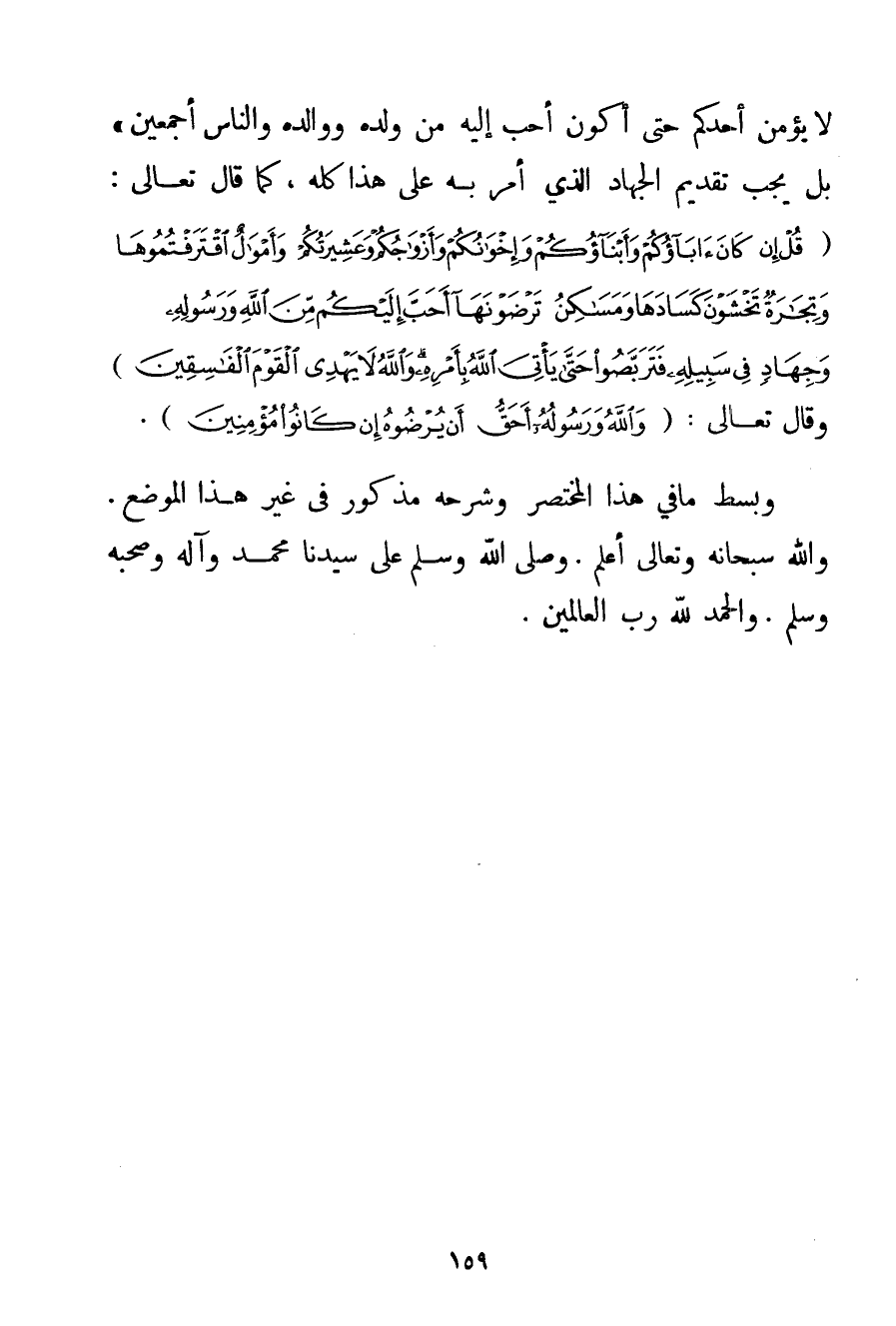 لَا يُؤْمِنُ أَحَدُكُمْ حَتَّى أَكُونَ أَحَبَّ إلَيْهِ مِنْ وَلَدِهِ وَوَالِدِهِ وَالنَّاسِ أَجْمَعِينَ} بَلْ يَجِبُ تَقْدِيمُ الْجِهَادِ الَّذِي أَمَرَ بِهِ عَلَى هَذَا كُلِّهِ كَمَا قَالَ تَعَالَى: {قُلْ إنْ كَانَ آبَاؤُكُمْ وَأَبْنَاؤُكُمْ وَإِخْوَانُكُمْ وَأَزْوَاجُكُمْ وَعَشِيرَتُكُمْ وَأَمْوَالٌ اقْتَرَفْتُمُوهَا وَتِجَارَةٌ تَخْشَوْنَ كَسَادَهَا وَمَسَاكِنُ تَرْضَوْنَهَا أَحَبَّ إلَيْكُمْ مِنَ اللَّهِ وَرَسُولِهِ وَجِهَادٍ فِي سَبِيلِهِ فَتَرَبَّصُوا حَتَّى يَأْتِيَ اللَّهُ بِأَمْرِهِ وَاللَّهُ لَا يَهْدِي الْقَوْمَ الْفَاسِقِينَ} وَقَالَ تَعَالَى: {وَاللَّهُ وَرَسُولُهُ أَحَقُّ أَنْ يُرْضُوهُ إنْ كَانُوا مُؤْمِنِينَ} . وَبَسْطُ مَا فِي هَذَا الْمُخْتَصَرِ وَشَرْحُهُ مَذْكُورٌ فِي غَيْرِ هَذَا الْمَوْضِعِ. وَاَللَّهُ سُبْحَانَهُ وَتَعَالَى أَعْلَمُ. وَصَلَّى اللَّهُ وَسَلَّمَ عَلَى سَيِّدِنَا مُحَمَّدٍ وَآلِهِ وَصَحْبِهِ وَسَلَّمَ. وَالْحَمْدُ لِلَّهِ رَبِّ الْعَالَمِينَ.