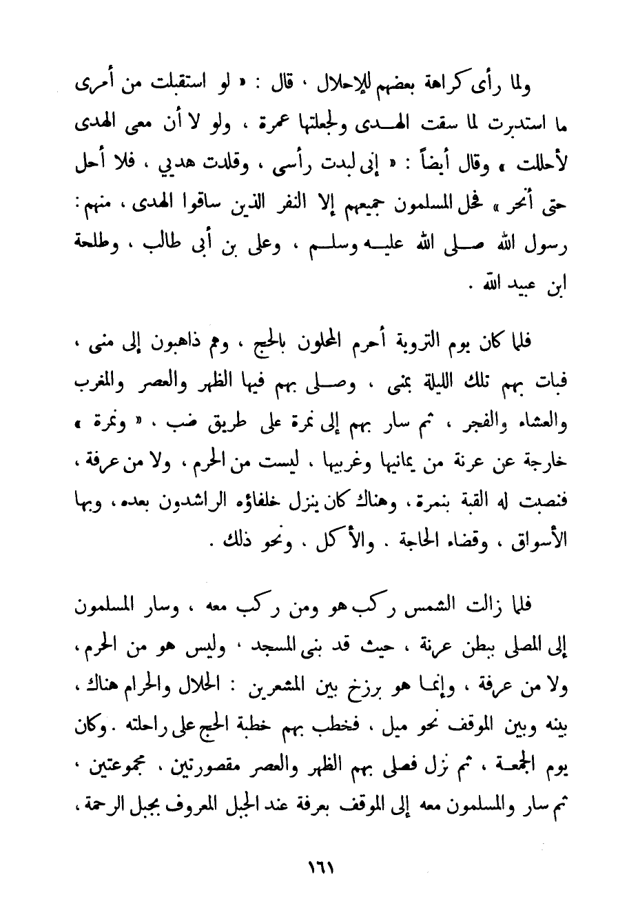 وَلَمَّا رَأَى كَرَاهَةَ بَعْضِهِمْ لِلْإِحْلَالِ قَالَ: {لَوْ اسْتَقْبَلْت مِنْ أَمْرِي مَا اسْتَدْبَرْت لَمَا سُقْت الْهَدْيَ وَلَجَعَلْتهَا عُمْرَةً وَلَوْلَا أَنَّ مَعِي الْهَدْيَ لَأَحْلَلْت} وَقَالَ أَيْضًا: {إنِّي لَبَّدْت رَأْسِي وَقَلَّدْت هَدْيِي فَلَا أَحِلُّ حَتَّى أَنْحَرَ} فَحَلَّ الْمُسْلِمُونَ جَمِيعُهُمْ إلَّا النَّفَرَ الَّذِينَ سَاقُوا الْهَدْيَ مِنْهُمْ: رَسُولُ اللَّهِ صَلَّى اللَّهُ عَلَيْهِ وَسَلَّمَ وَعَلِيُّ بْنُ أَبِي طَالِبٍ وَطِلْحَةُ بْنُ عُبَيْدِ اللَّهِ. فَلَمَّا كَانَ يَوْمُ التَّرْوِيَةِ أَحْرَمَ الْمُحِلُّونَ بِالْحَجِّ وَهُمْ ذَاهِبُونَ إلَى مِنَى فَبَاتَ بِهِمْ تِلْكَ اللَّيْلَةَ بِمِنَى وَصَلَّى بِهِمْ فِيهَا الظُّهْر وَالْعَصْرَ وَالْمَغْرِبَ وَالْعِشَاءَ وَالْفَجْرَ ثُمَّ سَارَ بِهِمْ إلَى نَمِرَةَ عَلَى طَرِيقِ ضَبٍّ " وَنَمِرَةُ " خَارِجَةٌ عَنْ عرنة مِنْ يَمَانِيِّهَا وَغَرْبِيِّهَا لَيْسَتْ مِنْ الْحَرَمِ وَلَا مِنْ عَرَفَةَ فَنُصِبَتْ لَهُ الْقُبَّةُ بنمرة وَهُنَاكَ كَانَ يَنْزِلُ خُلَفَاؤُهُ الرَّاشِدُونَ بَعْدَهُ وَبِهَا الْأَسْوَاقُ وَقَضَاءُ الْحَاجَةِ وَالْأَكْلُ وَنَحْوُ ذَلِكَ. فَلَمَّا زَالَتْ الشَّمْسُ رَكِبَ هُوَ وَمَنْ رَكِبَ مَعَهُ وَسَارَ الْمُسْلِمُونَ إلَى الْمُصَلَّى بِبَطْنِ عرنة حَيْثُ قَدْ بُنِيَ الْمَسْجِدُ وَلَيْسَ هُوَ مِنْ الْحَرَمِ وَلَا مِنْ عَرَفَةَ وَإِنَّمَا هُوَ بَرْزَخٌ بَيْنَ الْمَشْعَرَيْنِ: الْحَلَالِ وَالْحَرَامِ هُنَاكَ بَيْنَهُ وَبَيْنَ الْمَوْقِفِ نَحْوُ مِيلٍ فَخَطَبَ بِهِمْ خُطْبَةَ الْحَجِّ عَلَى رَاحِلَتِهِ. وَكَانَ يَوْمَ الْجُمُعَةِ ثُمَّ نَزَلَ فَصَلَّى بِهِمْ الظُّهْر وَالْعَصْرَ مَقْصُورَتَيْنِ مَجْمُوعَتَيْنِ ثُمَّ سَارَ وَالْمُسْلِمُونَ مَعَهُ إلَى الْمَوْقِفِ بِعَرَفَةَ عِنْدَ الْجَبَلِ الْمَعْرُوفِ بِجَبَلِ الرَّحْمَةِ