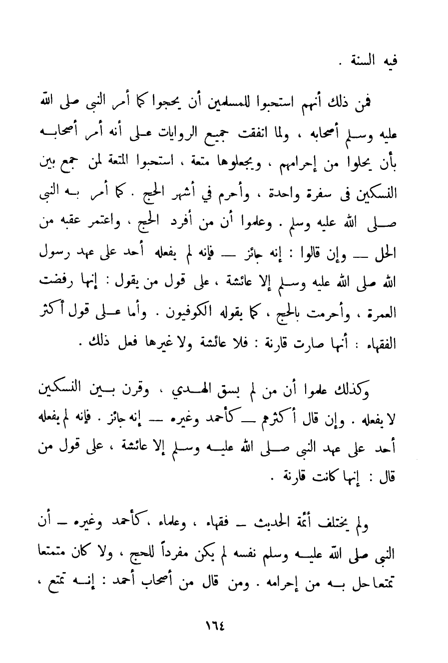 فِيهِ السُّنَّةُ. فَمِنْ ذَلِكَ أَنَّهُمْ اسْتَحَبُّوا لِلْمُسْلِمِينَ أَنْ يَحُجُّوا كَمَا أَمَرَ النَّبِيُّ صَلَّى اللَّهُ عَلَيْهِ وَسَلَّمَ أَصْحَابَهُ وَلَمَّا اتَّفَقَتْ جَمِيعُ الرِّوَايَاتِ عَلَى أَنَّهُ أَمَرَ أَصْحَابَهُ بِأَنْ يُحِلُّوا مِنْ إحْرَامِهِمْ وَيَجْعَلُوهَا مُتْعَةً اسْتَحَبُّوا الْمُتْعَةَ لِمَنْ جَمَعَ بَيْنَ النسكين فِي سَفْرَةٍ وَاحِدَةٍ وَأَحْرَمَ فِي أَشْهُرِ الْحَجِّ. كَمَا أَمَرَ بِهِ النَّبِيُّ صَلَّى اللَّهُ عَلَيْهِ وَسَلَّمَ. وَعَلِمُوا أَنَّ مَنْ أَفْرَدَ الْحَجَّ وَاعْتَمَرَ عَقِبَهُ مِنْ الْحِلِّ - وَإِنْ قَالُوا: إنَّهُ جَائِزٌ - فَإِنَّهُ لَمْ يَفْعَلْهُ أَحَدٌ عَلَى عَهْدِ رَسُولِ اللَّهِ صَلَّى اللَّهُ عَلَيْهِ وَسَلَّمَ إلَّا عَائِشَةَ عَلَى قَوْلِ مَنْ يَقُولُ: إنَّهَا رَفَضَتْ الْعُمْرَةَ وَأَحْرَمَتْ بِالْحَجِّ كَمَا يَقُولُهُ الْكُوفِيُّونَ. وَأَمَّا عَلَى قَوْلِ أَكْثَرِ الْفُقَهَاءِ: أَنَّهَا صَارَتْ قَارِنَةً: فَلَا عَائِشَةُ وَلَا غَيْرُهَا فَعَلَ ذَلِكَ. وَكَذَلِكَ عَلِمُوا أَنَّ مَنْ لَمْ يَسُقْ الْهَدْيَ. وَقَرَنَ بَيْنَ النسكين لَا يَفْعَلُهُ. وَإِنْ قَالَ أَكْثَرُهُمْ - كَأَحْمَدَ وَغَيْرِهِ - إنَّهُ جَائِزٌ. فَإِنَّهُ لَمْ يَفْعَلْهُ أَحَدٌ عَلَى عَهْدِ النَّبِيِّ صَلَّى اللَّهُ عَلَيْهِ وَسَلَّمَ إلَّا عَائِشَةَ عَلَى قَوْلِ مَنْ قَالَ: إنَّهَا كَانَتْ قَارِنَةً. وَلَمْ يَخْتَلِفْ أَئِمَّةُ الْحَدِيثِ - فُقَهَاءَ وَعُلَمَاءَ كَأَحْمَدَ وَغَيْرِهِ - أَنَّ النَّبِيَّ صَلَّى اللَّهُ عَلَيْهِ وَسَلَّمَ نَفْسَهُ لَمْ يَكُنْ مُفْرِدًا لِلْحَجِّ وَلَا كَانَ مُتَمَتِّعًا تَمَتُّعًا حَلَّ بِهِ مِنْ إحْرَامِهِ. وَمَنْ قَالَ مِنْ أَصْحَابِ أَحْمَد: إنَّهُ تَمَتَّعَ
