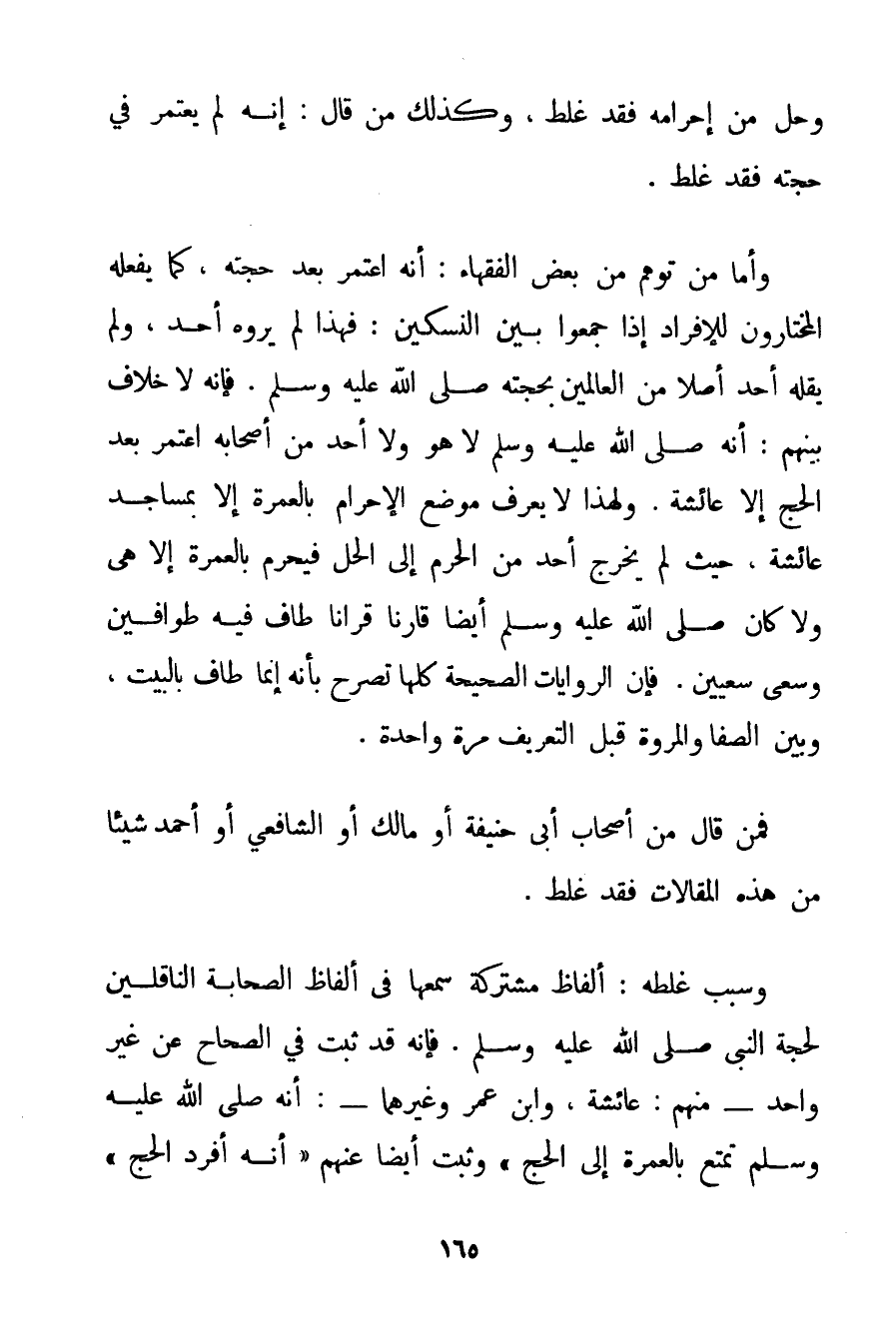 وَحَلَّ مِنْ إحْرَامِهِ فَقَدْ غَلِطَ وَكَذَلِكَ مَنْ قَالَ: إنَّهُ لَمْ يَعْتَمِرْ فِي حَجَّتِهِ فَقَدْ غَلِطَ. وَأَمَّا مَنْ تَوَهَّمَ مِنْ بَعْضِ الْفُقَهَاءِ: أَنَّهُ اعْتَمَرَ بَعْدَ حَجَّتِهِ كَمَا يَفْعَلُهُ الْمُخْتَارُونَ لِلْإِفْرَادِ إذَا جَمَعُوا بَيْنَ النسكين: فَهَذَا لَمْ يَرْوِهِ أَحَدٌ وَلَمْ يَقُلْهُ أَحَدٌ أَصْلًا مِنْ الْعَالِمِينَ بِحَجَّتِهِ صَلَّى اللَّهُ عَلَيْهِ وَسَلَّمَ. فَإِنَّهُ لَا خِلَافَ بَيْنَهُمْ: أَنَّهُ صَلَّى اللَّهُ عَلَيْهِ وَسَلَّمَ لَا هُوَ وَلَا أَحَدٌ مِنْ أَصْحَابِهِ اعْتَمَرَ بَعْدَ الْحَجِّ إلَّا عَائِشَةَ. وَلِهَذَا لَا يُعْرَفُ مَوْضِعُ الْإِحْرَامِ بِالْعُمْرَةِ إلَّا بِمَسَاجِدِ عَائِشَةَ حَيْثُ لَمْ يَخْرُجْ أَحَدٌ مِنْ الْحَرَمِ إلَى الْحِلِّ فَيُحْرِمْ بِالْعُمْرَةِ إلَّا هِيَ وَلَا كَانَ صَلَّى اللَّهُ عَلَيْهِ وَسَلَّمَ أَيْضًا قَارِنًا قِرَانًا طَافَ فِيهِ طَوَافَيْنِ وَسَعَى سعيين. فَإِنَّ الرِّوَايَاتِ الصَّحِيحَةَ كُلَّهَا تُصَرِّحُ بِأَنَّهُ إنَّمَا طَافَ بِالْبَيْتِ وَبَيْنَ الصَّفَا وَالْمَرْوَةِ قَبْلَ التَّعْرِيفِ مَرَّةٍ وَاحِدَةٍ. فَمَنْ قَالَ مِنْ أَصْحَابِ أَبِي حَنِيفَةَ أَوْ مَالِكٍ أَوْ الشَّافِعِيِّ أَوْ أَحْمَد شَيْئًا مِنْ هَذِهِ الْمَقَالَاتِ فَقَدْ غَلِطَ. وَسَبَبُ غَلَطِهِ: أَلْفَاظٌ مُشْتَرَكَةٌ سَمِعَهَا فِي أَلْفَاظِ الصَّحَابَةِ النَّاقِلِينَ لَحَجَّةِ النَّبِيِّ صَلَّى اللَّهُ عَلَيْهِ وَسَلَّمَ. فَإِنَّهُ قَدْ ثَبَتَ فِي الصِّحَاحِ عَنْ غَيْرِ وَاحِدٍ - مِنْهُمْ: عَائِشَةُ وَابْنُ عُمَرَ وَغَيْرُهُمَا -: {أَنَّهُ صَلَّى اللَّهُ عَلَيْهِ وَسَلَّمَ تَمَتَّعَ بِالْعُمْرَةِ إلَى الْحَجِّ} وَثَبَتَ أَيْضًا عَنْهُمْ {أَنَّهُ أَفْرَدَ الْحَجَّ}