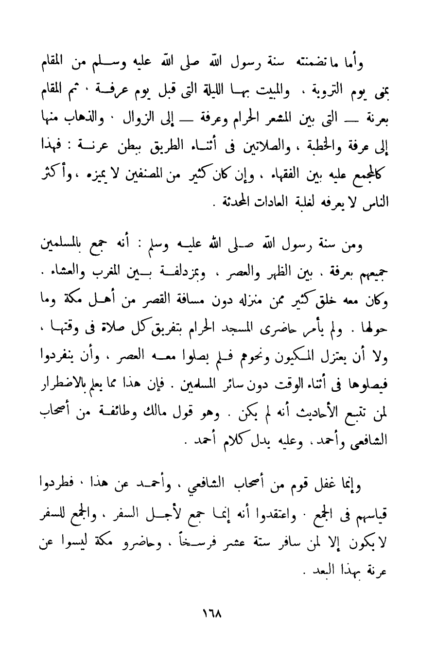 وَأَمَّا مَا تَضَمَّنَتْهُ سُنَّةُ رَسُولِ اللَّهِ صَلَّى اللَّهُ عَلَيْهِ وَسَلَّمَ مِنْ الْمُقَامِ بِمِنَى يَوْمَ التَّرْوِيَةِ وَالْمَبِيتِ بِهَا اللَّيْلَةَ الَّتِي قَبْلَ يَوْمِ عَرَفَةَ. ثُمَّ الْمُقَامِ بعرنة - الَّتِي بَيْنَ الْمَشْعَرِ الْحَرَامِ وَعَرَفَةَ - إلَى الزَّوَالِ. وَالذَّهَابِ مِنْهَا إلَى عَرَفَةَ وَالْخُطْبَةِ وَالصَّلَاتَيْنِ فِي أَثْنَاءِ الطَّرِيقِ بِبَطْنِ عرنة: فَهَذَا كَالْمُجْمَعِ عَلَيْهِ بَيْنَ الْفُقَهَاءِ وَإِنْ كَانَ كَثِيرٌ مِنْ الْمُصَنِّفِينَ لَا يُمَيِّزُهُ وَأَكْثَرُ النَّاسِ لَا يَعْرِفُهُ لِغَلَبَةِ الْعَادَاتِ الْمُحْدَثَةِ. وَمِنْ سُنَّةِ رَسُولِ اللَّهِ صَلَّى اللَّهُ عَلَيْهِ وَسَلَّمَ أَنَّهُ جَمَعَ بِالْمُسْلِمِينَ جَمِيعِهِمْ بِعَرَفَةَ بَيْنَ الظُّهْر وَالْعَصْرِ وبمزدلفة بَيْنَ الْمَغْرِبِ وَالْعِشَاءِ. وَكَانَ مَعَهُ خَلْقٌ كَثِيرٌ مِمَّنْ مَنْزِلُهُ دُونَ مَسَافَةِ الْقَصْرِ مِنْ أَهْلِ مَكَّةَ وَمَا حَوْلَهَا. وَلَمْ يَأْمُرْ حَاضِرِي الْمَسْجِدِ الْحَرَامِ بِتَفْرِيقِ كُلِّ صَلَاةٍ فِي وَقْتِهَا وَلَا أَنْ يَعْتَزِلَ الْمَكِّيُّونَ وَنَحْوُهُمْ فَلَمْ يُصَلُّوا مَعَهُ الْعَصْرَ وَأَنْ يَنْفَرِدُوا فَيُصَلُّوهَا فِي أَثْنَاءِ الْوَقْتِ دُونَ سَائِرِ الْمُسْلِمِينَ. فَإِنَّ هَذَا مِمَّا يُعْلَمُ بِالِاضْطِرَارِ لِمَنْ تَتَبَّعَ الْأَحَادِيثَ أَنَّهُ لَمْ يَكُنْ. وَهُوَ قَوْلُ مَالِكٍ وَطَائِفَةٍ مِنْ أَصْحَابِ الشَّافِعِيِّ وَأَحْمَد وَعَلَيْهِ يَدُلُّ كَلَامُ أَحْمَد. وَإِنَّمَا غَفَلَ قَوْمٌ مِنْ أَصْحَابِ الشَّافِعِيِّ وَأَحْمَد عَنْ هَذَا فَطَرَدُوا قِيَاسَهُمْ فِي الْجَمْعِ. وَاعْتَقَدُوا أَنَّهُ إنَّمَا جَمَعَ لِأَجْلِ السَّفَرِ وَالْجَمْعُ لِلسَّفَرِ لَا يَكُونُ إلَّا لِمَنْ سَافَرَ سِتَّةَ عَشَرَ فَرْسَخًا وَحَاضِرُوا مَكَّةَ لَيْسُوا عَنْ عرنة بِهَذَا الْبُعْدِ.