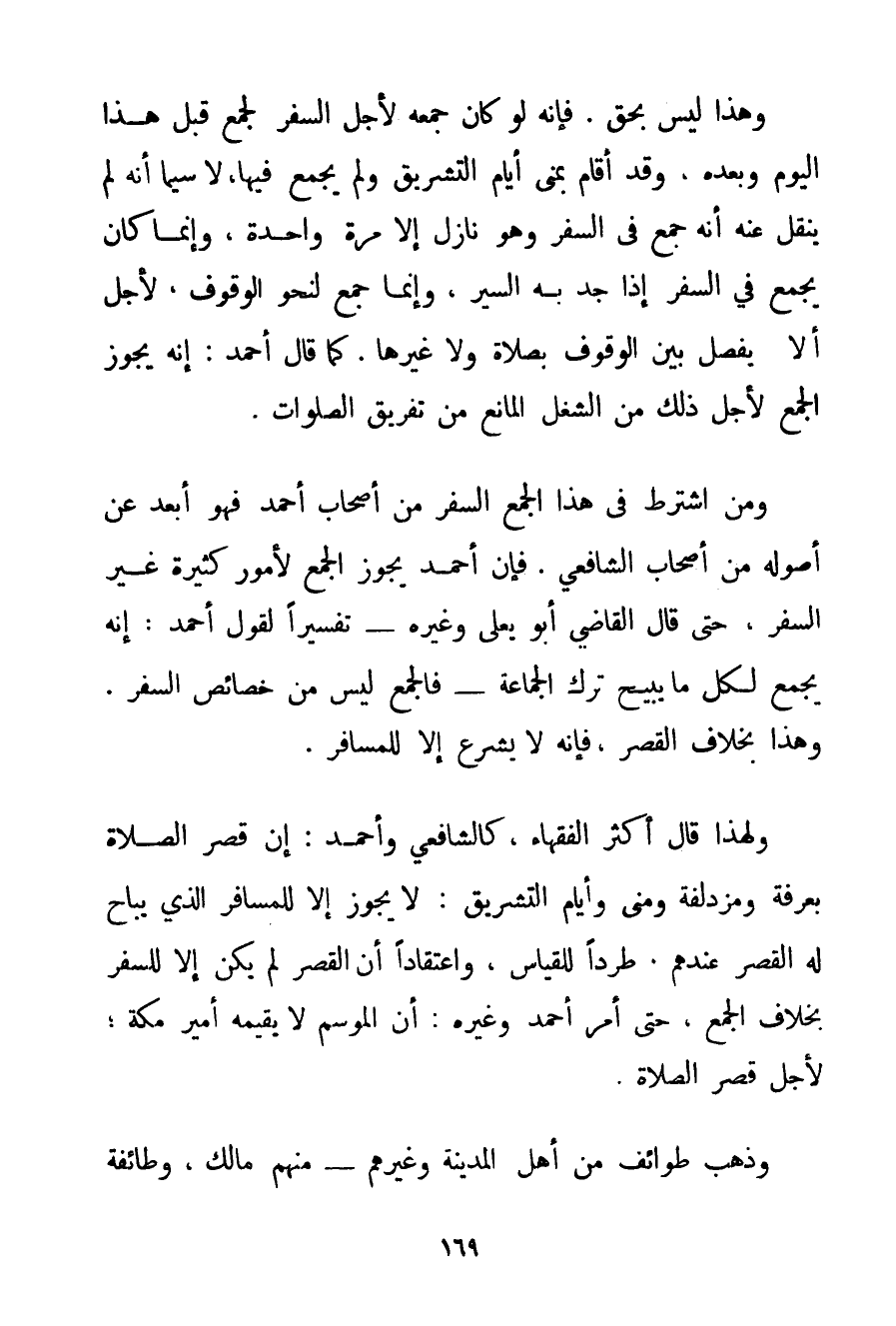 وَهَذَا لَيْسَ بِحَقِّ. فَإِنَّهُ لَوْ كَانَ جَمْعُهُ لِأَجْلِ السَّفَرِ لَجَمَعَ قَبْلَ هَذَا الْيَوْمِ وَبَعْدَهُ. وَقَدْ أَقَامَ بِمِنَى أَيَّامَ التَّشْرِيقِ وَلَمْ يَجْمَعْ فِيهَا لَا سِيَّمَا أَنَّهُ لَمْ يُنْقَلْ عَنْهُ أَنَّهُ جَمَعَ فِي السَّفَرِ وَهُوَ نَازِلٌ إلَّا مَرَّةً وَاحِدَةً وَإِنَّمَا كَانَ يَجْمَعُ فِي السَّفَرِ إذَا جَدَّ بِهِ السَّيْرُ وَإِنَّمَا جَمَعَ لِنَحْوِ الْوُقُوفِ لِأَجْلِ أَلَّا يَفْصِلَ بَيْنَ الْوُقُوفِ بِصَلَاةِ وَلَا غَيْرِهَا. كَمَا قَالَ أَحْمَد: إنَّهُ يَجُوزُ الْجَمْعُ لِأَجْلِ ذَلِكَ مِنْ الشُّغْلِ الْمَانِعِ مِنْ تَفْرِيقِ الصَّلَوَاتِ. وَمَنْ اشْتَرَطَ فِي هَذَا الْجَمْعِ السَّفَرَ مِنْ أَصْحَابِ أَحْمَد فَهُوَ أَبْعَدُ عَنْ أُصُولِهِ مِنْ أَصْحَابِ الشَّافِعِيِّ. فَإِنَّ أَحْمَد يُجَوِّزُ الْجَمْعَ لِأُمُورِ كَثِيرَةٍ غَيْرِ السَّفَرِ حَتَّى قَالَ الْقَاضِي أَبُو يَعْلَى وَغَيْرُهُ - تَفْسِيرًا لِقَوْلِ أَحْمَد: إنَّهُ يَجْمَعُ لِكُلِّ مَا يُبِيحُ تَرْكَ الْجَمَاعَةِ - فَالْجَمْعُ لَيْسَ مِنْ خَصَائِصِ السَّفَرِ. وَهَذَا بِخِلَافِ الْقَصْرِ فَإِنَّهُ لَا يُشْرَعُ إلَّا لِلْمُسَافِرِ. وَلِهَذَا قَالَ أَكْثَرُ الْفُقَهَاءِ كَالشَّافِعِيِّ وَأَحْمَد: إنَّ قَصْرَ الصَّلَاةِ بِعَرَفَةَ وَمُزْدَلِفَةَ وَمِنَى وَأَيَّامِ التَّشْرِيقِ: لَا يَجُوزُ إلَّا لِلْمُسَافِرِ الَّذِي يُبَاحُ لَهُ الْقَصْرُ عِنْدَهُمْ طَرْدًا لِلْقِيَاسِ وَاعْتِقَادًا أَنَّ الْقَصْرَ لَمْ يَكُنْ إلَّا لِلسَّفَرِ بِخِلَافِ الْجَمْعِ حَتَّى أَمَرَ أَحْمَد وَغَيْرُهُ: أَنَّ الْمَوْسِمَ لَا يُقِيمُهُ أَمِيرُ مَكَّةَ؛ لِأَجْلِ قَصْرِ الصَّلَاةِ. وَذَهَبَ طَوَائِفُ مِنْ أَهْلِ الْمَدِينَةِ وَغَيْرِهِمْ - مِنْهُمْ مَالِكٍ وَطَائِفَةٌ