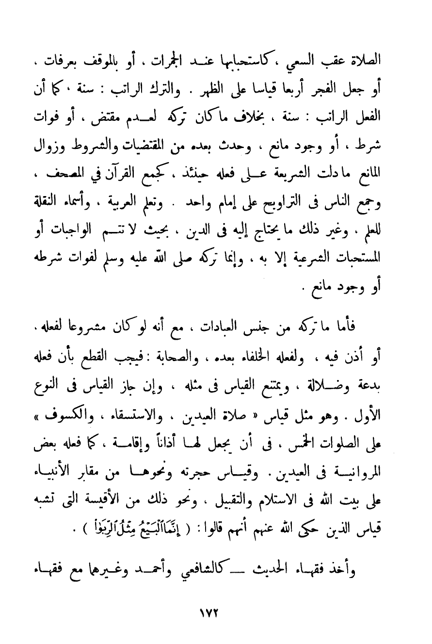 الصَّلَاةِ عَقِبَ السَّعْيِ كَاسْتِحْبَابِهَا عِنْدَ الْجَمَرَاتِ أَوْ بِالْمَوْقِفِ بِعَرَفَاتِ أَوْ جُعْلُ الْفَجْرِ أَرْبَعًا قِيَاسًا عَلَى الظُّهْر. وَالتَّرْكُ الرَّاتِبُ: سُنَّةٌ كَمَا أَنَّ الْفِعْلَ الرَّاتِبَ: سُنَّةٌ بِخِلَافِ مَا كَانَ تَرْكُهُ لِعَدَمِ مُقْتَضٍ أَوْ فَوَاتِ شَرْطٍ أَوْ وُجُودِ مَانِعٍ وَحَدَثَ بَعْدَهُ مِنْ الْمُقْتَضَيَاتِ وَالشُّرُوطِ وَزَوَالِ الْمَانِعِ مَا دَلَّتْ الشَّرِيعَةُ عَلَى فِعْلِهِ حِينَئِذٍ كَجَمْعِ الْقُرْآنِ فِي الْمُصْحَفِ وَجَمْعِ النَّاسِ فِي التَّرَاوِيحِ عَلَى إمَامٍ وَاحِدٍ. وَتَعَلُّمِ الْعَرَبِيَّةِ وَأَسْمَاءِ النَّقَلَةِ لِلْعِلْمِ وَغَيْرِ ذَلِكَ مِمَّا يُحْتَاجُ إلَيْهِ فِي الدِّينِ بِحَيْثُ لَا تَتِمُّ الْوَاجِبَاتُ أَوْ الْمُسْتَحَبَّاتُ الشَّرْعِيَّةُ إلَّا بِهِ وَإِنَّمَا تَرَكَهُ صَلَّى اللَّهُ عَلَيْهِ وَسَلَّمَ لِفَوَاتِ شَرْطِهِ أَوْ وُجُودِ مَانِعٍ. فَأَمَّا مَا تَرَكَهُ مِنْ جِنْسِ الْعِبَادَاتِ مَعَ أَنَّهُ لَوْ كَانَ مَشْرُوعًا لَفَعَلَهُ أَوْ أَذِنَ فِيهِ وَلَفَعَلَهُ الْخُلَفَاءُ بَعْدَهُ وَالصَّحَابَةُ: فَيَجِبُ الْقَطْعُ بِأَنَّ فِعْلَهُ بِدْعَةٌ وَضَلَالَةٌ وَيَمْتَنِعُ الْقِيَاسُ فِي مَثَلِهِ وَإِنْ جَازَ الْقِيَاسُ فِي النَّوْعِ الْأَوَّلِ. وَهُوَ مِثْلُ قِيَاسِ " صَلَاةِ الْعِيدَيْنِ وَالِاسْتِسْقَاءِ وَالْكُسُوفِ " عَلَى الصَّلَوَاتِ الْخَمْسِ فِي أَنْ يُجْعَلَ لَهَا أَذَانًا وَإِقَامَةً كَمَا فَعَلَهُ بَعْضُ المراونية فِي الْعِيدَيْنِ. وَقِيَاسِ حُجْرَتِهِ وَنَحْوِهَا مِنْ مَقَابِرِ الْأَنْبِيَاءِ عَلَى بَيْتِ اللَّهِ فِي الِاسْتِلَامِ وَالتَّقْبِيلِ وَنَحْوِ ذَلِكَ مِنْ الْأَقْيِسَةِ الَّتِي تُشْبِهُ قِيَاسَ الَّذِينَ حَكَى اللَّهُ عَنْهُمْ أَنَّهُمْ قَالُوا: {إنَّمَا الْبَيْعُ مِثْلُ الرِّبَا} .