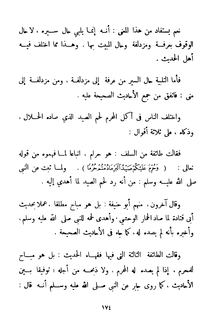 وَاخْتَلَفَ النَّاسُ فِي أَكْلِ الْمُحْرِمِ لَحْمَ الصَّيْدِ الَّذِي صَادَهُ الْحَلَالُ وَذَكَّاهُ عَلَى ثَلَاثَةِ أَقْوَالٍ: فَقَالَتْ طَائِفَةٌ مِنْ السَّلَفِ: هُوَ حَرَامٌ اتِّبَاعًا لِمَا فَهِمُوهُ مِنْ قَوْله تَعَالَى {وَحُرِّمَ عَلَيْكُمْ صَيْدُ الْبَرِّ مَا دُمْتُمْ حُرُمًا} . وَلِمَا ثَبَتَ {عَنْ النَّبِيِّ صَلَّى اللَّهُ عَلَيْهِ وَسَلَّمَ مِنْ أَنَّهُ رَدَّ لَحْمَ الصَّيْدِ لَمَّا أُهْدِيَ إلَيْهِ} . وَقَالَ آخَرُونَ مِنْهُمْ أَبُو حَنِيفَةَ: بَلْ هُوَ مُبَاحٌ مُطْلَقًا عَمَلًا بِحَدِيثِ {أبي قتادة لَمَّا صَادَ الْحِمَارَ الْوَحْشِيَّ وَأَهْدَى لَحْمَهُ لِلنَّبِيِّ صَلَّى اللَّهُ عَلَيْهِ وَسَلَّمَ وَأَخْبَرَهُ بِأَنَّهُ لَمْ يَصِدْهُ لَهُ} كَمَا جَاءَ فِي الْأَحَادِيثِ الصَّحِيحَةِ. وَقَالَتْ الطَّائِفَةُ الثَّالِثَةُ الَّتِي فِيهَا فُقَهَاءُ الْحَدِيثِ: بَلْ هُوَ مُبَاحٌ لِلْمُحْرِمِ إذَا لَمْ يَصِدْهُ لَهُ الْمُحْرِمُ وَلَا ذَبَحَهُ مِنْ أَجْلِهِ؛ تَوْفِيقًا بَيْنَ الْأَحَادِيثِ كَمَا رَوَى جَابِرٌ {عن النَّبِيِّ صَلَّى اللَّهُ عَلَيْهِ وَسَلَّمَ أَنَّهُ قَالَ:
