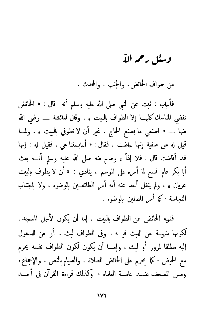 ثَبَتَ عَنْ النَّبِيِّ صَلَّى اللَّهُ عَلَيْهِ وَسَلَّمَ أَنَّهُ قَالَ: {الْحَائِضُ تَقْضِي الْمَنَاسِكَ كُلَّهَا إلَّا الطَّوَافَ بِالْبَيْتِ} . {وقال لِعَائِشَةَ - رَضِيَ اللَّهُ عَنْهَا - اصْنَعِي مَا يَصْنَعُ الْحَاجُّ غَيْرَ أَنْ لَا تَطُوفِي بِالْبَيْتِ} . وَلَمَّا {قِيلَ لَهُ عَنْ صَفِيَّةَ أَنَّهَا حَاضَتْ. فَقَالَ: أَحَابِسَتُنَا هِيَ فَقِيلَ لَهُ: إنَّهَا قَدْ أَفَاضَتْ قَالَ: فَلَا إذًا} وَصَحَّ {عنه صَلَّى اللَّهُ عَلَيْهِ وَسَلَّمَ أَنَّهُ بَعَثَ أَبَا بَكْرٍ عَامَ تِسْعٍ لَمَّا أَمَّرَهُ عَلَى الْمَوْسِمِ يُنَادِي: أَنْ لَا يَطُوفَ بِالْبَيْتِ عريان} وَلَمْ يَنْقُلْ أَحَدٌ عَنْهُ أَنَّهُ أَمَرَ الطَّائِفِينَ بِالْوُضُوءِ وَلَا بِاجْتِنَابِ النَّجَاسَةِ كَمَا أَمَرَ الْمُصَلِّينَ بِالْوُضُوءِ. فَنَهْيُهُ الْحَائِضَ عَنْ الطَّوَافِ بِالْبَيْتِ إمَّا أَنْ يَكُونَ لِأَجْلِ الْمَسْجِدِ لِكَوْنِهَا مَنْهِيَّةً عَنْ اللُّبْثِ فِيهِ وَفِي الطَّوَافِ لُبْثٌ أَوْ عَنْ الدُّخُولِ إلَيْهِ مُطْلَقًا لِمُرُورِ أَوْ لُبْثٍ وَإِمَّا أَنْ يَكُونَ لِكَوْنِ الطَّوَافِ نَفْسِهِ يَحْرُمُ مَعَ الْحَيْضِ كَمَا يَحْرُمُ عَلَى الْحَائِضِ الصَّلَاةُ وَالصِّيَامُ بِالنَّصِّ وَالْإِجْمَاعِ؛ وَمَسُّ الْمُصْحَفِ عِنْدَ عَامَّةِ الْعُلَمَاءِ وَكَذَلِكَ قِرَاءَةُ الْقُرْآنِ فِي أَحَدِ