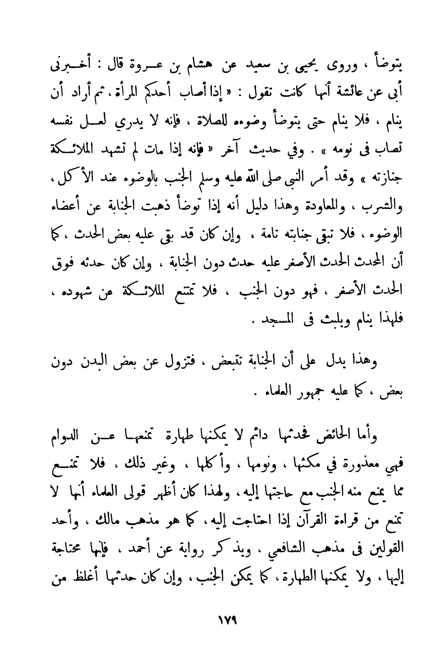 يَتَوَضَّأَ وَرَوَى يَحْيَى بْنُ سَعِيدٍ عَنْ هِشَامِ بْنِ عُرْوَةَ قَالَ: أَخْبَرَنِي أَبِي {عَنْ عَائِشَةَ أَنَّهَا كَانَتْ تَقُولُ: إذَا أَصَابَ أَحَدُكُمْ الْمَرْأَةَ ثُمَّ أَرَادَ أَنْ يَنَامَ فَلَا يَنَامُ حَتَّى يَتَوَضَّأَ وُضُوءَهُ لِلصَّلَاةِ فَإِنَّهُ لَا يَدْرِي لَعَلَّ نَفْسَهُ تُصَابُ فِي نَوْمِهِ. وَفِي حَدِيثٍ آخَرَ فَإِنَّهُ إذَا مَاتَ لَمْ تَشْهَدْ الْمَلَائِكَةُ جِنَازَتَهُ} وَقَدْ أَمَرَ النَّبِيُّ صَلَّى اللَّهُ عَلَيْهِ وَسَلَّمَ الْجُنُبَ بِالْوُضُوءِ عِنْدَ الْأَكْلِ وَالشُّرْبِ وَالْمُعَاوَدَةِ وَهَذَا دَلِيلٌ أَنَّهُ إذَا تَوَضَّأَ ذَهَبَتْ الْجَنَابَةُ عَنْ أَعْضَاءِ الْوُضُوءِ فَلَا تَبْقَى جَنَابَتُهُ تَامَّةً وَإِنْ كَانَ قَدْ بَقِيَ عَلَيْهِ بَعْضُ الْحَدَثِ كَمَا أَنَّ الْمُحْدِثَ الْحَدَثِ الْأَصْغَرِ عَلَيْهِ حَدَثٌ دُونَ الْجَنَابَةِ وَإِنْ كَانَ حَدَثُهُ فَوْقَ الْحَدَثِ الْأَصْغَرِ فَهُوَ دُونُ الْجُنُبِ فَلَا تَمْتَنِعُ الْمَلَائِكَةُ عَنْ شُهُودِهِ فَلِهَذَا يَنَامُ وَيَلْبَثُ فِي الْمَسْجِدِ. وَهَذَا يَدُلُّ عَلَى أَنَّ الْجَنَابَةَ تَتَبَعَّضُ فَتَزُولُ عَنْ بَعْضِ الْبَدَنِ دُونَ بَعْضٍ كَمَا عَلَيْهِ جُمْهُورُ الْعُلَمَاءِ. وَأَمَّا الْحَائِضُ فَحَدَثُهَا دَائِمٌ لَا يُمْكِنُهَا طَهَارَةٌ تَمْنَعُهَا عَنْ الدَّوَامِ فَهِيَ مَعْذُورَةٌ فِي مُكْثِهَا وَنَوْمِهَا وَأَكْلِهَا وَغَيْرِ ذَلِكَ فَلَا تُمْنَعُ مِمَّا يُمْنَعُ مِنْهُ الْجُنُبُ مَعَ حَاجَتِهَا إلَيْهِ وَلِهَذَا كَانَ أَظْهَرُ قَوْلَيْ الْعُلَمَاءِ أَنَّهَا لَا تُمْنَعُ مِنْ قِرَاءَةِ الْقُرْآنِ إذَا احْتَاجَتْ إلَيْهِ كَمَا هُوَ مَذْهَبُ مَالِكٍ وَأَحَدُ الْقَوْلَيْنِ فِي مَذْهَبِ الشَّافِعِيِّ وَيَذْكُرُ رِوَايَةً عَنْ أَحْمَد فَإِنَّهَا مُحْتَاجَةٌ إلَيْهَا وَلَا يُمْكِنُهَا الطَّهَارَةُ كَمَا يُمْكِنُ الْجُنُبَ وَإِنْ كَانَ حَدَثُهَا أَغْلَظَ مِنْ