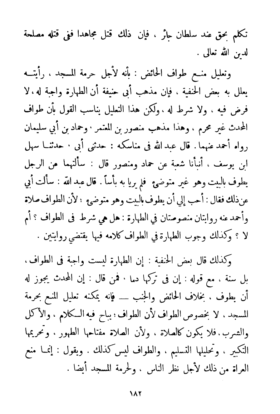 وَتَعْلِيلُ مَنْعِ طَوَافِ الْحَائِضِ: بِأَنَّهُ لِأَجْلِ حُرْمَةِ الْمَسْجِدِ رَأَيْته يُعَلِّلُ بِهِ بَعْضُ الْحَنَفِيَّةِ فَإِنَّ مَذْهَبَ أَبِي حَنِيفَةَ أَنَّ الطِّهَارَةَ وَاجِبَةٌ لَهُ لَا فَرْضَ فِيهِ وَلَا شَرْطَ لَهُ وَلَكِنَّ هَذَا التَّعْلِيلَ يُنَاسِبُ الْقَوْلَ بِأَنَّ طَوَافَ الْمُحْدِثِ غَيْرُ مُحَرَّمٍ وَهَذَا مَذْهَبُ مَنْصُورِ بْنِ الْمُعْتَمِرِ وَحَمَّادِ بْنِ أَبِي سُلَيْمَانَ رَوَاهُ أَحْمَد عَنْهُمَا. قَالَ عَبْدُ اللَّهِ فِي مَنَاسِكِهِ: حَدَّثَنِي أَبِي حَدَّثَنَا سَهْلُ بْنُ يُوسُفَ أَنْبَأَنَا شُعْبَةُ عَنْ حَمَّادٍ وَمَنْصُورٍ قَالَ: سَأَلْتهمَا عَنْ الرَّجُلِ يَطُوفُ بِالْبَيْتِ وَهُوَ غَيْرُ مُتَوَضِّئٍ فَلَمْ يَرَيَا بِهِ بَأْسًا. قَالَ عَبْدُ اللَّهِ: سَأَلْت أَبِي عَنْ ذَلِكَ فَقَالَ: أَحَبُّ إلَيَّ أَنْ يَطُوفَ بِالْبَيْتِ وَهُوَ مُتَوَضِّئٌ؛ لِأَنَّ الطَّوَافَ صَلَاةٌ وَأَحْمَد عَنْهُ رِوَايَتَانِ مَنْصُوصَتَانِ فِي الطَّهَارَةِ: هَلْ هِيَ شَرْطٌ فِي الطَّوَافِ؟ أَمْ لَا؟ وَكَذَلِكَ وُجُوبُ الطَّهَارَةِ فِي الطَّوَافِ كَلَامُهُ فِيهَا يَقْتَضِي رِوَايَتَيْنِ. وَكَذَلِكَ قَالَ بَعْضُ الْحَنَفِيَّةِ: إنَّ الطَّهَارَةَ لَيْسَتْ وَاجِبَةً فِي الطَّوَافِ بَلْ سَنَةٌ مَعَ قَوْلِهِ: إنَّ فِي تَرْكِهَا دَمًا فَمَنْ قَالَ: إنْ الْمُحْدِثَ يَجُوزُ لَهُ أَنْ يَطُوفَ بِخِلَافِ الْحَائِضِ وَالْجُنُبِ - فَإِنَّهُ يُمْكِنُهُ تَعْلِيلُ الْمَنْعِ بِحُرْمَةِ الْمَسْجِدِ لَا بِخُصُوصِ الطَّوَافِ لِأَنَّ الطَّوَافَ؛ يُبَاحُ فِيهِ الْكَلَامُ وَالْأَكْلُ وَالشُّرْبُ فَلَا يَكُونُ كَالصَّلَاةِ وَلِأَنَّ الصَّلَاةَ مِفْتَاحُهَا الطَّهُورُ وَتَحْرِيمُهَا التَّكْبِيرُ وَتَحْلِيلُهَا التَّسْلِيمُ وَالطَّوَافُ لَيْسَ كَذَلِكَ. وَيَقُولُ: إنَّمَا مُنِعَ الْعُرَاةُ مِنْ ذَلِكَ لِأَجْلِ نَظَرِ النَّاسِ وَلِحُرْمَةِ الْمَسْجِدِ أَيْضًا.