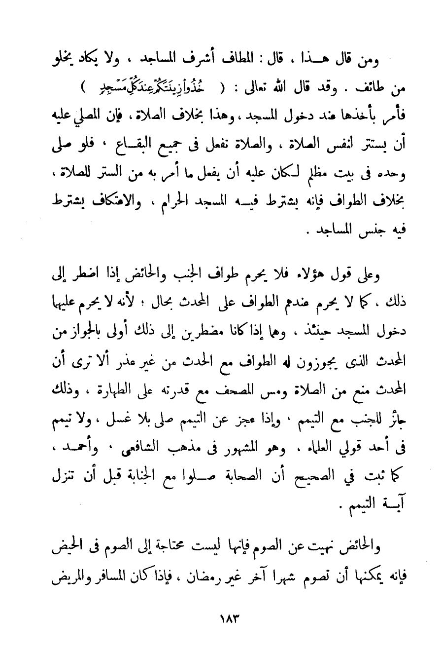وَمَنْ قَالَ هَذَا قَالَ: الْمَطَافُ أَشْرَفُ الْمَسَاجِدِ وَلَا يَكَادُ يَخْلُو مِنْ طَائِفٍ. وَقَدْ قَالَ اللَّهُ تَعَالَى: {خُذُوا زِينَتَكُمْ عِنْدَ كُلِّ مَسْجِدٍ} فَأَمَرَ بِأَخْذِهَا عِنْدَ دُخُولِ الْمَسْجِدِ وَهَذَا بِخِلَافِ الصَّلَاةِ فَإِنَّ الْمُصَلِّيَ عَلَيْهِ أَنْ يَسْتَتِرَ لِنَفْسِ الصَّلَاةِ وَالصَّلَاةُ تُفْعَلُ فِي جَمِيعِ الْبِقَاعِ فَلَوْ صَلَّى وَحْدَهُ فِي بَيْتٍ مُظْلِمٍ لَكَانَ عَلَيْهِ أَنْ يَفْعَلَ مَا أُمِرَ بِهِ مِنْ السَّتْرِ لِلصَّلَاةِ بِخِلَافِ الطَّوَافِ فَإِنَّهُ يُشْتَرَطُ فِيهِ الْمَسْجِدُ الْحَرَامُ وَالِاعْتِكَافُ يُشْتَرَطُ فِيهِ جِنْسُ الْمَسَاجِدِ. وَعَلَى قَوْلِ هَؤُلَاءِ فَلَا يَحْرُمُ طَوَافُ الْجُنُبِ وَالْحَائِضِ إذَا اُضْطُرَّ إلَى ذَلِكَ كَمَا لَا يَحْرُمُ عِنْدَهُمْ الطَّوَافُ عَلَى الْمُحْدِثِ بِحَالِ؛ لِأَنَّهُ لَا يَحْرُمُ عَلَيْهِمَا دُخُولُ الْمَسْجِدِ حِينَئِذٍ وَهُمَا إذَا كَانَا مُضْطَرَّيْنِ إلَى ذَلِكَ أَوْلَى بِالْجَوَازِ مِنْ الْمُحْدِثِ الَّذِي يُجَوِّزُونَ لَهُ الطَّوَافَ مَعَ الْحَدَثِ مِنْ غَيْرِ عُذْرٍ أَلَا تَرَى أَنَّ الْمُحْدِثَ مُنِعَ مِنْ الصَّلَاةِ وَمَسِّ الْمُصْحَفِ مَعَ قُدْرَتِهِ عَلَى الطِّهَارَةِ وَذَلِكَ جَائِزٌ لِلْجُنُبِ مَعَ التَّيَمُّمِ وَإِذَا عَجَزَ عَنْ التَّيَمُّمِ صَلَّى بِلَا غَسْلٍ وَلَا تَيَمُّمٍ فِي أَحَدِ قَوْلَيْ الْعُلَمَاءِ وَهُوَ الْمَشْهُورُ فِي مَذْهَبِ الشَّافِعِيِّ وَأَحْمَد كَمَا ثَبَتَ فِي الصَّحِيحِ أَنَّ الصَّحَابَةَ صَلَّوْا مَعَ الْجَنَابَةِ قَبْلَ أَنْ تَنْزِلَ آيَةُ التَّيَمُّمِ. وَالْحَائِضُ نُهِيَتْ عَنْ الصَّوْمِ فَإِنَّهَا لَيْسَتْ مُحْتَاجَةً إلَى الصَّوْمِ فِي الْحَيْضِ فَإِنَّهُ يُمْكِنُهَا أَنْ تَصُومَ شَهْرًا آخَرَ غَيْرَ رَمَضَانَ فَإِذَا كَانَ الْمُسَافِرُ وَالْمَرِيضُ
