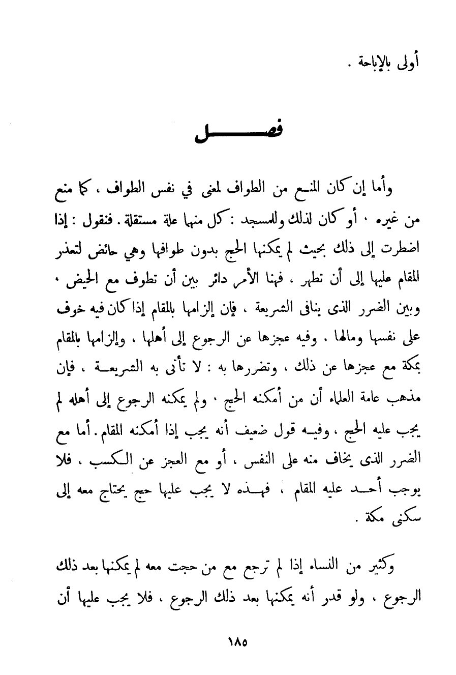 وَأَمَّا إنْ كَانَ الْمَنْعُ مِنْ الطَّوَافِ لِمَعْنَى فِي نَفْسِ الطَّوَافِ كَمَا مُنِعَ مِنْ غَيْرِهِ أَوْ كَانَ لِذَلِكَ وَلِلْمَسْجِدِ: كُلٌّ مِنْهُمَا عِلَّةٌ مُسْتَقِلَّةٌ. فَنَقُولُ: إذَا اُضْطُرَّتْ إلَى ذَلِكَ بِحَيْثُ لَمْ يُمْكِنْهَا الْحَجُّ بِدُونِ طَوَافِهَا وَهِيَ حَائِضٌ لِتَعَذُّرِ الْمُقَامِ عَلَيْهَا إلَى أَنْ تَطْهُرَ فَهُنَا الْأَمْرُ دَائِرٌ بَيْنَ أَنْ تَطُوفَ مَعَ الْحَيْضِ وَبَيْنَ الضَّرَرِ الَّذِي يُنَافِي الشَّرِيعَةَ فَإِنَّ إلْزَامَهَا بِالْمُقَامِ إذَا كَانَ فِيهِ خَوْفٌ عَلَى نَفْسِهَا وَمَالِهَا وَفِيهِ عَجْزُهَا عَنْ الرُّجُوعِ إلَى أَهْلِهَا وَإِلْزَامُهَا بِالْمُقَامِ بِمَكَّةَ مَعَ عَجْزِهَا عَنْ ذَلِكَ وَتَضَرُّرِهَا بِهِ: لَا تَأْتِي بِهِ الشَّرِيعَةُ فَإِنَّ مَذْهَبَ عَامَّةِ الْعُلَمَاءِ أَنَّ مَنْ أَمْكَنَهُ الْحَجُّ وَلَمْ يُمْكِنْهُ الرُّجُوعُ إلَى أَهْلِهِ لَمْ يَجِبْ عَلَيْهِ الْحَجُّ وَفِيهِ قَوْلٌ ضَعِيفٌ أَنَّهُ يَجِبُ إذَا أَمْكَنَهُ الْمُقَامُ. أَمَّا مَعَ الضَّرَرِ الَّذِي يَخَافُ مِنْهُ عَلَى النَّفْسِ أَوْ مَعَ الْعَجْزِ عَنْ الْكَسْبِ فَلَا يُوجِبُ أَحَدٌ عَلَيْهِ الْمُقَامَ فَهَذِهِ لَا يَجِبُ عَلَيْهَا حَجٌّ يَحْتَاجُ مَعَهُ إلَى سُكْنَى مَكَّةَ. وَكَثِيرٌ مِنْ النِّسَاءِ إذَا لَمْ تَرْجِعْ مَعَ مَنْ حَجَّتْ مَعَهُ لَمْ يُمْكِنْهَا بَعْدَ ذَلِكَ الرُّجُوعُ وَلَوْ قُدِّرَ أَنَّهُ يُمْكِنُهَا بَعْدَ ذَلِكَ الرُّجُوعُ فَلَا يَجِبُ عَلَيْهَا أَنْ