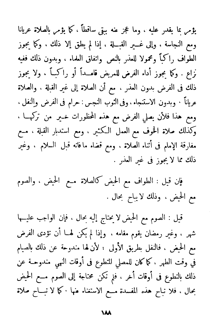 يُؤْمَرُ بِمَا يَقْدِرُ عَلَيْهِ وَمَا عَجَزَ عَنْهُ يَبْقَى سَاقِطًا كَمَا يُؤْمَرُ بِالصَّلَاةِ عريانا وَمَعَ النَّجَاسَةِ وَإِلَى غَيْرِ الْقِبْلَةِ إذَا لَمْ يُطِقْ إلَّا ذَلِكَ وَكَمَا يَجُوزُ الطَّوَافُ رَاكِبًا وَمَحْمُولًا لِلْعُذْرِ بِالنَّصِّ وَاتِّفَاقِ الْعُلَمَاءِ وَبِدُونِ ذَلِكَ فَفِيهِ نِزَاعٌ. وَكَمَا يَجُوزُ أَدَاءُ الْفَرْضِ لِلْمَرِيضِ قَاعِدًا أَوْ رَاكِبًا وَلَا يَجُوزُ ذَلِكَ فِي الْفَرْضِ بِدُونِ الْعُذْرِ مَعَ أَنَّ الصَّلَاةَ إلَى غَيْرِ الْقِبْلَةِ وَالصَّلَاةَ عريانا وَبِدُونِ الِاسْتِنْجَاءِ وَفِي الثَّوْبِ النَّجِسِ: حَرَامٌ فِي الْفَرْضِ وَالنَّفْلِ وَمَعَ هَذَا فَلَأَنْ يُصَلِّيَ الْفَرْضَ مَعَ هَذِهِ الْمَحْظُورَاتِ خَيْرٌ مِنْ تَرْكِهَا وَكَذَلِكَ صَلَاةُ الْخَوْفِ مَعَ الْعَمَلِ الْكَثِيرِ وَمَعَ اسْتِدْبَارِ الْقِبْلَةِ مَعَ مُفَارَقَةِ الْإِمَامِ فِي أَثْنَاءِ الصَّلَاةِ وَمَعَ قَضَاءِ مَا فَاتَهُ قَبْلَ السَّلَامِ وَغَيْرِ ذَلِكَ مِمَّا لَا يَجُوزُ فِي غَيْرِ الْعُذْرِ. فَإِنْ قِيلَ: الطَّوَافُ مَعَ الْحَيْضِ كَالصَّلَاةِ مَعَ الْحَيْضِ وَالصَّوْمِ مَعَ الْحَيْضِ وَذَلِكَ لَا يُبَاحُ بِحَالِ. قِيلَ: الصَّوْمُ مَعَ الْحَيْضِ لَا يُحْتَاجُ إلَيْهِ بِحَالِ فَإِنَّ الْوَاجِبَ عَلَيْهَا شَهْرٌ، وَغَيْرُ رَمَضَانَ يَقُومُ مَقَامَهُ وَإِذَا لَمْ يَكُنْ لَهَا أَنْ تُؤَدِّيَ الْفَرْضَ مَعَ الْحَيْضِ فَالنَّفْلُ بِطَرِيقِ الْأَوْلَى؛ لِأَنَّ لَهَا مَنْدُوحَةً عَنْ ذَلِكَ بِالصِّيَامِ فِي وَقْتِ الطُّهْرِ كَمَا كَانَ لِلْمُصَلِّي الْمُتَطَوِّعِ فِي أَوْقَاتِ النَّهْيِ مَنْدُوحَةٌ عَنْ ذَلِكَ بِالتَّطَوُّعِ فِي أَوْقَاتٍ أُخَرَ فَلَمْ تَكُنْ مُحْتَاجَةً إلَى الصَّوْمِ مَعَ الْحَيْضِ بِحَالِ فَلَا تُبَاحُ هَذِهِ الْمَفْسَدَةُ مَعَ الِاسْتِغْنَاءِ عَنْهَا. كَمَا لَا تُبَاحُ صَلَاةُ
