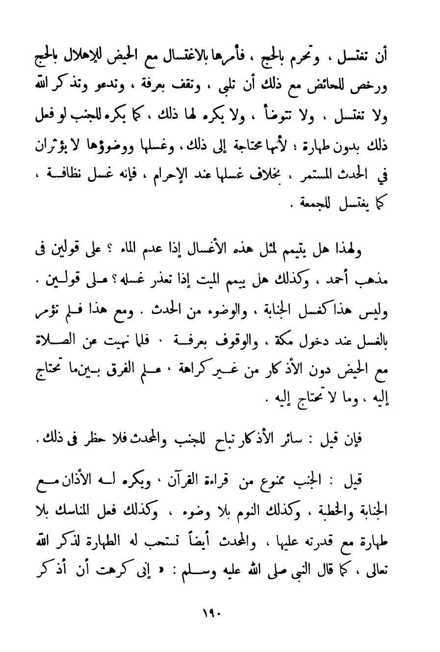 أَنْ تَغْتَسِلَ وَتُحْرِمَ بِالْحَجِّ فَأَمَرَهَا بِالِاغْتِسَالِ مَعَ الْحَيْضِ لِلْإِهْلَالِ بِالْحَجِّ وَرَخَّصَ لِلْحَائِضِ مَعَ ذَلِكَ أَنْ تُلَبِّيَ وَتَقِفَ بِعَرَفَةَ وَتَدْعُوَ وَتَذْكُرَ اللَّهَ وَلَا تَغْتَسِلَ وَلَا تَتَوَضَّأَ وَلَا يُكْرَهُ لَهَا ذَلِكَ كَمَا يُكْرَهُ لِلْجُنُبِ لَوْ فَعَلَ ذَلِكَ بِدُونِ طَهَارَةٍ؛ لِأَنَّهَا مُحْتَاجَةٌ إلَى ذَلِكَ وَغُسْلُهَا وَوُضُوءُهَا لَا يُؤَثِّرَانِ فِي الْحَدَثِ الْمُسْتَمِرِّ بِخِلَافِ غُسْلِهَا عِنْدَ الْإِحْرَامِ فَإِنَّهُ غُسْلُ نَظَافَةٍ كَمَا يُغْتَسَلُ لِلْجُمُعَةِ. وَلِهَذَا هَلْ يُتَيَمَّمُ لِمِثْلِ هَذِهِ الْأَغْسَالِ إذَا عُدِمَ الْمَاءُ؟ عَلَى قَوْلَيْنِ فِي مَذْهَبِ أَحْمَد وَكَذَلِكَ هَلْ يُيَمَّمُ الْمَيِّتُ إذَا تَعَذَّرَ غَسْلُهُ؟ عَلَى قَوْلَيْنِ. وَلَيْسَ هَذَا كَغَسْلِ الْجَنَابَةِ وَالْوُضُوءِ مِنْ الْحَدَثِ. وَمَعَ هَذَا فَلَمْ تُؤْمَرْ بِالْغَسْلِ عِنْدَ دُخُولِ مَكَّةَ وَالْوُقُوفِ بِعَرَفَةَ. فَلَمَّا نُهِيَتْ عَنْ الصَّلَاةِ مَعَ الْحَيْضِ دُونَ الْأَذْكَارِ مِنْ غَيْرِ كَرَاهَةٍ عُلِمَ الْفَرْقُ بَيْنَ مَا تَحْتَاجُ إلَيْهِ وَمَا لَا تَحْتَاجُ إلَيْهِ.