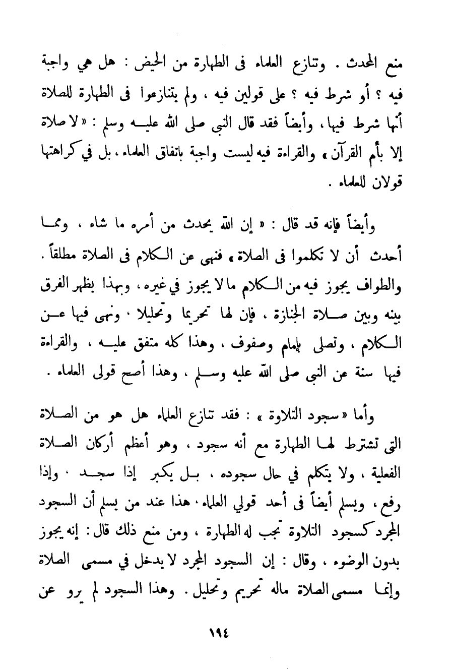 مَنْعَ الْمُحْدِثِ. وَتَنَازُعُ الْعُلَمَاءِ فِي الطَّهَارَةِ مِنْ الْحَيْضِ: هَلْ هِيَ وَاجِبَةٌ فِيهِ؟ أَوْ شَرْطٌ فِيهِ؟ عَلَى قَوْلَيْنِ فِيهِ وَلَمْ يَتَنَازَعُوا فِي الطَّهَارَةِ لِلصَّلَاةِ أَنَّهَا شَرْطٌ فِيهَا وَأَيْضًا فَقَدْ قَالَ النَّبِيُّ صَلَّى اللَّهُ عَلَيْهِ وَسَلَّمَ {لَا صَلَاةَ إلَّا بِأُمِّ الْقُرْآنِ} وَالْقِرَاءَةُ فِيهِ لَيْسَتْ وَاجِبَةً بِاتِّفَاقِ الْعُلَمَاءِ بَلْ فِي كَرَاهَتِهَا قَوْلَانِ لِلْعُلَمَاءِ. وَأَيْضًا فَإِنَّهُ قَدْ قَالَ: {إنَّ اللَّهَ يُحْدِثُ مَنْ أَمْرِهِ مَا شَاءَ وَمِمَّا أَحْدَثَ أَنْ لَا تَكَلَّمُوا فِي الصَّلَاةِ} فَنَهَى عَنْ الْكَلَامِ فِي الصَّلَاةِ مُطْلَقًا. وَالطَّوَافُ يَجُوزُ فِيهِ مِنْ الْكَلَامِ مَا لَا يَجُوزُ فِي غَيْرِهِ وَبِهَذَا يَظْهَرُ الْفَرْقُ بَيْنَهُ وَبَيْنَ صَلَاةِ الْجِنَازَةِ فَإِنَّ لَهَا تَحْرِيمًا وَتَحْلِيلًا وَنَهَى فِيهَا عَنْ الْكَلَامِ وَتُصَلَّى بِإِمَامِ وَصُفُوفٍ وَهَذَا كُلُّهُ مُتَّفَقٌ عَلَيْهِ وَالْقِرَاءَةُ فِيهَا سُنَّةٌ عَنْ النَّبِيِّ صَلَّى اللَّهُ عَلَيْهِ وَسَلَّمَ وَهَذَا أَصَحُّ قَوْلَيْ الْعُلَمَاءِ. وَأَمَّا " سُجُودُ التِّلَاوَةِ ": فَقَدْ تَنَازَعَ الْعُلَمَاءُ هَلْ هُوَ مِنْ الصَّلَاةِ الَّتِي تُشْتَرَطُ لَهَا الطَّهَارَةُ مَعَ أَنَّهُ سُجُودٌ وَهُوَ أَعْظَمُ أَرْكَانِ الصَّلَاةِ الْفِعْلِيَّةِ وَلَا يَتَكَلَّمُ فِي حَالِ سُجُودِهِ بَلْ يُكَبِّرُ إذَا سَجَدَ وَإِذَا رَفَعَ وَيُسَلِّمُ أَيْضًا فِي أَحَدِ قَوْلَيْ الْعُلَمَاءِ هَذَا عِنْدَ مَنْ يُسَلِّمُ أَنَّ السُّجُودَ الْمُجَرَّدَ كَسُجُودِ التِّلَاوَةِ تَجِبُ لَهُ الطَّهَارَةُ وَمَنْ مَنَعَ ذَلِكَ قَالَ: إنَّهُ يَجُوزُ بِدُونِ الْوُضُوءِ وَقَالَ: إنَّ السُّجُودَ الْمُجَرَّدَ لَا يَدْخُلُ فِي مُسَمَّى الصَّلَاةِ وَإِنَّمَا مُسَمَّى الصَّلَاةِ مَا لَهُ تَحْرِيمٌ وَتَحْلِيلٌ. وَهَذَا السُّجُودُ لَمْ يُرْوَ عَنْ