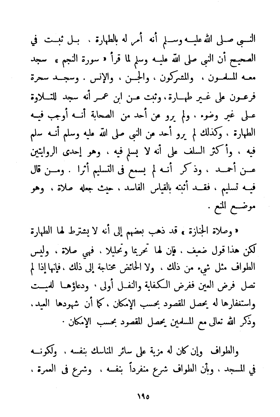 النَّبِيِّ صَلَّى اللَّهُ عَلَيْهِ وَسَلَّمَ أَنَّهُ أَمَرَ لَهُ بِالطَّهَارَةِ بَلْ ثَبَتَ فِي الصَّحِيحِ أَنَّ {النَّبِيَّ صَلَّى اللَّهُ عَلَيْهِ وَسَلَّمَ لَمَّا قَرَأَ سُورَةَ النَّجْمِ سَجَدَ مَعَهُ الْمُسْلِمُونَ وَالْمُشْرِكُونَ وَالْجِنُّ وَالْإِنْسُ. وَسَجَدَ سَحَرَةُ فِرْعَوْنَ عَلَى غَيْرِ طَهَارَةٍ} وَثَبَتَ عَنْ ابْنُ عُمَرَ أَنَّهُ سَجَدَ لِلتِّلَاوَةِ عَلَى غَيْرِ وُضُوءٍ وَلَمْ يُرْوَ عَنْ أَحَدٍ مِنْ الصَّحَابَةِ أَنَّهُ أَوْجَبَ فِيهِ الطَّهَارَةَ وَكَذَلِكَ لَمْ يَرْوِ أَحَدٌ عَنْ النَّبِيِّ صَلَّى اللَّهُ عَلَيْهِ وَسَلَّمَ أَنَّهُ سَلَّمَ فِيهِ وَأَكْثَرُ السَّلَفِ عَلَى أَنَّهُ لَا يُسَلَّمُ فِيهِ وَهُوَ إحْدَى الرِّوَايَتَيْنِ عَنْ أَحْمَد وَذَكَرَ أَنَّهُ لَمْ يَسْمَعْ فِي التَّسْلِيمِ أَثَرًا. وَمَنْ قَالَ فِيهِ تَسْلِيمٌ فَقَدْ أَثْبَتَهُ بِالْقِيَاسِ الْفَاسِدِ حَيْثُ جَعَلَهُ صَلَاةً وَهُوَ مَوْضِعُ الْمَنْعِ. " وَصَلَاةُ الْجِنَازَةِ " قَدْ ذَهَبَ بَعْضُهُمْ إلَى أَنَّهُ لَا يُشْتَرَطُ لَهَا الطَّهَارَةُ لَكِنْ هَذَا قَوْلٌ ضَعِيفٌ فَإِنَّ لَهَا تَحْرِيمًا وَتَحْلِيلًا فَهِيَ صَلَاةٌ وَلَيْسَ الطَّوَافُ مِثْلَ شَيْءٍ مِنْ ذَلِكَ وَلَا الْحَائِضُ مُحْتَاجَةٌ إلَى ذَلِكَ فَإِنَّهَا إذَا لَمْ تُصَلِّ فَرْضَ الْعَيْنِ فَفَرْضُ الْكِفَايَةِ وَالنَّفْلِ أَوْلَى وَدُعَاؤُهَا لِلْمَيِّتِ وَاسْتِغْفَارُهَا لَهُ يُحَصِّلُ الْمَقْصُودَ بِحَسَبِ الْإِمْكَانِ كَمَا أَنَّ شُهُودَهَا الْعِيدَ وَذِكْرَ اللَّهِ تَعَالَى مَعَ الْمُسْلِمِينَ يُحَصِّلُ الْمَقْصُودَ بِحَسَبِ الْإِمْكَانِ. وَالطَّوَافُ وَإِنْ كَانَ لَهُ مَزِيَّةٌ عَلَى سَائِرِ الْمَنَاسِكِ بِنَفْسِهِ وَلِكَوْنِهِ فِي الْمَسْجِدِ وَبِأَنَّ الطَّوَافَ شُرِعَ مُنْفَرِدًا بِنَفْسِهِ وَشُرِعَ فِي الْعُمْرَةِ