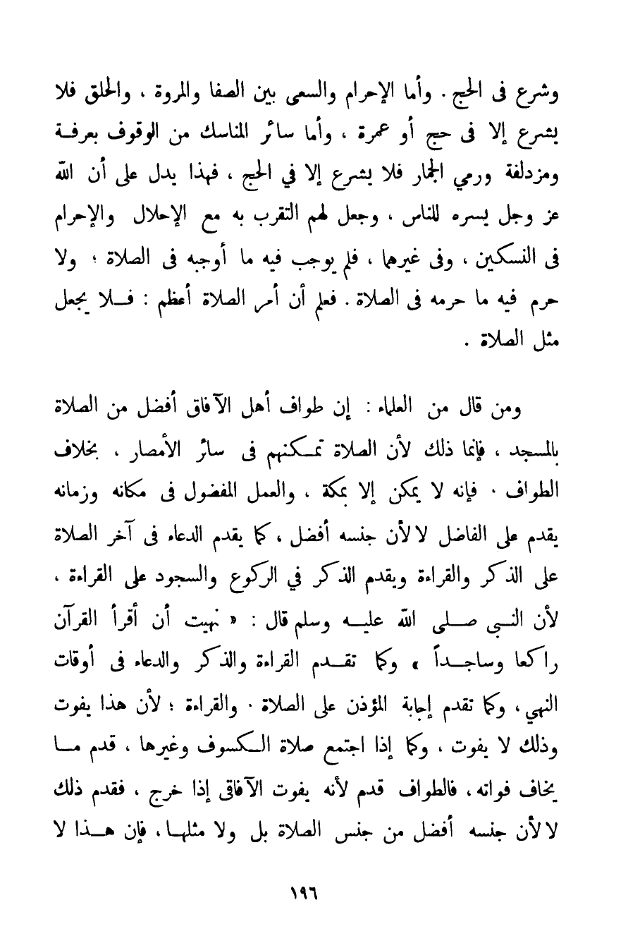 وَمَنْ قَالَ مِنْ الْعُلَمَاءِ: إنَّ طَوَافَ أَهْلِ الْآفَاقِ أَفْضَلُ مِنْ الصَّلَاةِ بِالْمَسْجِدِ فَإِنَّمَا ذَلِكَ لِأَنَّ الصَّلَاةَ تُمْكِنُهُمْ فِي سَائِرِ الْأَمْصَارِ بِخِلَافِ الطَّوَافِ فَإِنَّهُ لَا يُمْكِنُ إلَّا بِمَكَّةَ، وَالْعَمَلُ الْمَفْضُولُ فِي مَكَانِهِ وَزَمَانِهِ يُقَدَّمُ عَلَى الْفَاضِلِ لَا لِأَنَّ جِنْسَهُ أَفْضَلُ كَمَا يُقَدَّمُ الدُّعَاءُ فِي آخِرِ الصَّلَاةِ عَلَى الذِّكْرِ وَالْقِرَاءَةِ وَيُقَدَّمُ الذِّكْرُ فِي الرُّكُوعِ وَالسُّجُودِ عَلَى الْقِرَاءَةِ لِأَنَّ {النبي صَلَّى اللَّهُ عَلَيْهِ وَسَلَّمَ قَالَ: نُهِيت أَنْ أَقْرَأَ الْقُرْآنَ رَاكِعًا وَسَاجِدًا} وَكَمَا تُقَدَّمُ الْقِرَاءَةُ وَالذِّكْرُ وَالدُّعَاءُ فِي أَوْقَاتِ النَّهْيِ وَكَمَا تُقَدَّمُ إجَابَةُ الْمُؤَذِّنِ عَلَى الصَّلَاةِ وَالْقِرَاءَةِ؛ لِأَنَّ هَذَا يَفُوتُ وَذَلِكَ لَا يَفُوتُ وَكَمَا إذَا اجْتَمَعَ صَلَاةُ الْكُسُوفِ وَغَيْرُهَا قُدِّمَ مَا يُخَافُ فَوَاتُهُ فَالطَّوَافُ قُدِّمَ لِأَنَّهُ يَفُوتُ الْآفَاقِيَّ إذَا خَرَجَ فَقُدِّمَ ذَلِكَ لَا لِأَنَّ جِنْسَهُ أَفْضَلُ مِنْ جِنْسِ الصَّلَاةِ بَلْ وَلَا مِثْلُهَا فَإِنَّ هَذَا لَا