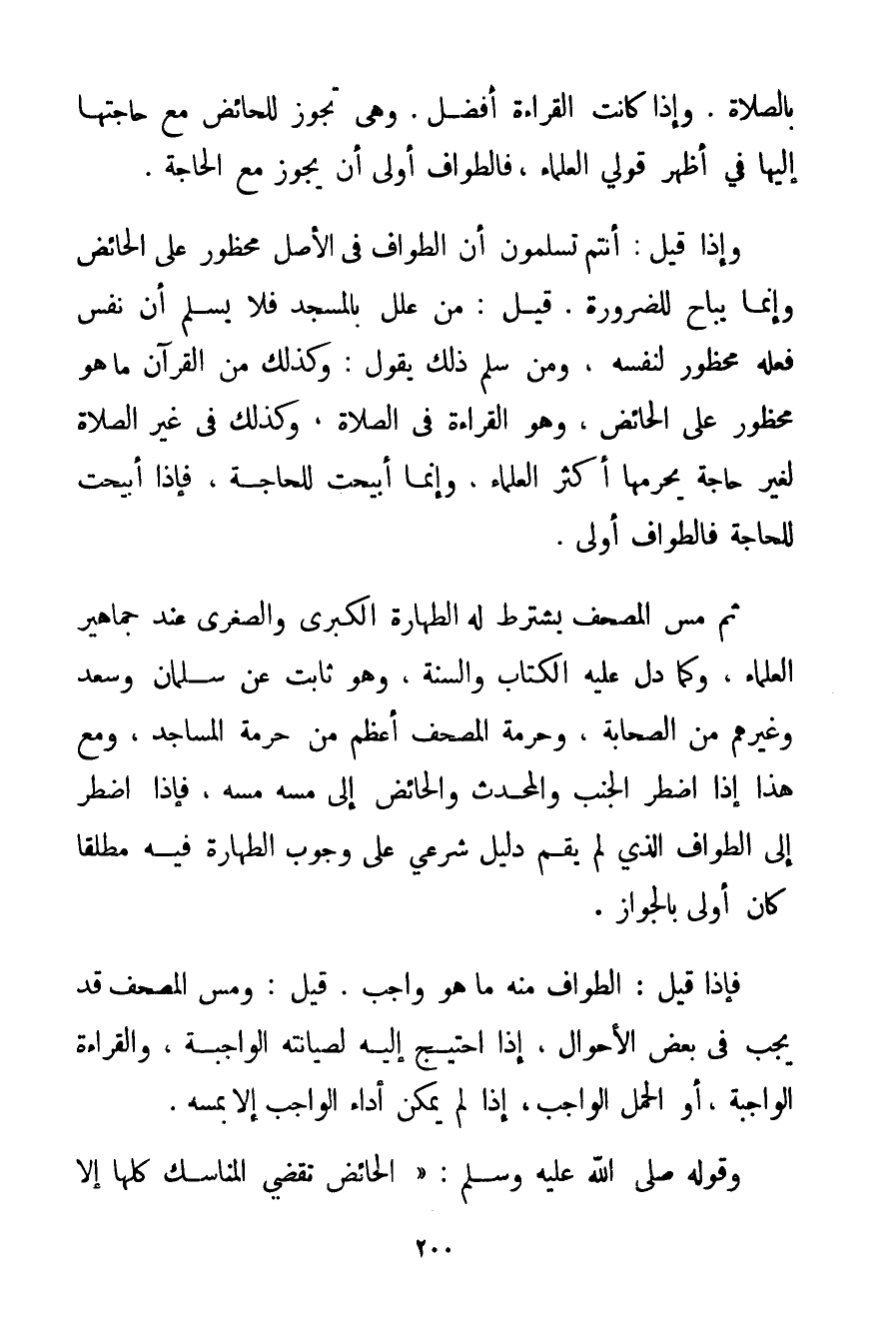 بِالصَّلَاةِ. وَإِذَا كَانَتْ الْقِرَاءَةُ أَفْضَلُ. وَهِيَ تَجُوزُ لِلْحَائِضِ مَعَ حَاجَتِهَا إلَيْهَا فِي أَظْهَرِ قَوْلَيْ الْعُلَمَاءِ فَالطَّوَافُ أَوْلَى أَنْ يَجُوزَ مَعَ الْحَاجَةِ. وَإِذَا قِيلَ: أَنْتُمْ تُسَلِّمُونَ أَنَّ الطَّوَافَ فِي الْأَصْلِ مَحْظُورٌ عَلَى الْحَائِضِ وَإِنَّمَا يُبَاحُ لِلضَّرُورَةِ. قِيلَ: مَنْ عَلَّلَ بِالْمَسْجِدِ فَلَا يُسَلِّمُ أَنَّ نَفْسَ فِعْلِهِ مَحْظُورٌ لِنَفَسِهِ وَمَنْ سَلَّمَ ذَلِكَ يَقُولُ: وَكَذَلِكَ مِنْ الْقُرْآنِ مَا هُوَ مَحْظُورٌ عَلَى الْحَائِضِ وَهُوَ الْقِرَاءَةُ فِي الصَّلَاةِ وَكَذَلِكَ فِي غَيْرِ الصَّلَاةِ لِغَيْرِ حَاجَةٍ يُحَرِّمُهَا أَكْثَرُ الْعُلَمَاءِ وَإِنَّمَا أُبِيحَتْ لِلْحَاجَةِ فَإِذَا أُبِيحَتْ لِلْحَاجَةِ فَالطَّوَافُ أَوْلَى. ثُمَّ مَسُّ الْمُصْحَفِ يُشْتَرَطُ لَهُ الطَّهَارَةُ الْكُبْرَى وَالصُّغْرَى عِنْدَ جَمَاهِيرِ الْعُلَمَاءِ وَكَمَا دَلَّ عَلَيْهِ الْكِتَابُ وَالسُّنَّةُ وَهُوَ ثَابِتٌ عَنْ سَلْمَانَ وَسَعْدٍ وَغَيْرِهِمْ مِنْ الصَّحَابَةِ، وَحُرْمَةُ الْمُصْحَفِ أَعْظَمُ مِنْ حُرْمَةِ الْمَسَاجِدِ وَمَعَ هَذَا إذَا اُضْطُرَّ الْجُنُبُ وَالْمُحْدِثُ وَالْحَائِضُ إلَى مَسِّهِ مَسَّهُ فَإِذَا اُضْطُرَّ إلَى الطَّوَافِ الَّذِي لَمْ يَقُمْ دَلِيلٌ شَرْعِيٌّ عَلَى وُجُوبِ الطَّهَارَةِ فِيهِ مُطْلَقًا كَانَ أَوْلَى بِالْجَوَازِ. فَإِذَا قِيلَ: الطَّوَافُ مِنْهُ مَا هُوَ وَاجِبٌ. قِيلَ: وَمَسُّ الْمُصْحَفِ قَدْ يَجِبُ فِي بَعْضِ الْأَحْوَالِ إذَا اُحْتِيجَ إلَيْهِ لِصِيَانَتِهِ الْوَاجِبَةِ وَالْقِرَاءَةِ الْوَاجِبَةِ أَوْ الْحَمْلِ الْوَاجِبِ إذَا لَمْ يُمْكِنْ أَدَاءُ الْوَاجِبِ إلَّا بِمَسِّهِ. وَقَوْلُهُ صَلَّى اللَّهُ عَلَيْهِ وَسَلَّمَ {الْحَائِضُ تَقْضِي الْمَنَاسِكَ كُلَّهَا