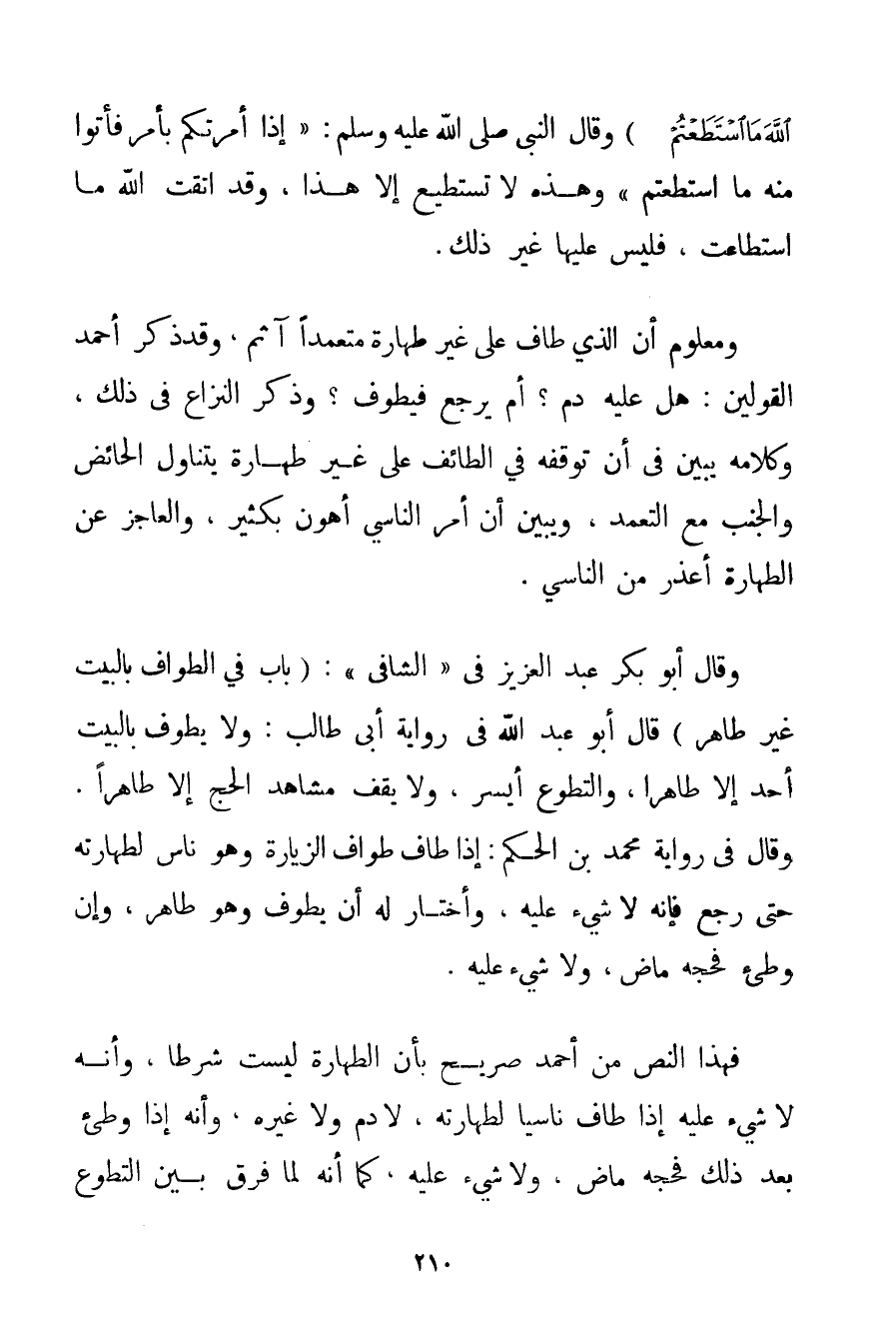 وَمَعْلُومٌ أَنَّ الَّذِي طَافَ عَلَى غَيْرِ طَهَارَةٍ مُتَعَمِّدًا آثِمٌ وَقَدْ ذَكَرَ أَحْمَد الْقَوْلَيْنِ: هَلْ عَلَيْهِ دَمٌ؟ أَمْ يَرْجِعُ فَيَطُوفُ؟ وَذِكْرُ النِّزَاعِ فِي ذَلِكَ وَكَلَامُهُ يُبَيِّنُ فِي أَنَّ تَوَقُّفَهُ فِي الطَّائِفِ عَلَى غَيْرِ طَهَارَةٍ يَتَنَاوَلُ الْحَائِضَ وَالْجُنُبَ مَعَ التَّعَمُّدِ وَيُبَيِّنُ أَنَّ أَمْرَ النَّاسِي أَهْوَنُ بِكَثِيرِ وَالْعَاجِزُ عَنْ الطَّهَارَةِ أعذر مِنْ النَّاسِي. وَقَالَ أَبُو بَكْرٍ عَبْدُ الْعَزِيزِ فِي " الشَّافِي ": (بَابٌ فِي الطَّوَافِ بِالْبَيْتِ غَيْرِ طَاهِرٍ قَالَ أَبُو عَبْدِ اللَّهِ فِي رِوَايَةِ أَبِي طَالِبٍ: وَلَا يَطُوفُ بِالْبَيْتِ أَحَدٌ إلَّا طَاهِرًا وَالتَّطَوُّعُ أَيْسَرُ وَلَا يَقِفُ مُشَاهِدَ الْحَجِّ إلَّا طَاهِرًا. وَقَالَ فِي رِوَايَةِ مُحَمَّدِ بْنِ الْحَكَمِ: إذَا طَافَ طَوَافَ الزِّيَارَةِ وَهُوَ نَاسٍ لِطَهَارَتِهِ حَتَّى رَجَعَ فَإِنَّهُ لَا شَيْءَ عَلَيْهِ وَاخْتَارَ لَهُ أَنْ يَطُوفَ وَهُوَ طَاهِرٌ وَإِنْ وَطِئَ فَحَجُّهُ مَاضٍ وَلَا شَيْءَ عَلَيْهِ. فَهَذَا النَّصُّ مِنْ أَحْمَد صَرِيحٌ بِأَنَّ الطَّهَارَةَ لَيْسَتْ شَرْطًا وَأَنَّهُ لَا شَيْءَ عَلَيْهِ إذَا طَافَ نَاسِيًا لِطَهَارَتِهِ لَا دَمَ وَلَا غَيْرَهُ وَأَنَّهُ إذَا وَطِئَ بَعْدَ ذَلِكَ فَحَجُّهُ مَاضٍ وَلَا شَيْءَ عَلَيْهِ كَمَا أَنَّهُ لَمَّا فَرَّقَ بَيْنَ التَّطَوُّعِ