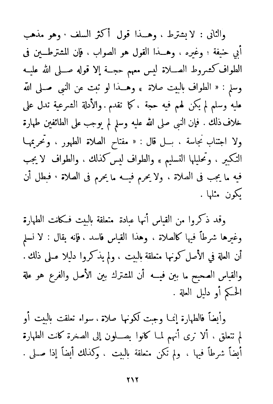 وَالثَّانِي: لَا يُشْتَرَطُ وَهَذَا قَوْلُ أَكْثَرِ السَّلَفِ وَهُوَ مَذْهَبُ أَبِي حَنِيفَةَ؛ وَغَيْرِهِ وَهَذَا الْقَوْلُ هُوَ الصَّوَابُ فَإِنَّ الْمُشْتَرِطِينَ فِي الطَّوَافِ كَشُرُوطِ الصَّلَاةِ لَيْسَ مَعَهُمْ حُجَّةٌ إلَّا قَوْلَهُ صَلَّى اللَّهُ عَلَيْهِ وَسَلَّمَ {الطَّوَافُ بِالْبَيْتِ صَلَاةٌ} وَهَذَا لَوْ ثَبَتَ عَنْ النَّبِيِّ صَلَّى اللَّهُ عَلَيْهِ وَسَلَّمَ لَمْ يَكُنْ لَهُمْ فِيهِ حُجَّةٌ كَمَا تَقَدَّمَ. وَالْأَدِلَّةُ الشَّرْعِيَّةُ تَدُلُّ عَلَى خِلَافِ ذَلِكَ. فَإِنَّ النَّبِيَّ صَلَّى اللَّهُ عَلَيْهِ وَسَلَّمَ لَمْ يُوجِبْ عَلَى الطَّائِفِينَ طَهَارَةً وَلَا اجْتِنَابَ نَجَاسَةٍ بَلْ قَالَ: {مِفْتَاحُ الصَّلَاةِ الطَّهُورُ وَتَحْرِيمُهَا التَّكْبِيرُ وَتَحْلِيلُهَا التَّسْلِيمُ} وَالطَّوَافُ لَيْسَ كَذَلِكَ وَالطَّوَافُ لَا يَجِبُ فِيهِ مَا يَجِبُ فِي الصَّلَاةِ وَلَا يَحْرُمُ فِيهِ مَا يَحْرُمُ فِي الصَّلَاةِ فَبَطَلَ أَنْ يَكُونَ مِثْلَهَا. وَقَدْ ذَكَرُوا مِنْ الْقِيَاسِ أَنَّهَا عِبَادَةٌ مُتَعَلِّقَةٌ بِالْبَيْتِ فَكَانَتْ الطَّهَارَةُ وَغَيْرُهَا شَرْطًا فِيهَا كَالصَّلَاةِ وَهَذَا الْقِيَاسُ فَاسِدٌ فَإِنَّهُ يُقَالُ: لَا نُسَلِّمُ أَنَّ الْعِلَّةَ فِي الْأَصْلِ كَوْنُهَا مُتَعَلِّقَةً بِالْبَيْتِ وَلَمْ يَذْكُرُوا دَلِيلًا عَلَى ذَلِكَ. وَالْقِيَاسُ الصَّحِيحُ مَا بَيَّنَ فِيهِ أَنَّ الْمُشْتَرَكَ بَيْنَ الْأَصْلِ وَالْفَرْعِ هُوَ عِلَّةُ الْحُكْمِ أَوْ دَلِيلُ الْعِلَّةِ. أَيْضًا فَالطَّهَارَةُ إنَّمَا وَجَبَتْ لِكَوْنِهَا صَلَاةً سَوَاءٌ تَعَلَّقَتْ بِالْبَيْتِ أَوْ لَمْ تَتَعَلَّقْ أَلَا تَرَى أَنَّهُمْ لَمَّا كَانُوا يُصَلُّونَ إلَى الصَّخْرَةِ كَانَتْ الطَّهَارَةُ أَيْضًا شَرْطًا فِيهَا وَلَمْ تَكُنْ مُتَعَلِّقَةً بِالْبَيْتِ وَكَذَلِكَ أَيْضًا إذَا صَلَّى.