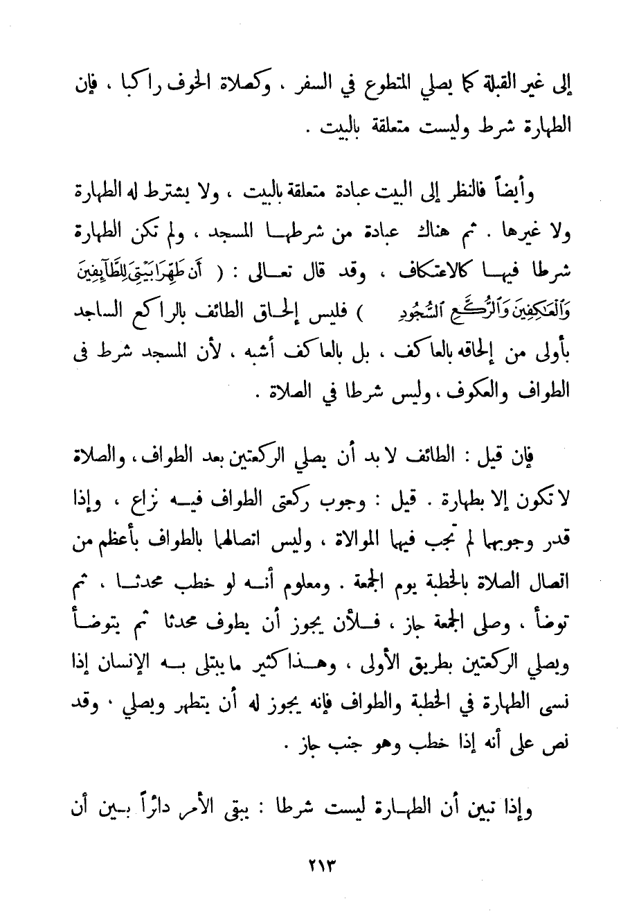 إلَى غَيْرِ الْقِبْلَةِ كَمَا يُصَلِّي الْمُتَطَوِّعُ فِي السَّفَرِ وَكَصَلَاةِ الْخَوْفِ رَاكِبًا فَإِنَّ الطَّهَارَةَ شَرْطٌ وَلَيْسَتْ مُتَعَلِّقَةً بِالْبَيْتِ. وَأَيْضًا فَالنَّظَرُ إلَى الْبَيْتِ عِبَادَةٌ مُتَعَلِّقَةٌ بِالْبَيْتِ وَلَا يُشْتَرَطُ لَهُ الطَّهَارَةُ وَلَا غَيْرُهَا. ثُمَّ هُنَاكَ عِبَادَةٌ مِنْ شَرْطِهَا الْمَسْجِدُ وَلَمْ تَكُنْ الطَّهَارَةُ شَرْطًا فِيهَا كَالِاعْتِكَافِ وَقَدْ قَالَ تَعَالَى: {أَنْ طَهِّرَا بَيْتِيَ لِلطَّائِفِينَ وَالْقَائِمِينَ وَالرُّكَّعِ السُّجُودِ} فَلَيْسَ إلْحَاقُ الطَّائِفِ بِالرَّاكِعِ السَّاجِدِ بِأَوْلَى مِنْ إلْحَاقِهِ بِالْعَاكِفِ بَلْ بِالْعَاكِفِ أَشْبَهُ لِأَنَّ الْمَسْجِدَ شَرْطٌ فِي الطَّوَافِ وَالْعُكُوفِ وَلَيْسَ شَرْطًا فِي الصَّلَاةِ. فَإِنْ قِيلَ: الطَّائِفُ لَا بُدَّ أَنْ يُصَلِّيَ الرَّكْعَتَيْنِ بَعْدَ الطَّوَافِ وَالصَّلَاةُ لَا تَكُونُ إلَّا بِطَهَارَةِ. قِيلَ: وُجُوبُ رَكْعَتَيْ الطَّوَافِ فِيهِ نِزَاعٌ وَإِذَا قُدِّرَ وُجُوبُهُمَا لَمْ تَجِبْ فِيهِمَا الْمُوَالَاةُ وَلَيْسَ اتِّصَالُهُمَا بِالطَّوَافِ بِأَعْظَمَ مِنْ اتِّصَالِ الصَّلَاةِ بِالْخُطْبَةِ يَوْمَ الْجُمُعَةِ. وَمَعْلُومٌ أَنَّهُ لَوْ خَطَبَ مُحْدِثًا ثُمَّ تَوَضَّأَ وَصَلَّى الْجُمُعَةَ جَازَ فَلَأَنْ يَجُوزَ أَنْ يَطُوفَ مُحْدِثًا ثُمَّ يَتَوَضَّأُ وَيُصَلِّي الرَّكْعَتَيْنِ بِطَرِيقِ الْأَوْلَى وَهَذَا كَثِيرٌ مَا يُبْتَلَى بِهِ الْإِنْسَانُ إذَا نَسِيَ الطَّهَارَةَ فِي الْخُطْبَةِ وَالطَّوَافِ فَإِنَّهُ يَجُوزُ لَهُ أَنْ يَتَطَهَّرَ وَيُصَلِّيَ وَقَدْ نَصَّ عَلَى أَنَّهُ إذَا خَطَبَ وَهُوَ جُنُبٌ جَازَ. وَإِذَا تَبَيَّنَ أَنَّ الطَّهَارَةَ لَيْسَتْ شَرْطًا: يَبْقَى الْأَمْرُ دَائِرًا بَيْنَ أَنْ