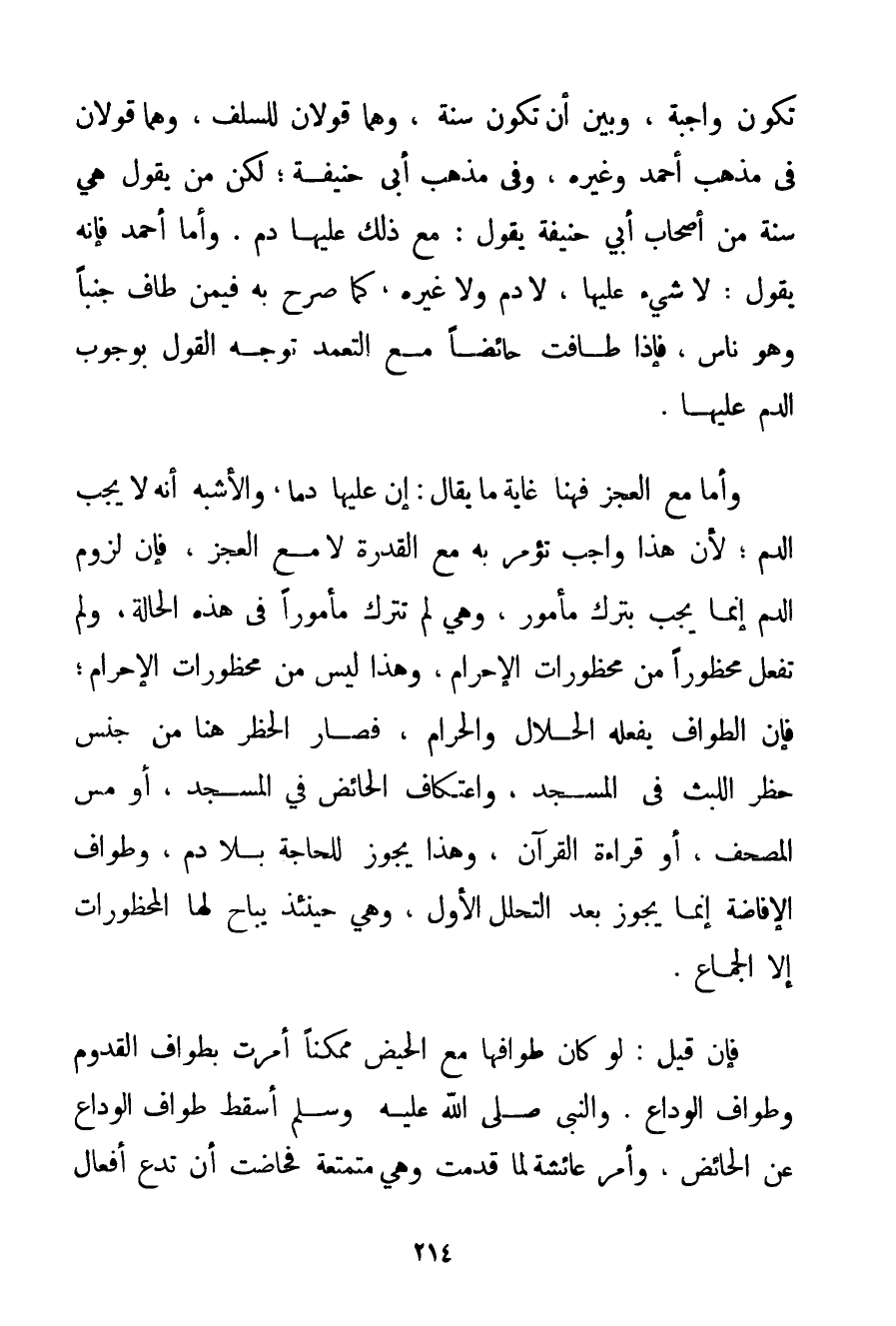 تَكُونَ وَاجِبَةً وَبَيْنَ أَنْ تَكُونَ سُنَّةً وَهُمَا قَوْلَانِ لِلسَّلَفِ وَهُمَا قَوْلَانِ فِي مَذْهَبِ أَحْمَد وَغَيْرِهِ. وَفِي مَذْهَبِ أَبِي حَنِيفَةَ؛ لَكِنْ مَنْ يَقُولُ هِيَ سُنَّةٌ مِنْ أَصْحَابِ أَبِي حَنِيفَةَ يَقُولُ: مَعَ ذَلِكَ عَلَيْهَا دَمٌ. وَأَمَّا أَحْمَد فَإِنَّهُ يَقُولُ: لَا شَيْءَ عَلَيْهَا لَا دَمَ وَلَا غَيْرَهُ كَمَا صَرَّحَ بِهِ فِيمَنْ طَافَ جُنُبًا وَهُوَ نَاسٍ فَإِذَا طَافَتْ حَائِضًا مَعَ التَّعَمُّدِ تَوَجَّهَ الْقَوْلُ بِوُجُوبِ الدَّمِ عَلَيْهَا. وَأَمَّا مَعَ الْعَجْزِ فَهُنَا غَايَةُ مَا يُقَالُ: إنَّ عَلَيْهَا دَمًا وَالْأَشْبَهُ أَنَّهُ لَا يَجِبُ الدَّمُ؛ لِأَنَّ هَذَا وَاجِبٌ تُؤْمَرُ بِهِ مَعَ الْقُدْرَةِ لَا مَعَ الْعَجْزِ فَإِنَّ لُزُومَ الدَّمِ إنَّمَا يَجِبُ بِتَرْكِ مَأْمُورٍ وَهِيَ لَمْ تَتْرُكْ مَأْمُورًا فِي هَذِهِ الْحَالَةِ وَلَمْ تَفْعَلْ مَحْظُورًا مِنْ مَحْظُورَاتِ الْإِحْرَامِ وَهَذَا لَيْسَ مِنْ مَحْظُورَاتِ الْإِحْرَامِ؛ فَإِنَّ الطَّوَافَ يَفْعَلُهُ الْحَلَالُ وَالْحَرَامُ فَصَارَ الْحَظْرُ هُنَا مِنْ جِنْسِ حَظْرِ اللُّبْثِ فِي الْمَسْجِدِ وَاعْتِكَافِ الْحَائِضِ فِي الْمَسْجِدِ أَوْ مَسِّ الْمُصْحَفِ أَوْ قِرَاءَةِ الْقُرْآنِ وَهَذَا يَجُوزُ لِلْحَاجَةِ بِلَا دَمٍ، وَطَوَافُ الْإِفَاضَةِ إنَّمَا يَجُوزُ بَعْدَ التَّحَلُّلِ الْأَوَّلِ وَهِيَ حِينَئِذٍ يُبَاحُ لَهَا الْمَحْظُورَاتُ إلَّا الْجِمَاعَ. فَإِنْ قِيلَ: لَوْ كَانَ طَوَافُهَا مَعَ الْحَيْضِ مُمْكِنًا أُمِرَتْ بِطَوَافِ الْقُدُومِ وَطَوَافِ الْوَدَاعِ. وَالنَّبِيُّ صَلَّى اللَّهُ عَلَيْهِ وَسَلَّمَ أَسْقَطَ طَوَافَ الْوَدَاعِ عَنْ الْحَائِضِ وَأَمَرَ عَائِشَةَ لَمَّا قَدِمَتْ وَهِيَ مُتَمَتِّعَةٌ فَحَاضَتْ أَنْ تَدَعَ أَفْعَالَ