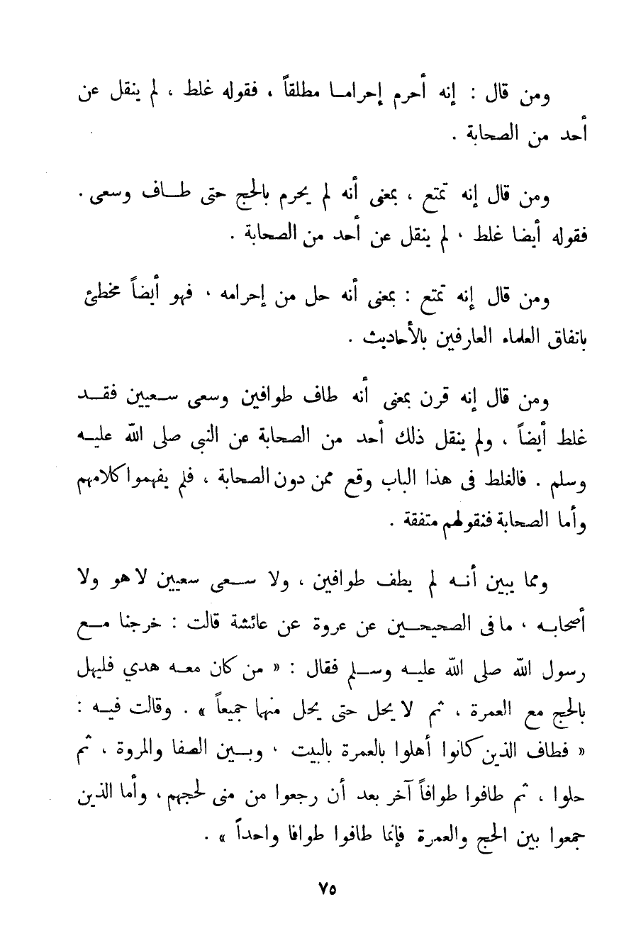 وَمَنْ قَالَ: إنَّهُ أَحْرَمَ إحْرَامًا مُطْلَقًا فَقَوْلُهُ غَلَطٌ لَمْ يُنْقَلْ عَنْ أَحَدٍ مِنْ الصَّحَابَةِ. وَمَنْ قَالَ إنَّهُ تَمَتَّعَ بِمَعْنَى أَنَّهُ لَمْ يُحْرِمْ بِالْحَجِّ حَتَّى طَافَ وَسَعَى. فَقَوْلُهُ أَيْضًا غَلَطٌ لَمْ يُنْقَلْ عَنْ أَحَدٍ مِنْ الصَّحَابَةِ. وَمَنْ قَالَ إنَّهُ تَمَتَّعَ: بِمَعْنَى أَنَّهُ حَلَّ مِنْ إحْرَامِهِ فَهُوَ أَيْضًا مُخْطِئٌ بِاتِّفَاقِ الْعُلَمَاءِ الْعَارِفِينَ بِالْأَحَادِيثِ. وَمَنْ قَالَ إنَّهُ قَرَنَ بِمَعْنَى أَنَّهُ طَافَ طَوَافَيْنِ وَسَعَى سعيين فَقَدْ غَلِطَ أَيْضًا وَلَمْ يَنْقُلْ ذَلِكَ أَحَدٌ مِنْ الصَّحَابَةِ عَنْ النَّبِيِّ صَلَّى اللَّهُ عَلَيْهِ وَسَلَّمَ. فَالْغَلَطُ فِي هَذَا الْبَابِ وَقَعَ مِمَّنْ دُونَ الصَّحَابَةِ فَلَمْ يَفْهَمُوا كَلَامَهُمْ وَأَمَّا الصَّحَابَةُ فَنُقُولُهُمْ مُتَّفِقَةٌ. وَمِمَّا يُبَيِّنُ أَنَّهُ لَمْ يَطُفْ طَوَافَيْنِ وَلَا سَعَى سعيين لَا هُوَ وَلَا أَصْحَابُهُ مَا فِي الصَّحِيحَيْنِ عَنْ عُرْوَةَ {عن عَائِشَةَ قَالَتْ: خَرَجْنَا مَعَ رَسُولِ اللَّهِ صَلَّى اللَّهُ عَلَيْهِ وَسَلَّمَ فَقَالَ: مَنْ كَانَ مَعَهُ هَدْيٌ فليهل بِالْحَجِّ مَعَ الْعُمْرَةِ ثُمَّ لَا يَحِلُّ حَتَّى يَحِلَّ مِنْهُمَا جَمِيعًا. وَقَالَتْ فِيهِ: فَطَافَ الَّذِينَ كَانُوا أَهَلُّوا بِالْعُمْرَةِ بِالْبَيْتِ وَبَيْنَ الصَّفَا وَالْمَرْوَةِ ثُمَّ حَلُّوا ثُمَّ طَافُوا طَوَافًا آخَرَ بَعْدَ أَنْ رَجَعُوا مِنْ مِنَى لِحَجِّهِمْ وَأَمَّا الَّذِينَ جَمَعُوا بَيْنَ الْحَجِّ وَالْعُمْرَةِ فَإِنَّمَا طَافُوا طَوَافًا وَاحِدًا} .
