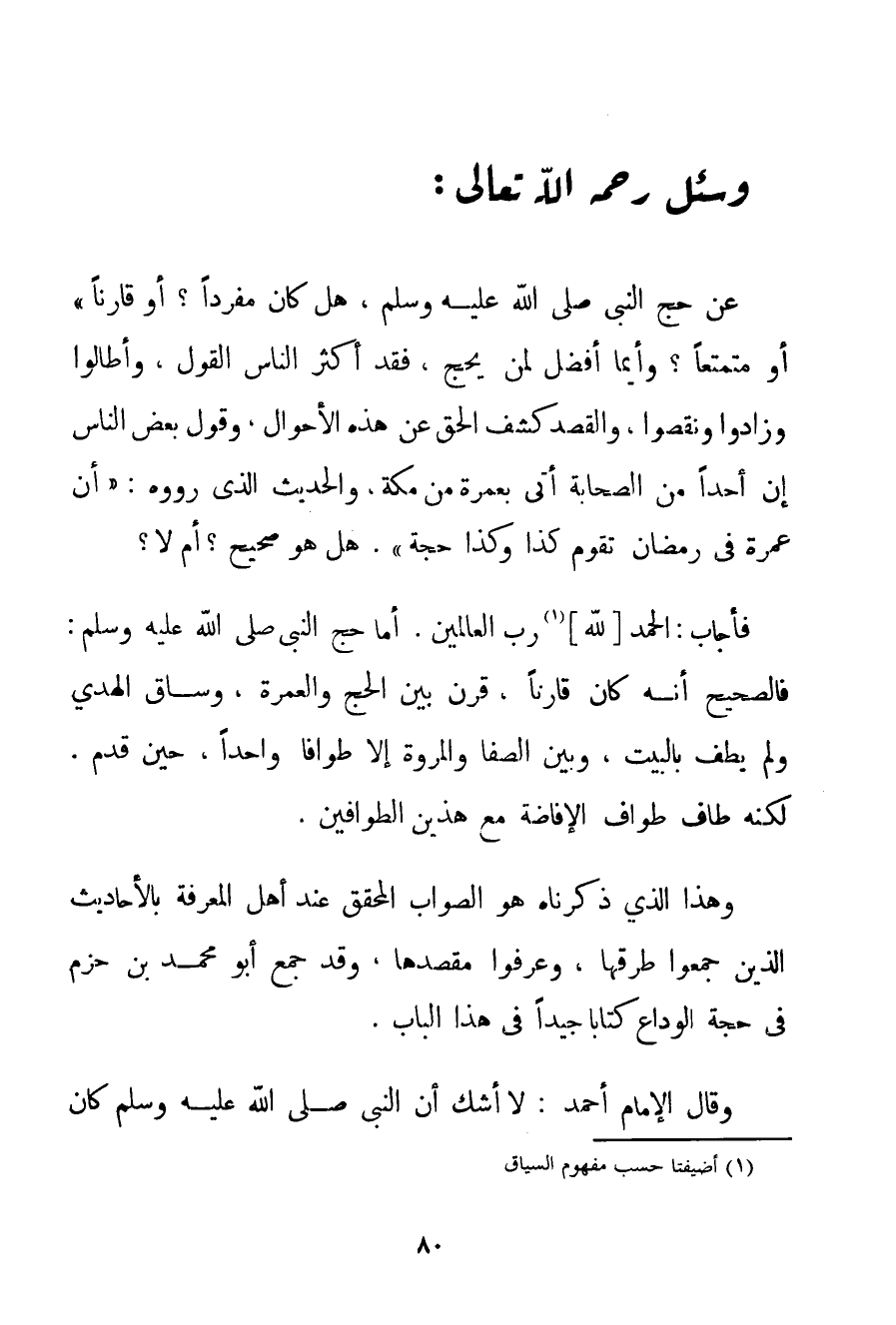 عَنْ حَجِّ النَّبِيِّ صَلَّى اللَّهُ عَلَيْهِ وَسَلَّمَ هَلْ كَانَ مُفْرِدًا؟ أَوْ قَارِنًا " أَوْ مُتَمَتِّعًا؟ وَأَيُّمَا أَفْضَلُ لِمَنْ يَحُجُّ فَقَدْ أَكْثَرَ النَّاسُ الْقَوْلَ وَأَطَالُوا وَزَادُوا وَنَقَصُوا، وَالْقَصْدُ كَشْفُ الْحَقِّ عَنْ هَذِهِ الْأَحْوَالِ، وَقَوْلُ بَعْضِ النَّاسِ إنَّ أَحَدًا مِنْ الصَّحَابَةِ أَتَى بِعُمْرَةِ مِنْ مَكَّةَ، وَالْحَدِيثُ الَّذِي رَوَوْهُ: {أَنَّ عُمْرَةً فِي رَمَضَانَ تَقُومُ كَذَا وَكَذَا حَجَّةٍ} . هَلْ هُوَ صَحِيحٌ؟ أَمْ لَا؟